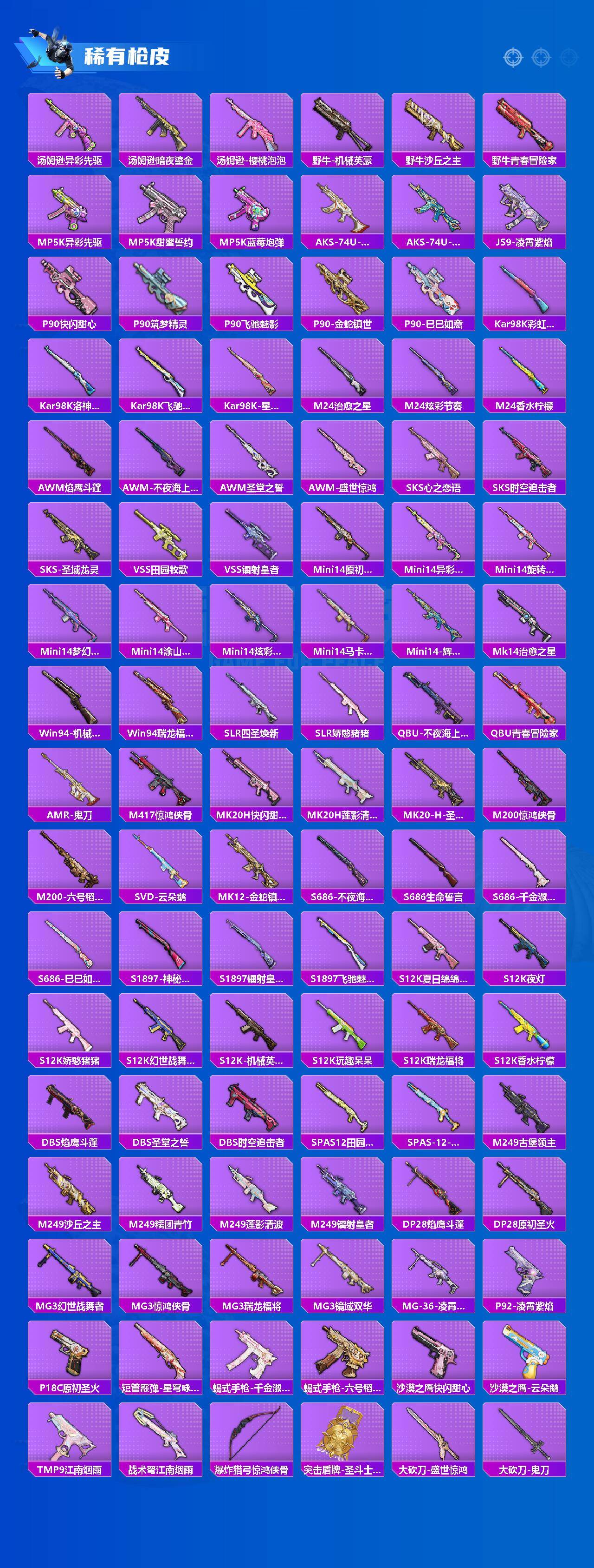 【粉色枪皮】:AKM-炫紫旋律,AKM-魔法神域,SCAR-L-金蛇镇世,M416-墨龙九天,GROZA-香水柠檬,M762-甜蜜誓约,UMP45-宇宙意志,P90-沙丘之主,Kar98K-巳巳如意,Kar98K-圣域龙灵,Mk14-盛世惊鸿,DP-28-圣堂之誓,DP-28-千金淑猫,DP-28-豹影疾电,MG3-辉羽雀灵,PKM-江南烟雨,平底锅-林间仙鹿