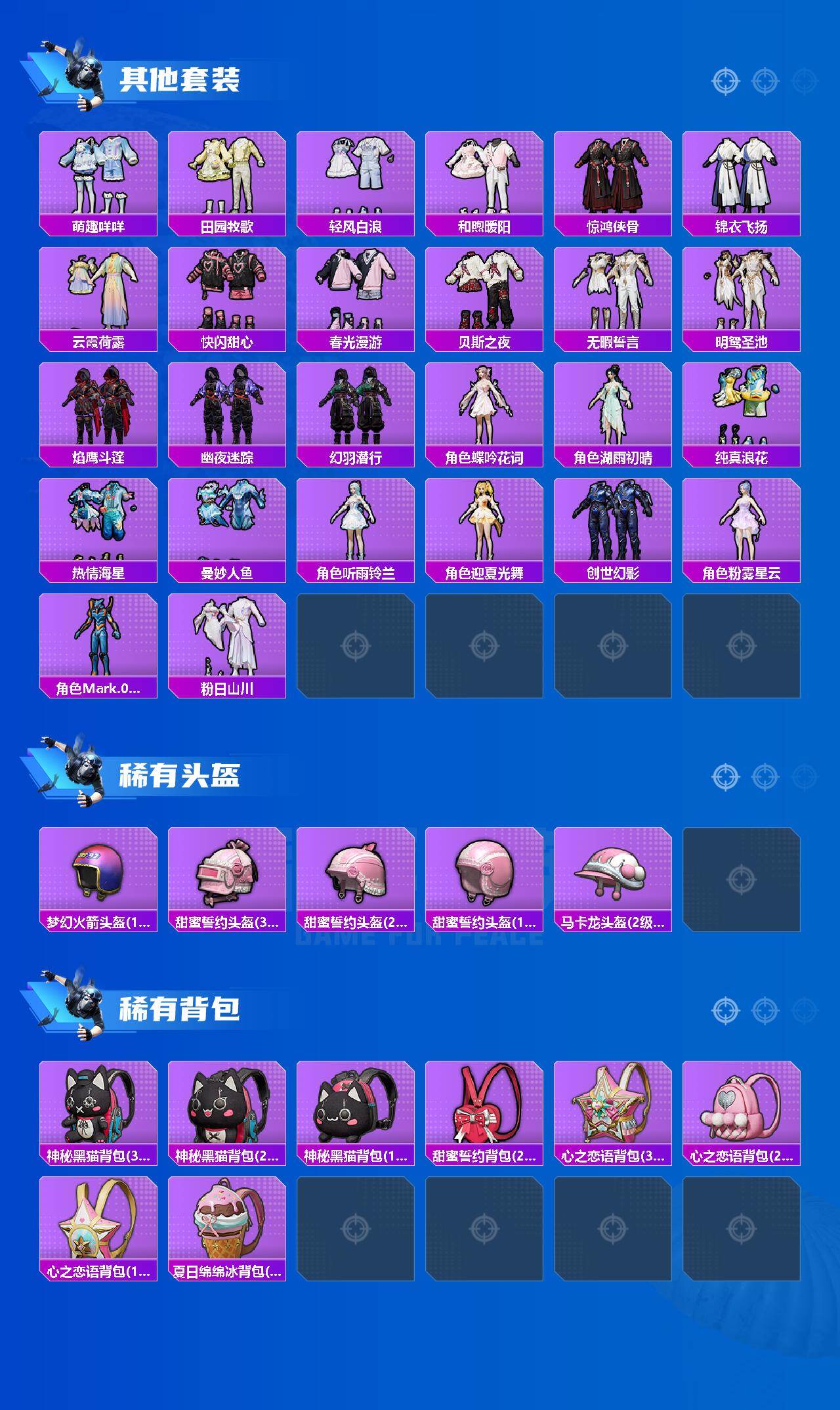 【粉色降落伞】:神秘黑猫降落伞,甜蜜誓约降落伞,四圣焕新降落伞,香水柠檬降落伞,林间仙鹿降落伞,洛神天依降落伞,筑梦精灵降落伞,圣堂之誓降落伞,沙丘之主降落伞,绝色倾城降