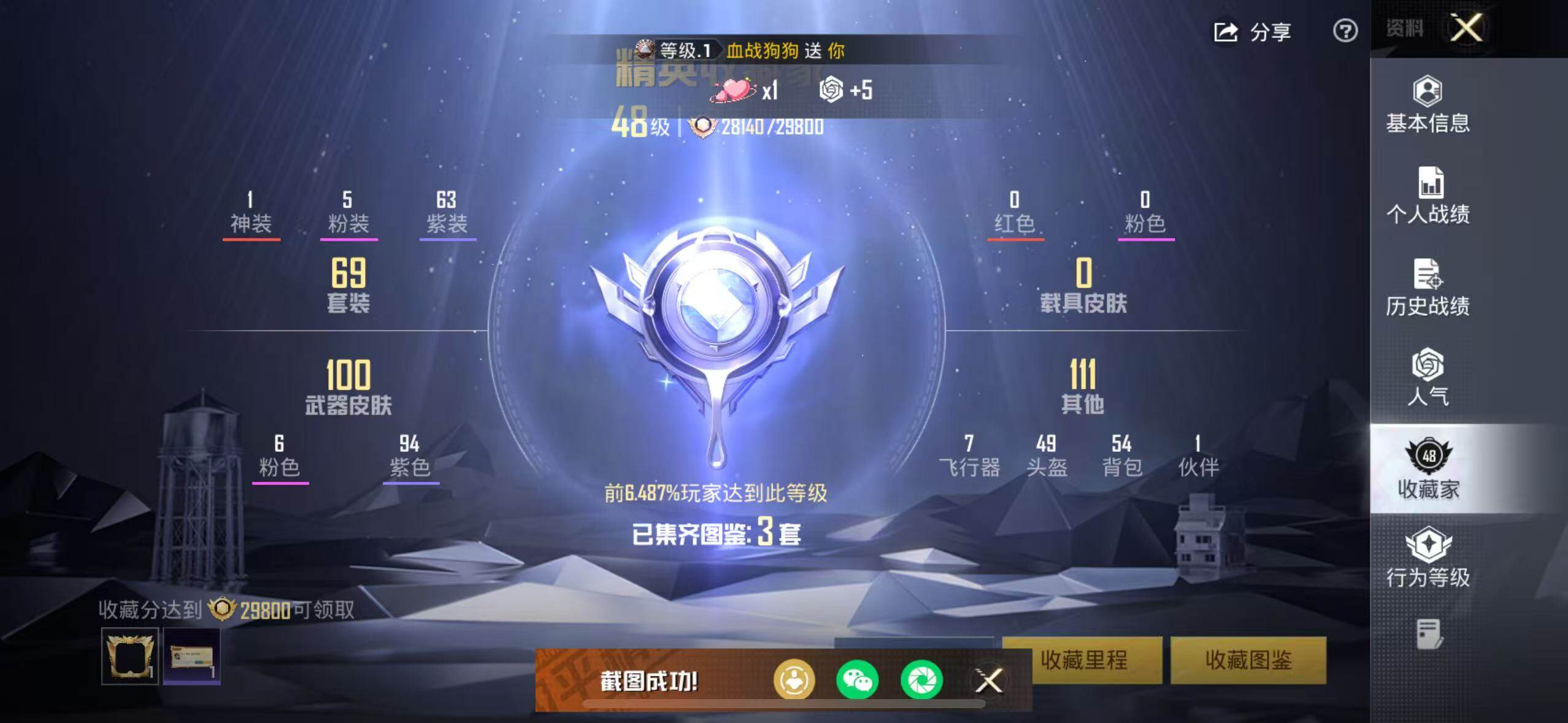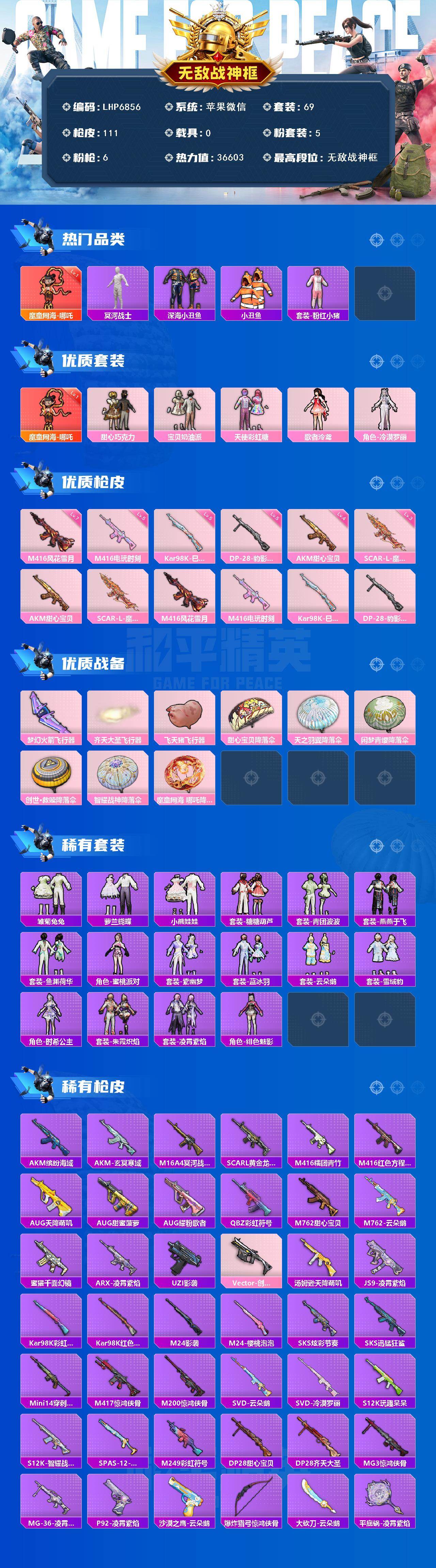 [15615788]【特价出售/店主推荐】苹果 微信-无敌战神框-1神装-5粉装-6特效枪-0载具-4粉色飞行器-36603热力值-11王牌印记-69套装-111枪皮