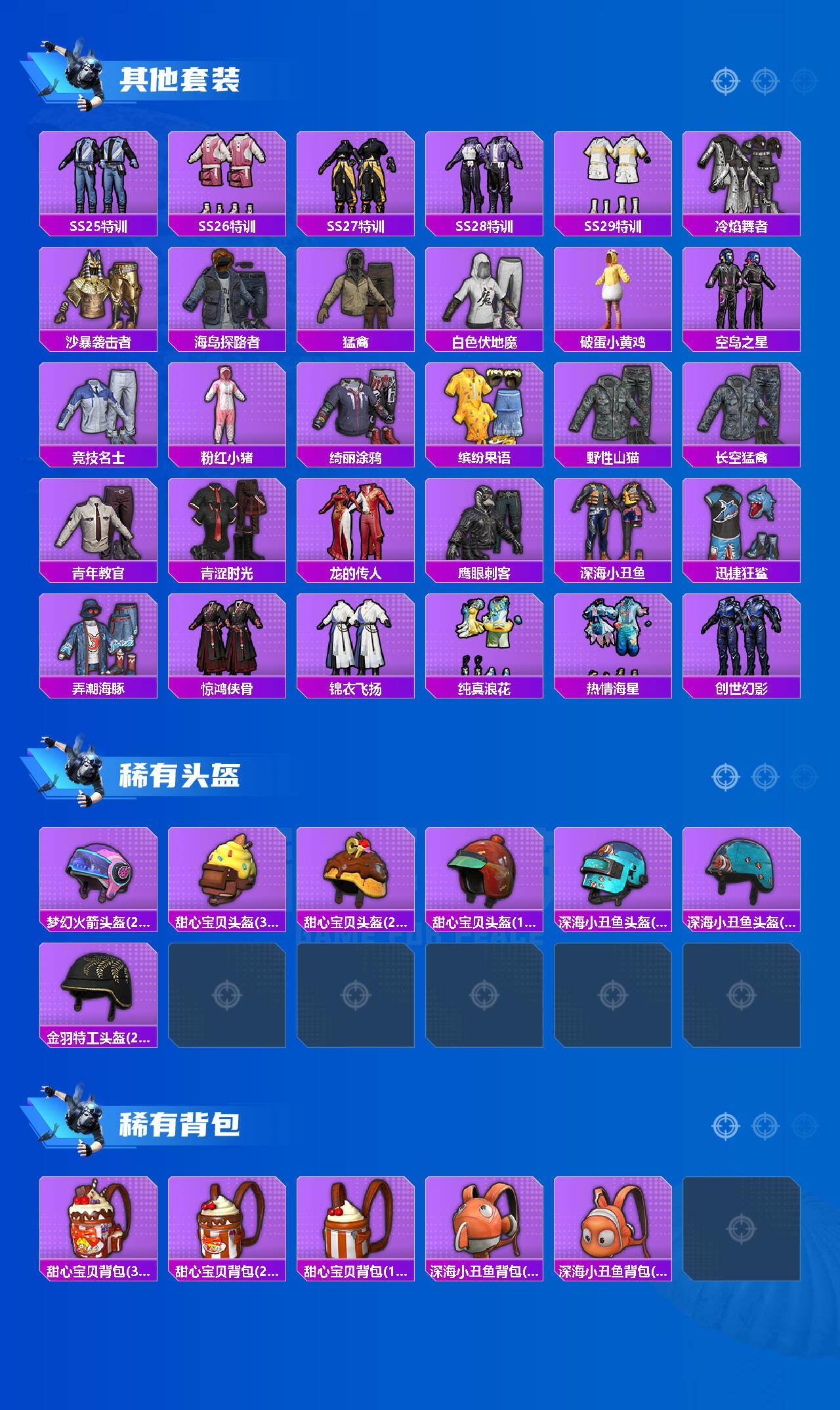 - [11875158]10粉装 3特效枪 9印记 可二次 可修改实名 身法装备:都市猎人,暗影哥特(红眼罩) 优质装备:都市猎人,宝贝奶油派,天使彩虹糖,M417第五大道,七级M417-第五大道,千金淑猫,Kar98K-巳巳如意 热门装扮:山涧鹿灵,青空秋雨,第五大道,飒粉甜心,未来歌姬,白兰星,牧神之羯,动感兔斯基,胖达圆圆,胖达团团,奶芙汪汪,激萌罗小黑,鹰眼刺客,爱崽白熊,深海小丑鱼,东方飞龙,浪漫波比,都市猎人,胡桃卫兵 稀有枪皮:DP-28-豹影疾电 五级特效枪:五级Kar98K-巳巳如意,五级DP-28-豹影疾电 紫色装扮:田园牧歌,轻风白浪,和煦暖阳,SS22特训,莱茵河畔,孙悟空,飞狐塔尔斯,SS23特训,幻彩翩翩,灵蜜圈圈,妙红点点,香榭午后,活力清阳,跃动晴空,龙舌兰冰茶,白兰地假日,娇憨猪猪,梦幻奶油,夏雨游龙,萌趣咩咩,SS21特训,熠彩粉晶,SS31特训套装,人气偶像,冰川特警,冷焰舞者,SS33特训套装,青涩时光,SS20特训,诡面顽熊,猎梦纪元,飞驰魅影,音速流光,SS19特训,粉团憨憨,甜心亚梦,虚音幻奏,浓情蜜辣,瑞龙福将,团圆交子,SS17特训,沁蓝冰爽,SS18特训,都市魅力,酒红色名流,酷潮明星,野性战心,长空猛禽,霓虹街区,青年教官,风暴特警,缤纷果语,苍穹猎鹰,荣耀,荧惑魅影,蓝彩潮人,蓝色运动,街头潮人,飞行日记,魅力单车,鹤鸣,麻辣教官,黄色伏地魔,黄色名流,黄色运动,黑色伏地魔,龙的传人,龟仙人,沙漠毒蛇,极地朋克,柠萌假日,橘黑制服,沙漠兵团,涂山之恋,深蓝色名流,幻影武者,坚韧舞者,夏日倾情,完美偶像,帅气教官,幻世战舞者,战地督导,探宝勇士,湖蓝色名流,绮丽涂鸦,白色伏地魔,破蛋小黄鸡,福星高照,空投萌叽,竞技达人朋克,红色运动,甜蜜熊情侣,王牌教练,牛气冲天,炫蓝之夏,牛气满满,猛禽,特殊使命,特训学院,狂战萌兔,猎鹰,SS28特训,卖崽青蛙,玉兔迎春,都市丽猫,竞技名士,摩登魅猫,暗影哥特(红眼罩),春野茶蘼,惊鸿侠骨,甜梦熊熊,神气柴柴,懵萌河马,SS24特训(SS24特训套装),萤火魅影(套装-荧惑魅影),SS25特训,元气发射,锦衣飞扬,牛仔情诗,浪漫天命,SS26特训,春光漫游,快闪甜心,淡雅花蕊,隐空刺,耀粉歌者,SS32特训服(SS32特训套装),青玉碎影,绯格组合,糖霜甜心,漫步者,冰冻风暴,魅影蝠王,光之冒险