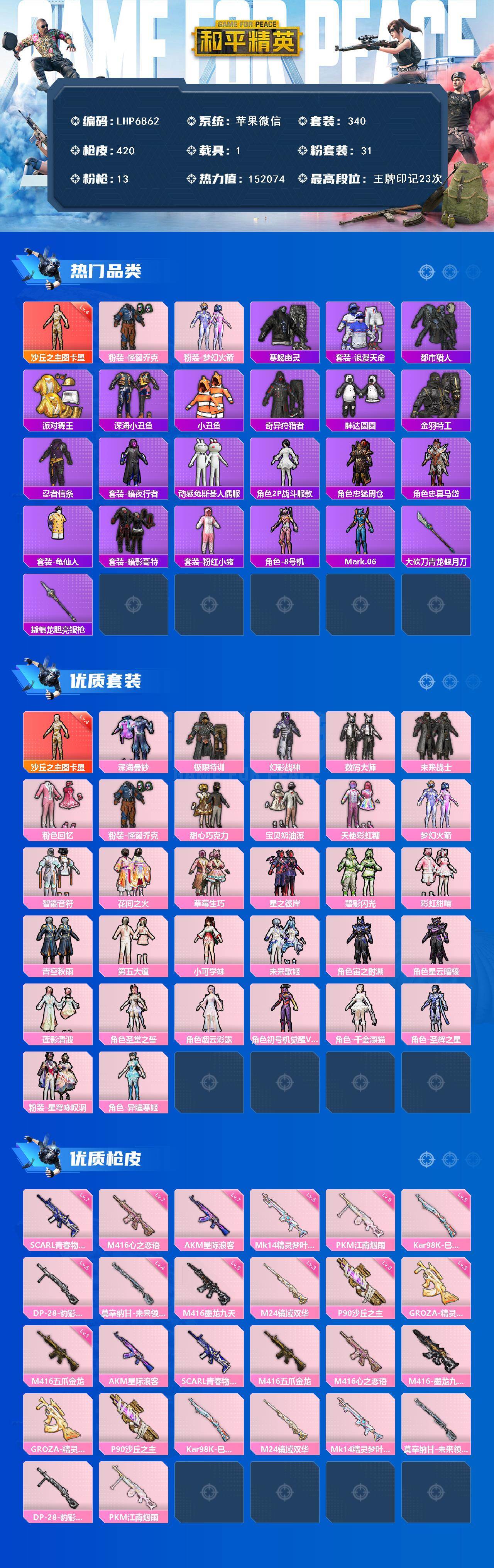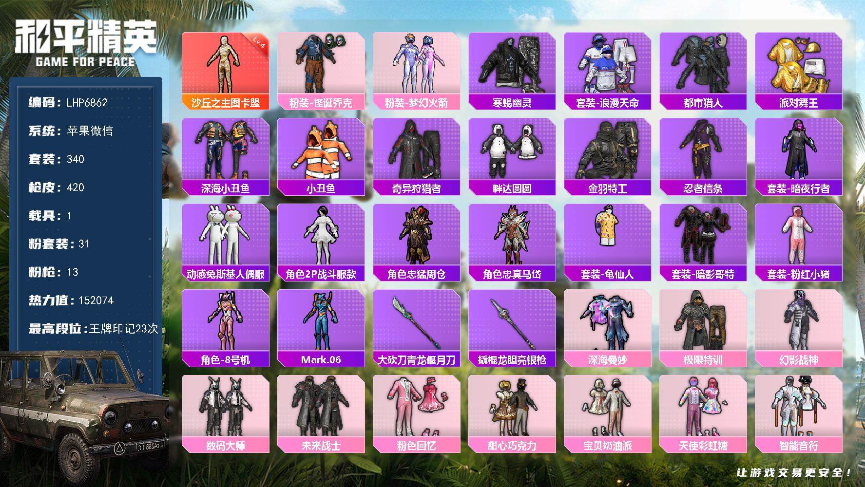 [15615872]素材全套【特价出售/店主推荐】苹果 微信-1神装-31粉装-13特效枪-1载具-12粉色飞行器-152074热力值-23王牌印记-340套装-420枪皮