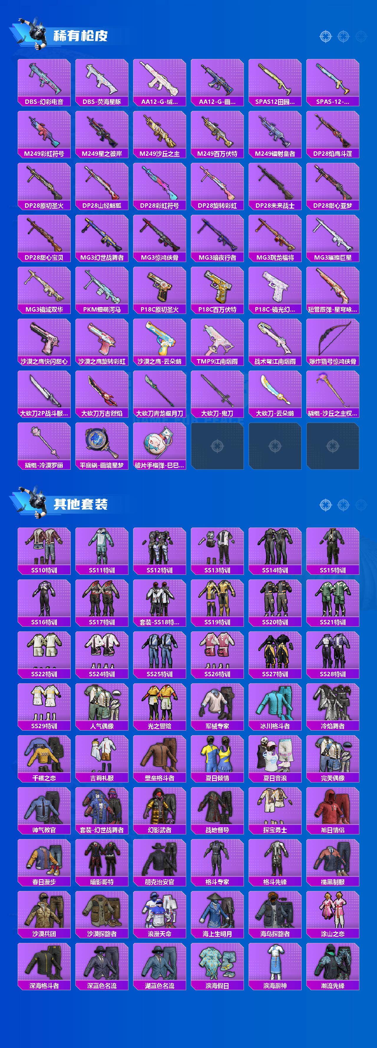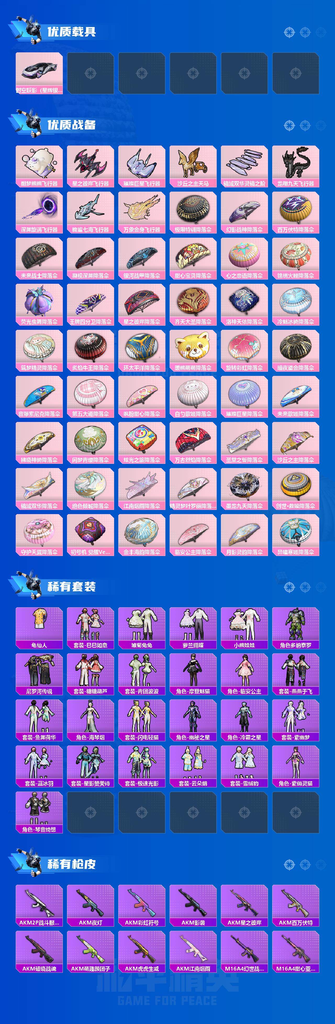 [15615872]素材全套【特价出售/店主推荐】苹果 微信-1神装-31粉装-13特效枪-1载具-12粉色飞行器-152074热力值-23王牌印记-340套装-420枪皮 【红色神装等级】:沙丘之主-图卡盟(四级) 【红色角色神装】:沙丘之主-图卡盟 【热门品类】:粉装-怪诞乔克,粉装-梦幻火箭,套装-寒蝎幽灵,套装-浪漫天命,套装-都市猎人,套装-派对舞王,套装-深海小丑鱼,套装-小丑鱼,套装-奇异狩猎者,套装-胖达圆圆,套装-金羽特工,套装-忍者信条,套装-暗夜行者,套装-动感兔斯基人偶服,角色-2P战斗服款,角色-忠猛周仓,角色-忠真马岱,套装-龟仙人,套装-暗影哥特,套装-粉红小猪,角色-8号机,角色-Mark.06,大砍刀-青龙偃月刀,撬棍-龙胆亮银枪 【粉色套装】:粉装-深海曼妙,粉装-极限特训,粉装-幻影战神,粉装-数码大师,粉装-未来战士,粉装-粉色回忆,粉装-怪诞乔克,粉装-甜心巧克力,粉装-宝贝奶油派,粉装-天使彩虹糖,粉装-梦幻火箭,粉装-智能音符,粉装-花间之火,粉装-草莓生巧,粉装-星之彼岸,粉装-碧影闪光,粉装-彩虹甜喵,粉装-青空秋雨,粉装-第五大道,角色-小可学妹,粉装-未来歌姬,角色-宙之时溯,角色-星云暗核,粉装-莲影清波,角色-圣堂之誓,角色-烟云彩露,角色-初号机 觉醒Ver.,角色-千金淑猫,角色-圣辉之星,粉装-星穹咏叹调,角色-异瞳寒姬 【粉色枪皮等级】:AKM-星际浪客(七级),SCAR-L-青春物语(七级),M416-五爪金龙(一级),M416-心之恋语(七级),M416-墨龙九天(三级),GROZA-精灵之光(三级),P90-沙丘之主(三级),Kar98K-巳巳如意(五级),M24-镜域双华(三级),Mk14-精灵梦叶罗丽(五级),莫辛纳甘-未来领航者(四级),DP-28-豹影疾电(五级),PKM-江南烟雨(五级) 【粉色载具】:时空跃影(星辉银) 【粉色枪皮】:AKM-星际浪客,SCAR-L-青春物语,M416-五爪金龙,M416-心之恋语,M416-墨龙九天,GROZA-精灵之光,P90-沙丘之主,Kar98K-巳巳如意,M24-镜域双华,Mk14-精灵梦叶罗丽,莫辛纳甘-未来领航者,DP-28-豹影疾电,PKM-江南烟雨 【粉色飞行器】:酣梦熊熊飞行器,星之彼岸飞行器,璀璨巨星飞行器,沙丘之主天马,镜域双华-灵镜之阶,龙翔九