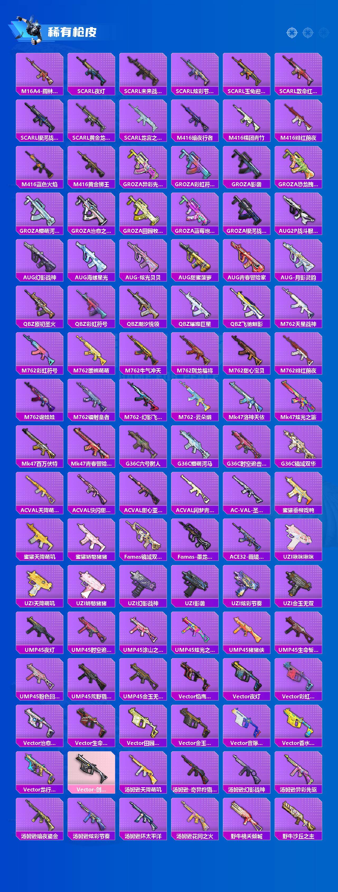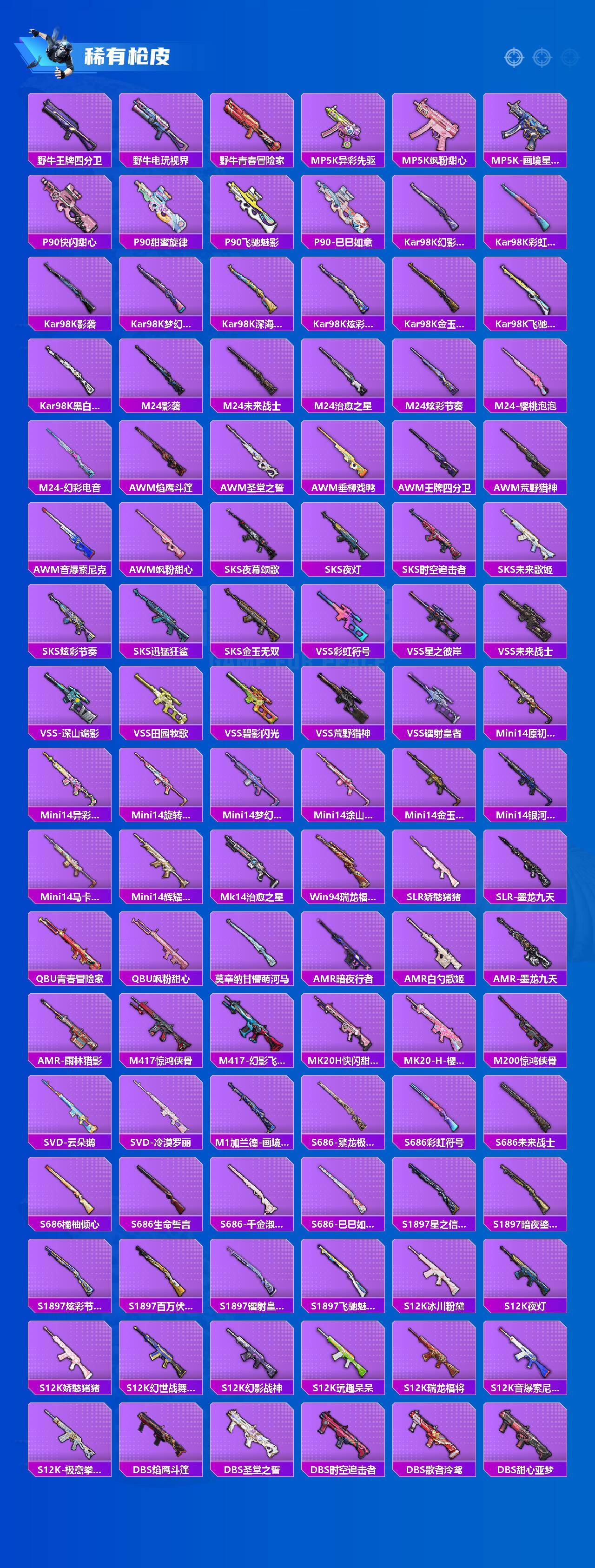 【粉色枪皮】:AKM-星际浪客,SCAR-L-青春物语,M416-五爪金龙,M416-心之恋语,M416-墨龙九天,GROZA-精灵之光,P90-沙丘之主,Kar98K-巳巳如意,M24-镜域双华,Mk14-精灵梦叶罗丽,莫辛纳甘-未来领航者,DP-28-豹影疾电,PKM-江南烟雨