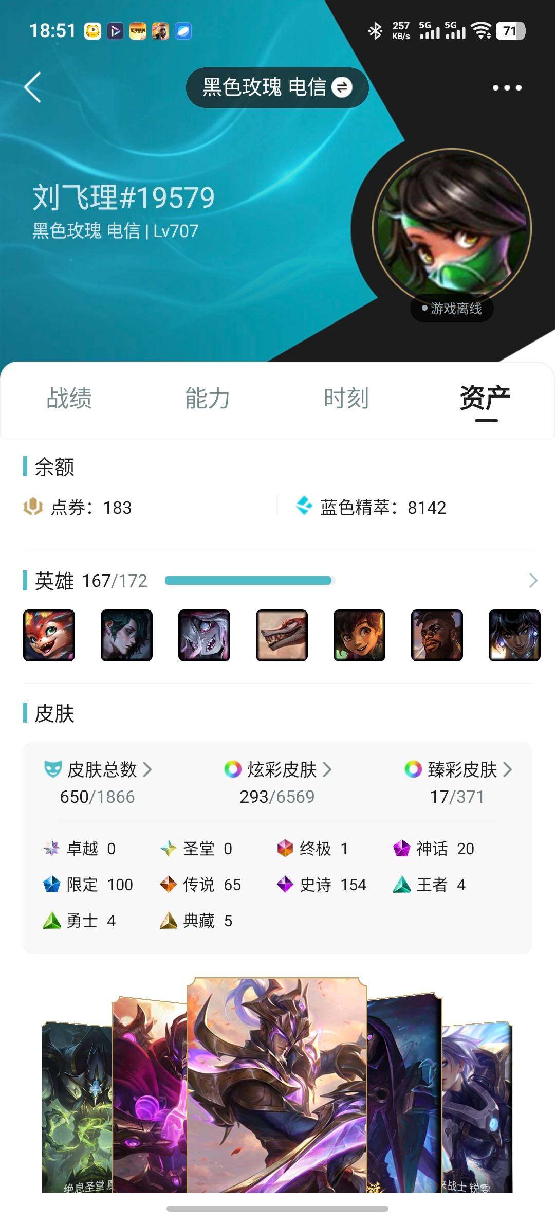 - [12200836]V7 7传说 125英雄 177皮肤 可修改实名 优质装备:一念神魔,地狱火,零号·赤焰,地狱之眼,无双飞将,霜月吟 珍宝阁皮:玩趣恶龙 限定皮:齐天大圣,五谷丰年,李小龙,山海·玄木吟(马可年限) 史诗皮:龙之律动,星界战将,紫霞仙子,特工魅影,冰冠公主,蒙恬荣光圣徽,偶像歌手,末日机甲-吕布,猫狗日记-孙策,乱世虎臣,摇滚巨星,水果甜心,绅士熊喵,星夜王子,暗隐猎兽者,鬼剑武藏,心灵战警,地狱岩魂,乘风破浪,水晶猎龙者,金属风暴,原初追逐者,鹰眼统帅,魅力维加斯,黎明之约