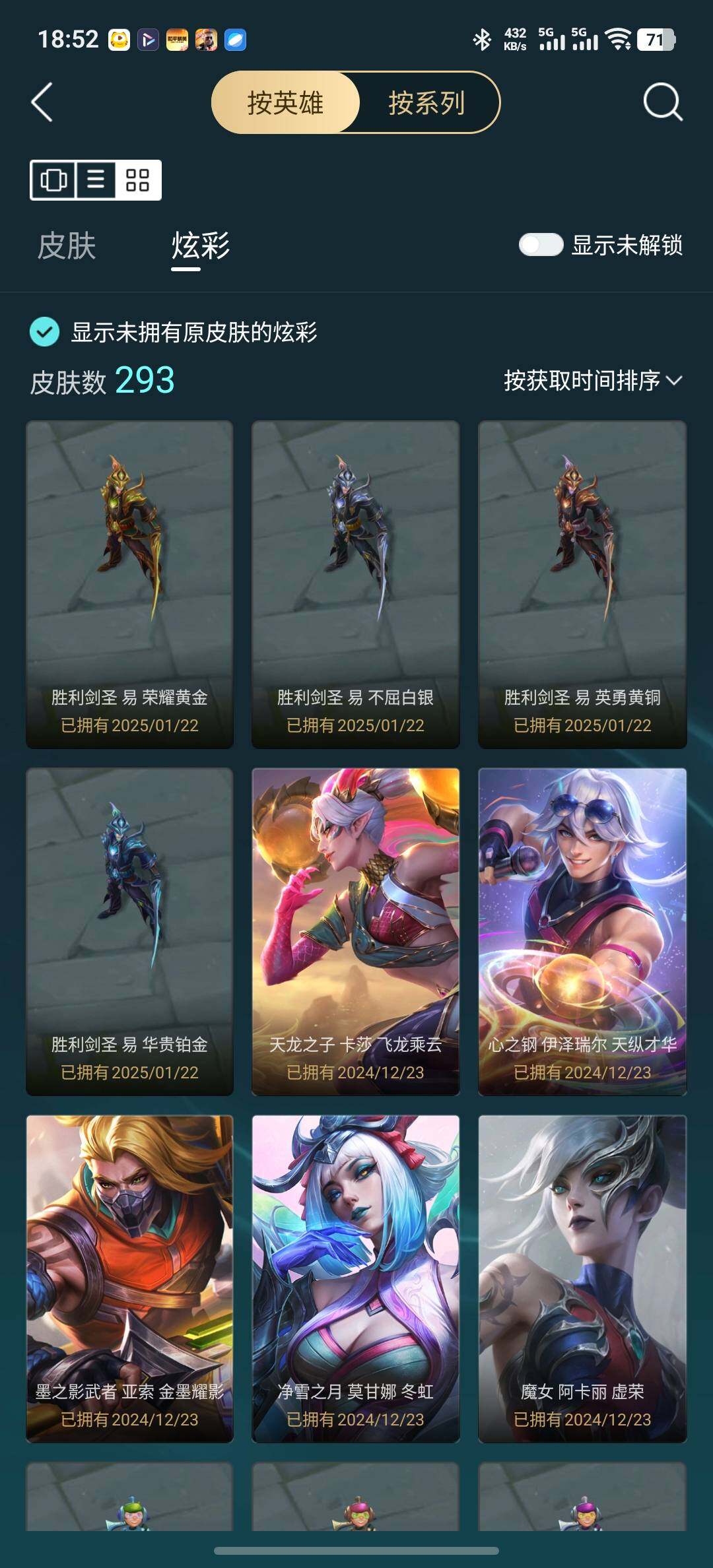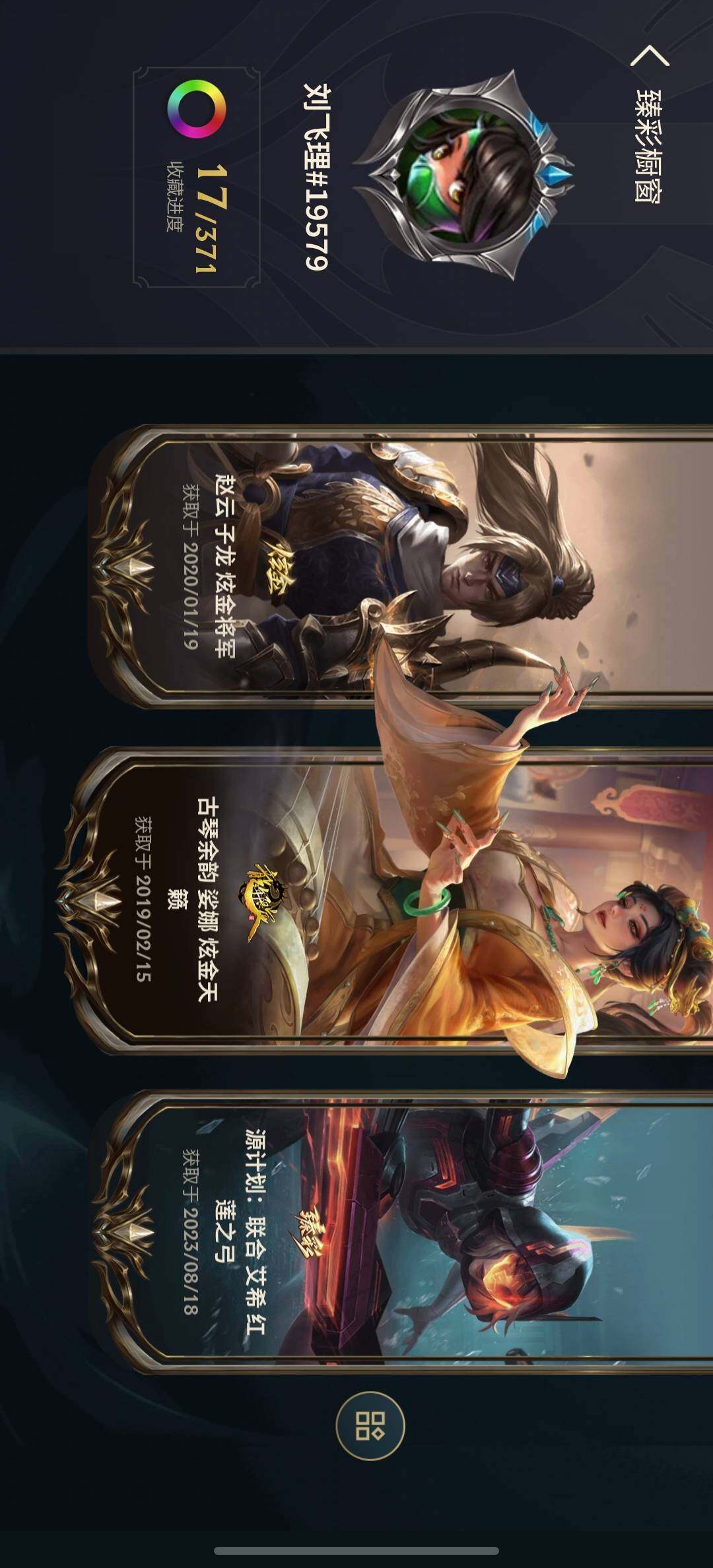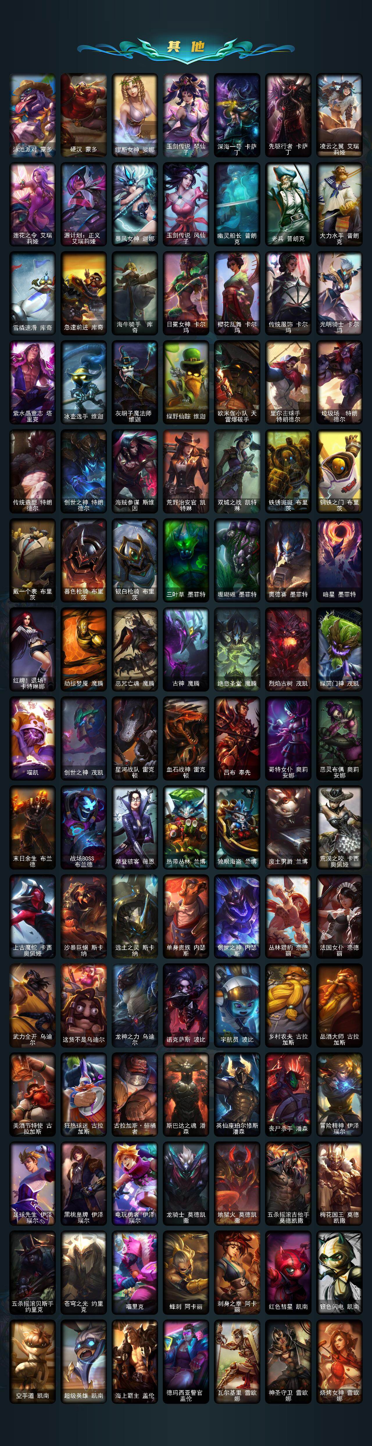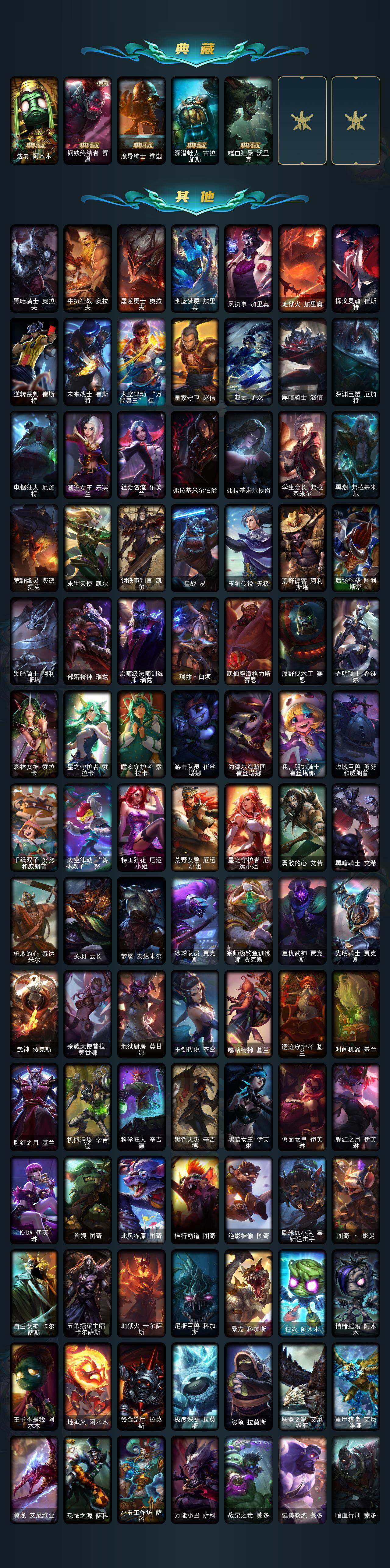 【臻彩皮肤】:古琴余韵娑娜炫金天籁,天龙之子卡莎飞龙乘云,无畏骑士瑟庄妮赤子初心,赵云子龙炫金将军,墨之影武者亚索金墨耀影,神龙尊者圣龙李青龙腾云起,源计划联合艾希红莲之弓,黎明使者锐雯黑夜使者,星之守护者金克丝黑洞,弹幕天使卡莎炽天使公正,泳池派对奥莉安娜优雅珠光鲸,持七彩冰棍的雪人易,魔女阿卡丽虚荣,净雪之月莫甘娜冬虹,王国机神白虎贾克斯云霄,心之钢伊泽瑞尔天纵才华