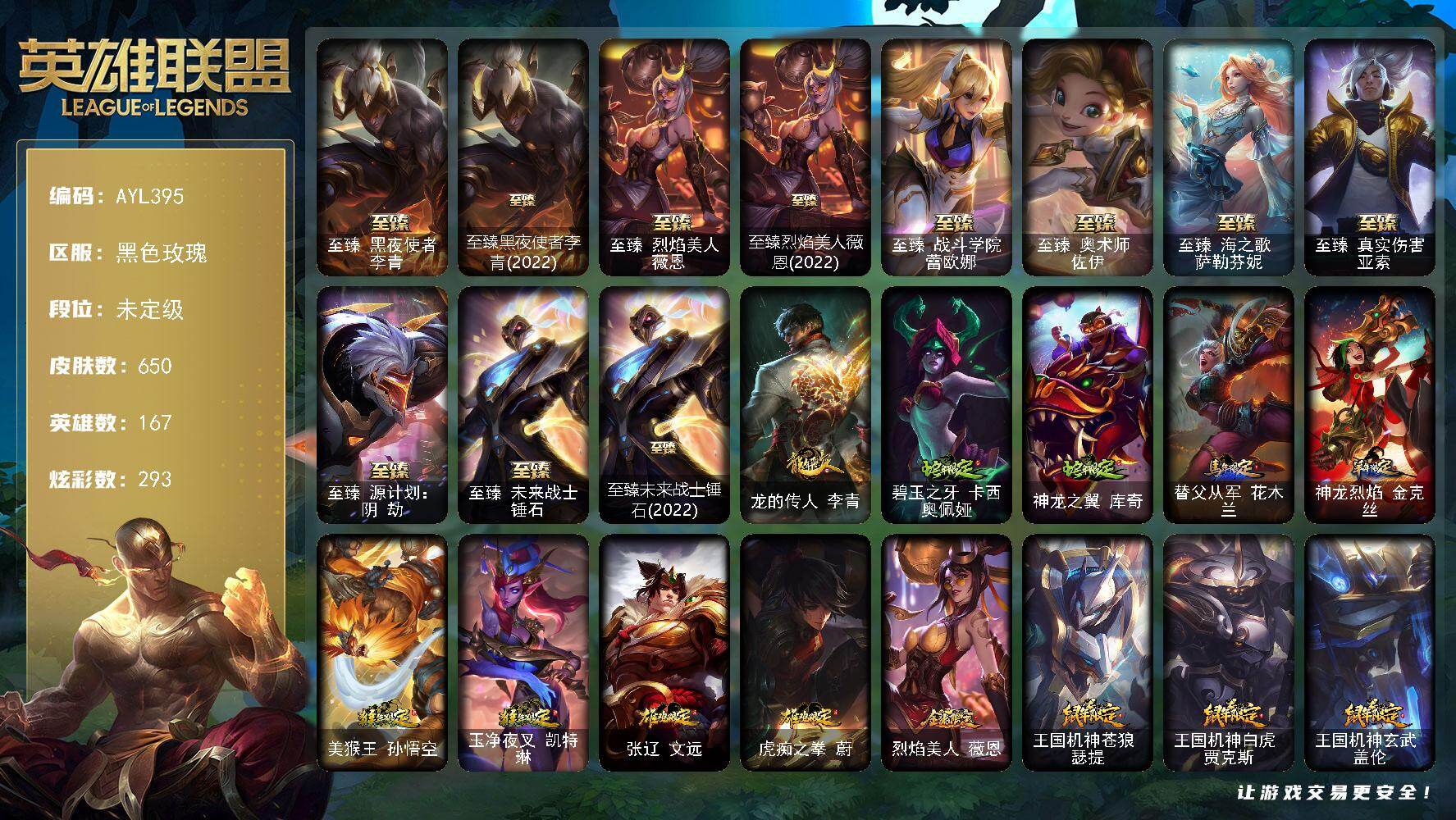 [15616254]【特价出售/店主推荐】未定级段位-167英雄-650皮肤-293炫彩-1终极-20神话-100限定-65传说-154史诗 【热门头像】:爱情之歌头像 【至臻皮肤】:至臻黑夜使者李青,至臻黑夜使者李青(2022),至臻烈焰美人薇恩,至臻烈焰美人薇恩(2022),至臻战斗学院蕾欧娜,至臻奥术师佐伊,至臻海之歌萨勒芬妮,至臻真实伤害亚索,至臻源计划阴劫,至臻未来战士锤石,至臻未来战士锤石(2022) 【臻彩皮肤】:古琴余韵娑娜炫金天籁,天龙之子卡莎飞龙乘云,无畏骑士瑟庄妮赤子初心,赵云子龙炫金将军,墨之影武者亚索金墨耀影,神龙尊者圣龙李青龙腾云起,源计划联合艾希红莲之弓,黎明使者锐雯黑夜使者,星之守护者金克丝黑洞,弹幕天使卡莎炽天使公正,泳池派对奥莉安娜优雅珠光鲸,持七彩冰棍的雪人易,魔女阿卡丽虚荣,净雪之月莫甘娜冬虹,王国机神白虎贾克斯云霄,心之钢伊泽瑞尔天纵才华 【年限皮肤】:龙的传人李青,碧玉之牙卡西奥佩娅,神龙之翼库奇,替父从军花木兰,神龙烈焰金克丝,美猴王孙悟空,玉净夜叉凯特琳,张辽文远,虎痴之拳蔚,烈焰美人薇恩,王国机神苍狼瑟提,王国机神白虎贾克斯,王国机神玄武盖伦 【海克斯皮肤】:海克斯科技卡萨丁,摄魂使者薇恩,零之枪骑赫卡里姆 【情人节限定】:甜心宝贝安妮,甜心宝贝娑娜,觅心猎手薇恩,觅心游侠卢锡安 【冰雪限定】:幸福女神乐芙兰,持胡萝卜的雪人易,圣诞开心鬼提莫,圣诞精灵崔丝塔娜,圣诞狂欢努努和威朗普,圣诞糖果棒厄运小姐,圣诞狂欢基兰,阿木木“主人不要我了”,胡桃夹子萨科,平安夜女神娑娜,英勇玩具兵普朗克,邪恶圣诞老人维迦,喜庆之树茂凯,冬季仙境奥莉安娜,雪默丁格,圣诞玩偶波比,冰雪驯鹿波比,圣诞老人古拉加斯,圣诞驯鹿克格莫,魄罗骑士瑟庄妮,圣诞捣蛋鬼金克丝,冰雪节辛吉德 【终极皮肤】:大元素使拉克丝 【神话皮肤】:十周年纪念安妮,源代码乐芙兰,十五周年纪念希维尔,暗星科加斯,神凰行者瑞羽圣凰艾尼维亚,水晶巫灵泽拉斯,海克斯科技卡萨丁,零之枪骑赫卡里姆,摄魂使者薇恩,至臻真实伤害亚索,至臻奥术师佐伊,至臻海之歌萨勒芬妮,至臻黑夜使者李青,至臻黑夜使者李青2022,至臻烈焰美人薇恩,至臻烈焰美人薇恩2022,至臻未来战士锤石,至臻未来战士锤石2022,至臻源计划阴劫,至臻战斗学院蕾欧娜 【限定皮肤】:创星之灵璐璐,冠军之矛卡莉丝塔,冠军之刃锐雯2016,冠