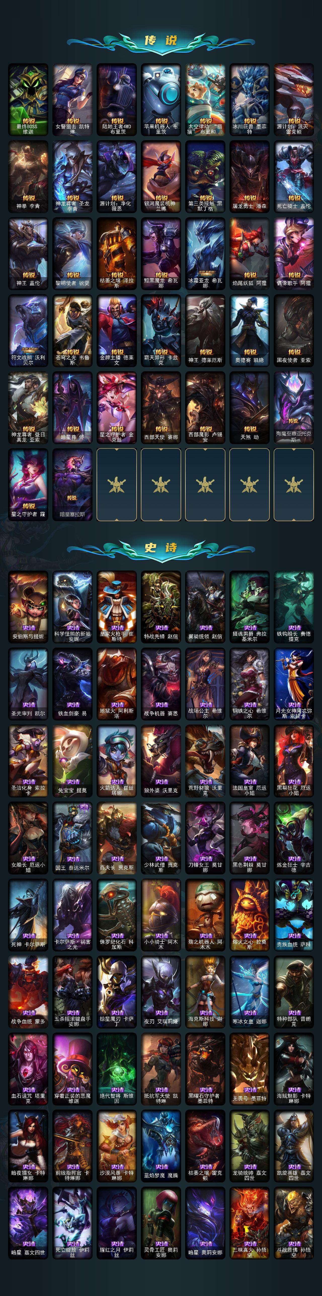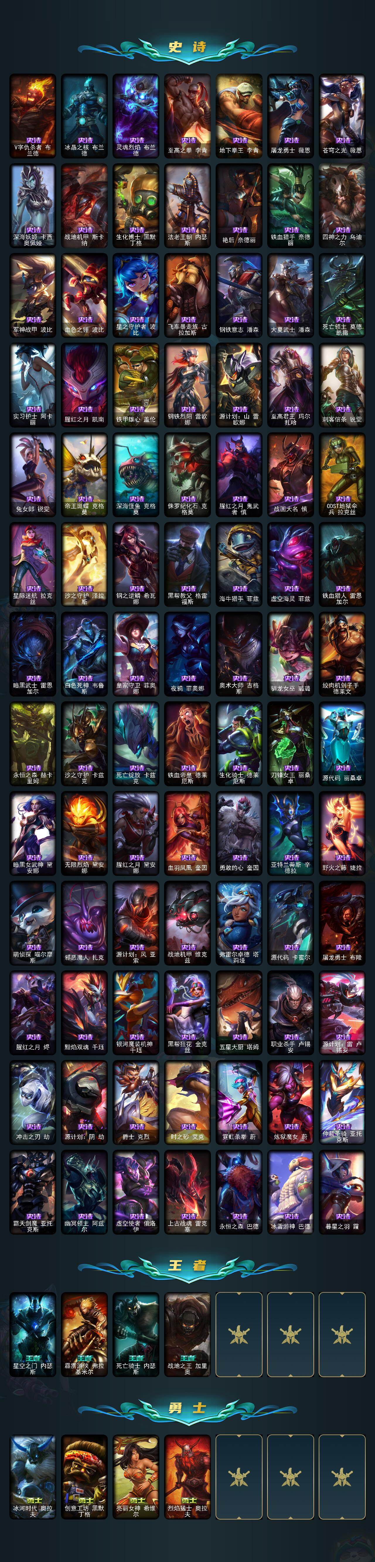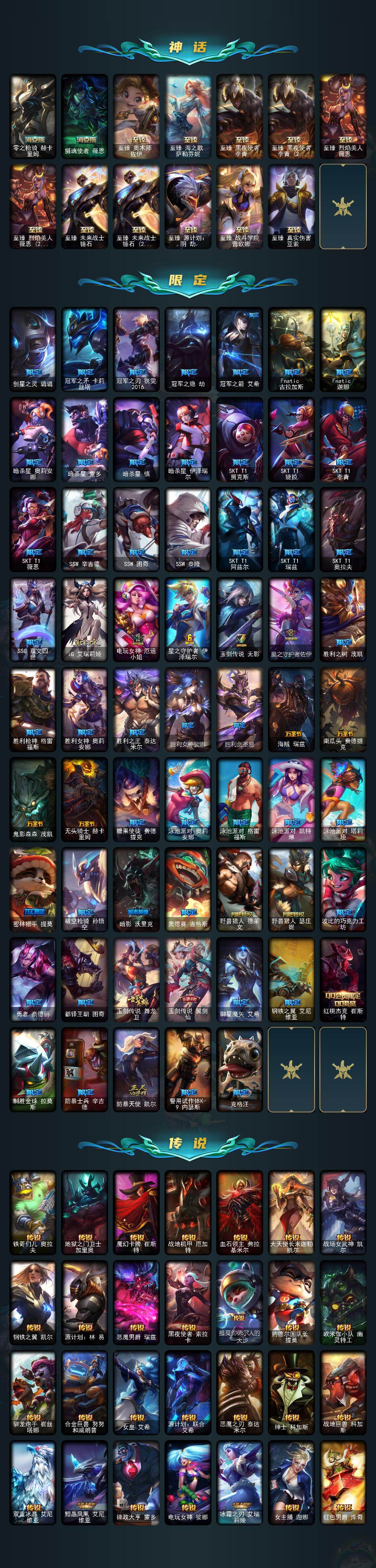 【年限皮肤】:龙的传人李青,碧玉之牙卡西奥佩娅,神龙之翼库奇,替父从军花木兰,神龙烈焰金克丝,美猴王孙悟空,玉净夜叉凯特琳,张辽文远,虎痴之拳蔚,烈焰美人薇恩,王国机神苍狼瑟提,王国机神白虎贾克斯,王国机神玄武盖伦