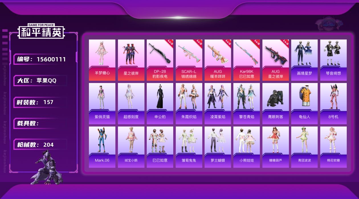 [15600111]【特价出售/店主推荐】苹果 手Q-3粉装-6特效枪-0载具-2粉色飞行器-55617热力值-13王牌印记-157套装-204枪皮【热门品类】:套装-龟仙人,角色-8号机,角色-Mark.06【粉色套装】:粉装-星之彼岸,角色-羊梦糖心,角色-罪夜之冕【粉色枪皮等级】:SCAR-L-锦绣绵绵(五级),AUG-星之彼岸(三级),AUG-暖羊咩咩(五级),Kar98K-巳巳如意(五级),DP-28-豹影疾电(五级)【粉色枪皮】:SCAR-L-锦绣绵绵,AUG-星之彼岸,AUG-暖羊咩咩,AUG-罪夜之冕,Kar98K-巳巳如意,DP-28-豹影疾电【粉色飞行器】:暮色之舞飞行器