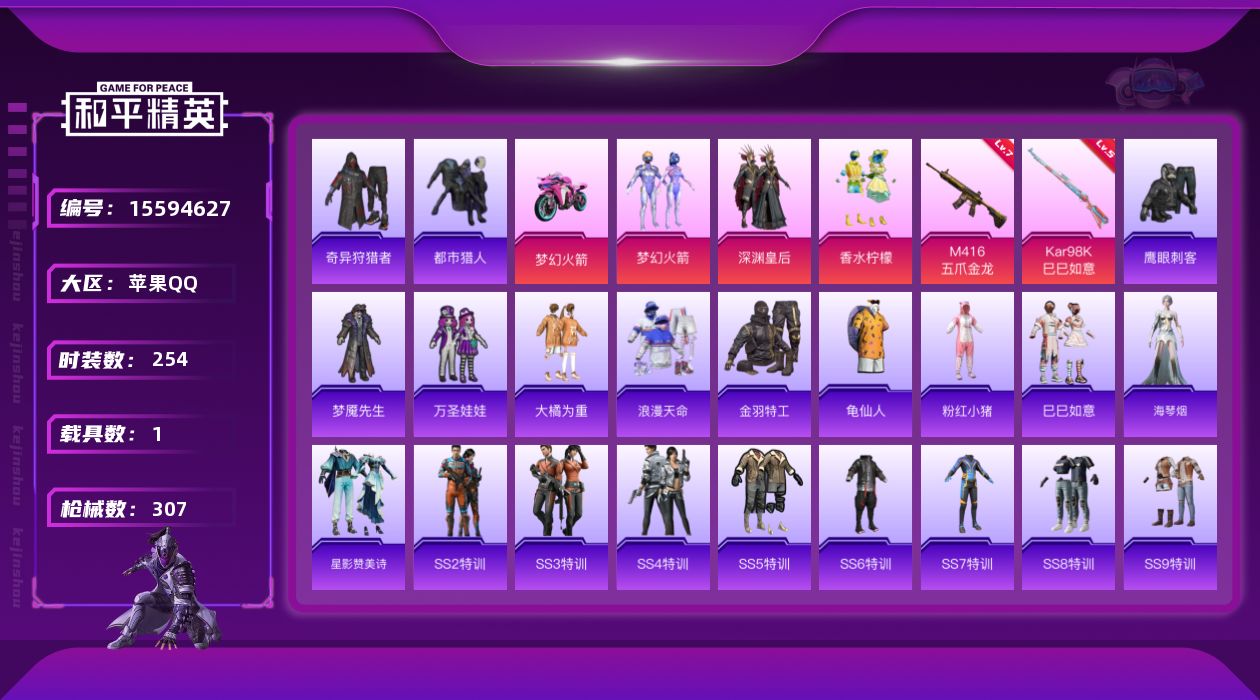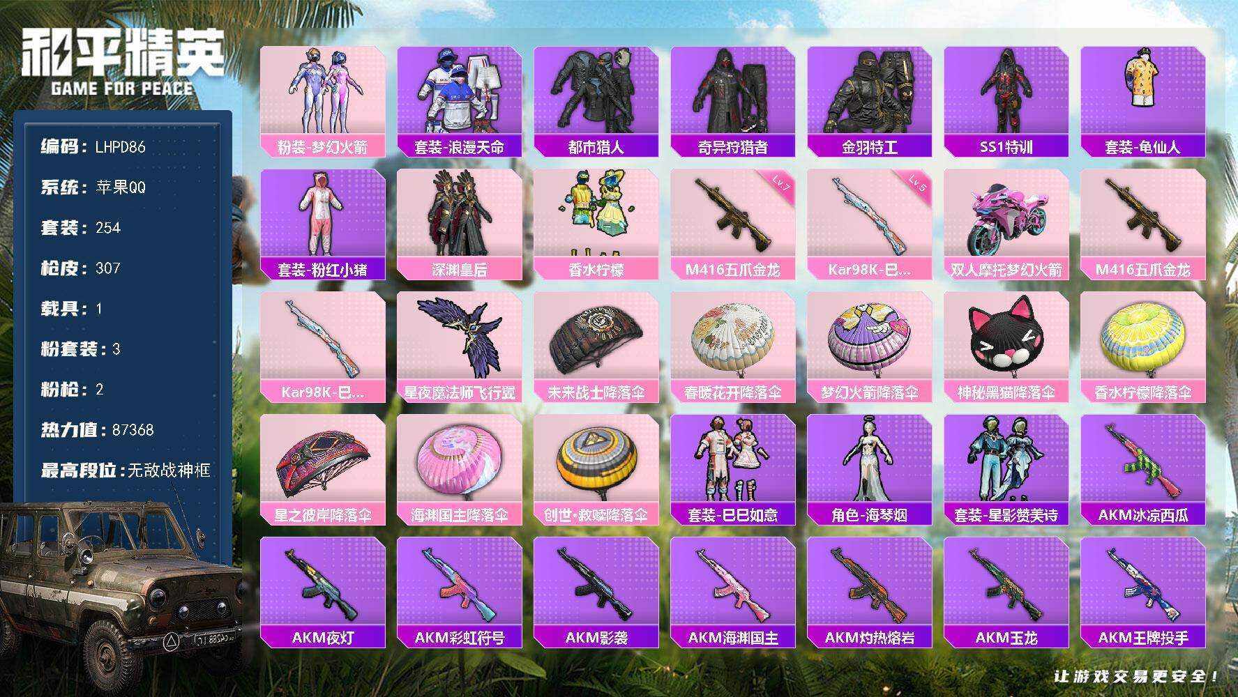 [15594627]【特价出售/店主推荐】苹果 手Q-无敌战神框-3粉装-2特效枪-1载具-1粉色飞行器-87368热力值-29王牌印记-254套装-307枪皮【热门品类】:粉装-梦幻火箭,套装-浪漫天命,套装-都市猎人,套装-奇异狩猎者,套装-金羽特工,套装-SS1特训,套装-龟仙人,套装-粉红小猪【粉色套装】:粉装-深渊皇后,粉装-梦幻火箭,粉装-香水柠檬【粉色枪皮等级】:M416-五爪金龙(七级),Kar98K-巳巳如意(五级)【粉色载具】:双人摩托-梦幻火箭【粉色枪皮】:M416-五爪金龙,Kar98K-巳巳如意【粉色飞行器】:星夜魔法师飞行翼