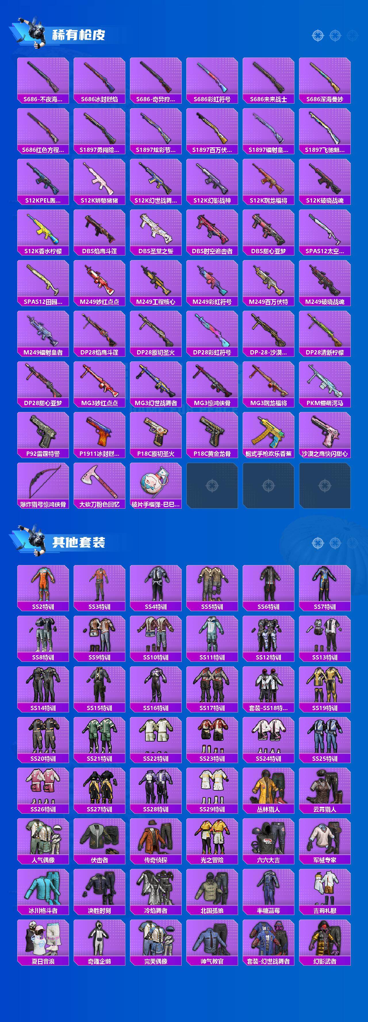 M416-仓鼠灰灰,M762-瑞龙福将,M762-风花雪月,M24-香水柠檬,M24-奇异狩猎者,S686-奇异狩猎者