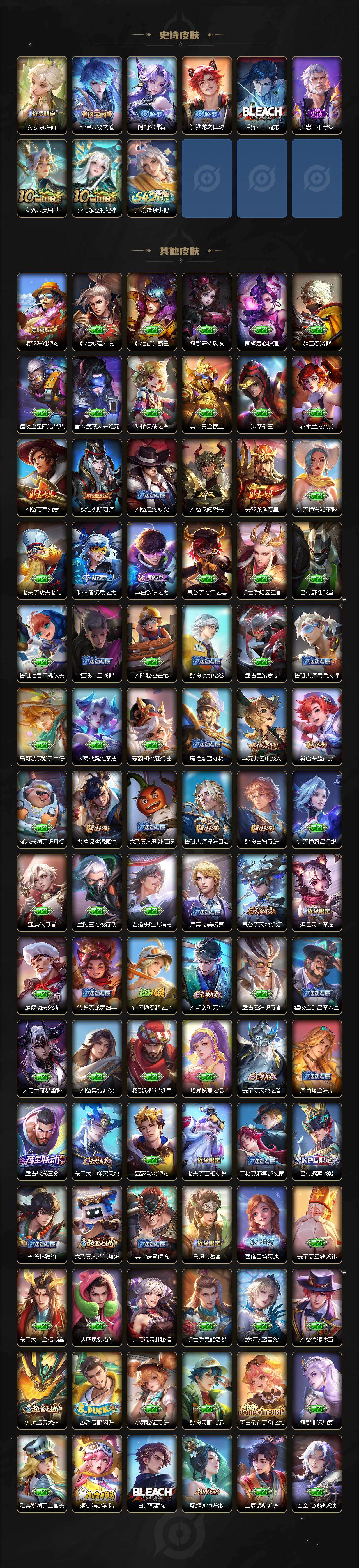 【史诗皮肤】:阿轲暗夜猫娘,赵云皇家上将,貂蝉圣诞恋歌,甄姬冰雪圆舞曲,宫本武藏鬼剑武藏,孙尚香水果甜心,嬴政摇滚巨星,墨子金属风暴,刘禅绅士熊喵,吕布末日机甲,张飞乱世虎臣,兰陵王暗隐猎兽者,雅典娜冰冠公主,百里守约特工魅影,蔡文姬舞动绿茵,刘禅天才门将,程咬金功夫厨神,阿轲节奏热浪,孙策猫狗日记,狄仁杰鹰眼统帅,阿轲迷踪丽影,孙尚香时之恋人,马可波罗暗影游猎,裴擒虎李小龙,嫦娥拒霜思,元歌无心,梦奇顽趣,马可波罗山海玄木吟,阿古朵江河有灵,蒙犽百解令,妲己灵卜魔法,高渐离燃音魔法,马可波罗星界特工,李白谪仙醉月,百里守约百相守梦,牛魔星界战将,孙膑茶境仙,弈星万物之道,阿轲化蝶舞,狂铁龙之律动,后羿石田雨龙,黄忠百相守梦,女娲万灵启世,少司缘巫礼祀神,周瑜线条小狗