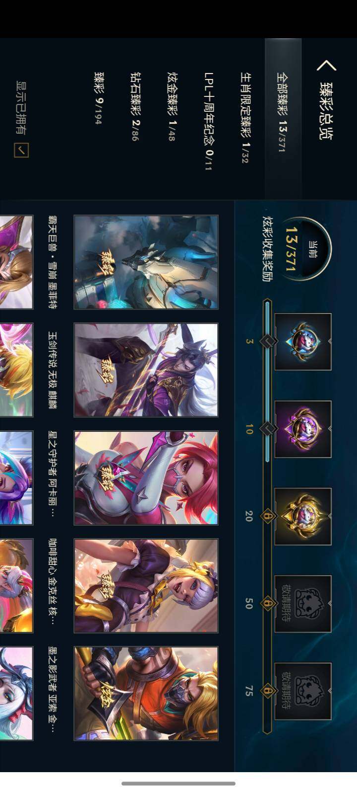 【臻彩皮肤】:天龙之子卡莎飞龙乘云,墨之影武者亚索金墨耀影,神龙尊者圣龙李青登龙,玉剑传说无极麒麟,咖啡甜心金克丝核桃巴菲,咖啡甜心璐璐焦糖布丁,星之守护者金克丝黑洞,霸天巨兽雪崩墨菲特,星之守护者阿卡丽未来之光,魔女阿卡丽虚荣,净雪之月莫甘娜冬虹,红莲之刃锐雯