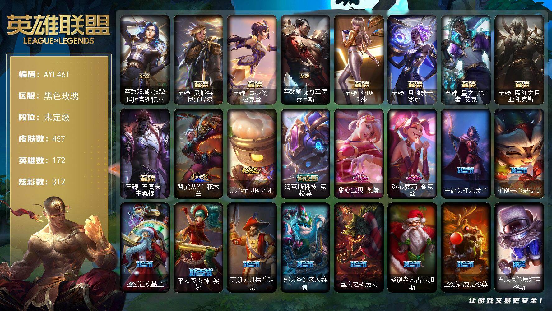 [15616519][店主推荐捡漏号]未定级段位-172英雄-457皮肤-312炫彩-0终极-14神话-63限定-57传说-101史诗 【至臻皮肤】:至臻双城之战2指挥官凯特琳,至臻灵能特工伊泽瑞尔,至臻青花瓷拉克丝,至臻凯旋将军德莱厄斯,至臻KDA卡莎,至臻月蚀骑士赛娜,至臻星之守护者艾克,至臻腥红之月亚托克斯,至臻至高天奎桑提 【臻彩皮肤】:天龙之子卡莎飞龙乘云,墨之影武者亚索金墨耀影,神龙尊者圣龙李青登龙,玉剑传说无极麒麟,咖啡甜心金克丝核桃巴菲,咖啡甜心璐璐焦糖布丁,星之守护者金克丝黑洞,霸天巨兽雪崩墨菲特,星之守护者阿卡丽未来之光,魔女阿卡丽虚荣,净雪之月莫甘娜冬虹,红莲之刃锐雯 【年限皮肤】:替父从军花木兰,点心宝贝阿木木 【海克斯皮肤】:海克斯科技克格莫 【情人节限定】:甜心宝贝娑娜,觅心萝莉金克丝 【冰雪限定】:幸福女神乐芙兰,圣诞开心鬼提莫,圣诞狂欢基兰,平安夜女神娑娜,英勇玩具兵普朗克,邪恶圣诞老人维迦,喜庆之树茂凯,圣诞老人古拉加斯,圣诞驯鹿克格莫,雪球也能爆炸吉格斯,北极星使者萨科,北极星猎人斯维因,北极星使者彗 【神话皮肤】:十周年纪念安妮,源代码乐芙兰,十五周年纪念希维尔,殿堂传奇薇恩,海克斯科技克格莫,至臻至高天奎桑提,至臻KDA卡莎,至臻灵能特工伊泽瑞尔,至臻青花瓷拉克丝,至臻腥红之月亚托克斯,至臻星之守护者艾克,至臻月蚀骑士赛娜 【限定皮肤】:冠军之血希瓦娜,冠军之刃锐雯2016,Fnatic古拉加斯,Fnatic迦娜,SKTT1薇恩,SKTT1卡莉丝塔,SKTT1雷克顿,SKTT1烬,SSG嘉文四世,iG卡莎,EDG佐伊,黎明使者薇恩,神凰行者烈羽焰凰霞,海珀利安小队Y03权天使卡蜜尔,暗裔英雄盖伦,胜利枪神格雷福斯,胜利女神奥莉安娜,胜利之剑亚托克斯,胜利枪神卢锡安,胜利机器人布里茨,胜利女神瑟庄妮,胜利之王泰达米尔,胜利巨口克格莫,胜利剑圣易,胜利之运崔斯特,胜利女神菲奥娜,海贼瑞兹,南瓜头费德提克,大魔法锅布里茨,魅惑女巫波比,糖果使徒费德提克,泳池派对凯特琳,泳池派对李青,泳池派对普朗克,泳池派对塔里克,机械迷城加里奥,密林猎手提莫,暗影沃里克,波比的巧克力工坊,都铎王朝图奇,征服者贾克斯,制胜金靴李青,防暴士兵辛吉德,海之歌永恩,双城之战2微光实验室辛吉德,双城之战2教授黑默丁格 【传说皮肤】:铁哥们儿奥拉夫,地狱之门卫士加里奥,战地机甲