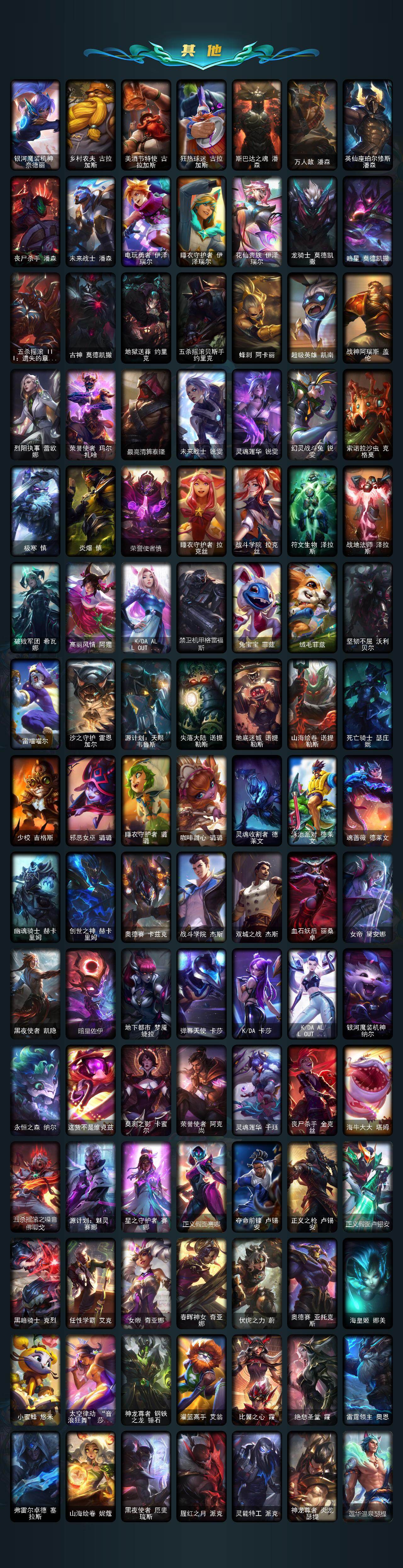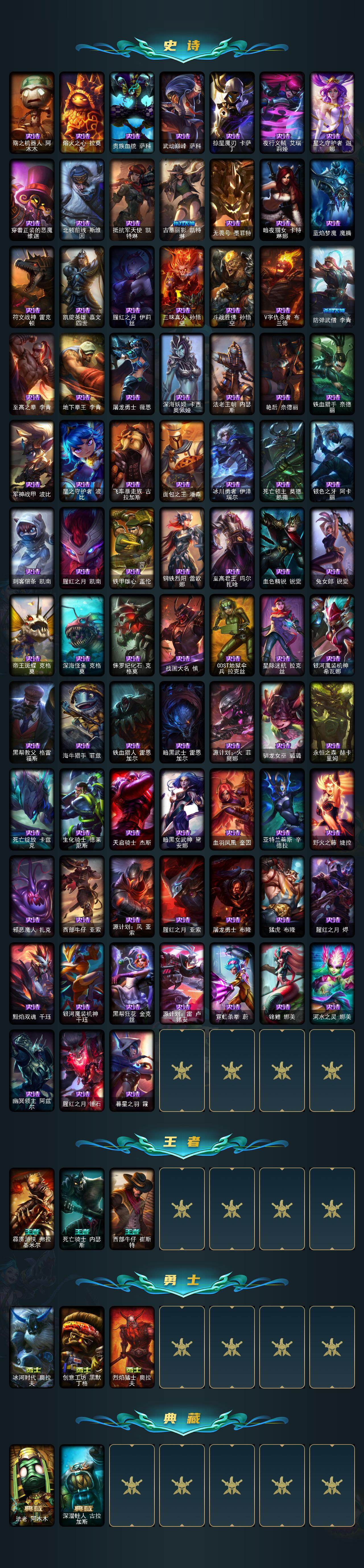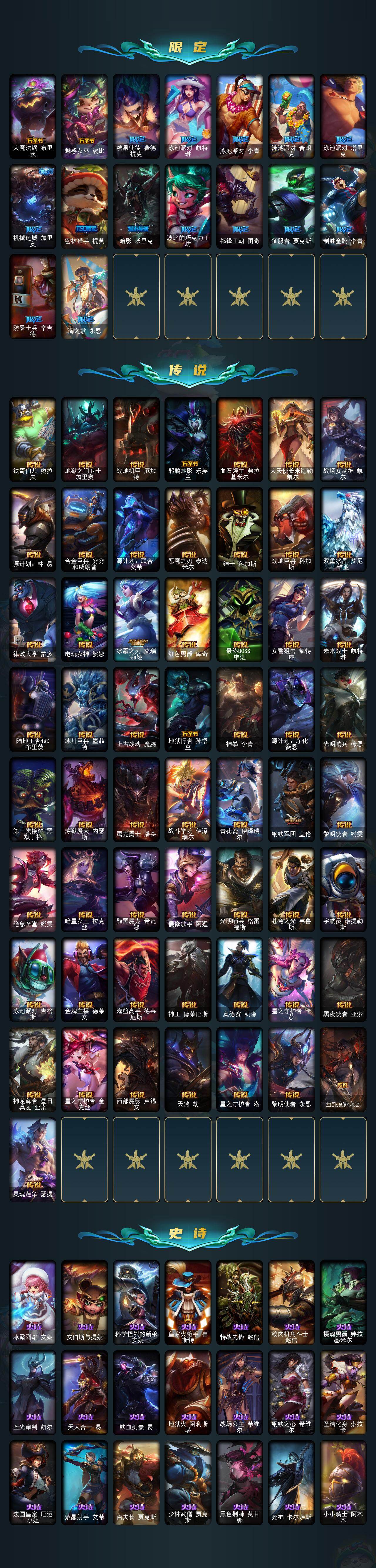 【限定皮肤】:冠军之血希瓦娜,冠军之刃锐雯2016,Fnatic古拉加斯,Fnatic迦娜,SKTT1薇恩,SKTT1卡莉丝塔,SKTT1雷克顿,SKTT1烬,SSG嘉文四世,iG卡莎,EDG佐伊,黎明使者薇恩,神凰行者烈羽焰凰霞,海珀利安小队Y03权天使卡蜜尔,暗裔英雄盖伦,胜利枪神格雷福斯,胜利女神奥莉安娜,胜利之剑亚托克斯,胜利枪神卢锡安,胜利机器人布里茨,胜利女神瑟庄妮,胜利之王泰达米尔,胜利巨口克格莫,胜利剑圣易,胜利之运崔斯特,胜利女神菲奥娜,海贼瑞兹,南瓜头费德提克,大魔法锅布里茨,魅惑女巫波比,糖果使徒费德提克,泳池派对凯特琳,泳池派对李青,泳池派对普朗克,泳池派对塔里克,机械迷城加里奥,密林猎手提莫,暗影沃里克,波比的巧克力工坊,都铎王朝图奇,征服者贾克斯,制胜金靴李青,防暴士兵辛吉德,海之歌永恩,双城之战2微光实验室辛吉德,双城之战2教授黑默丁格