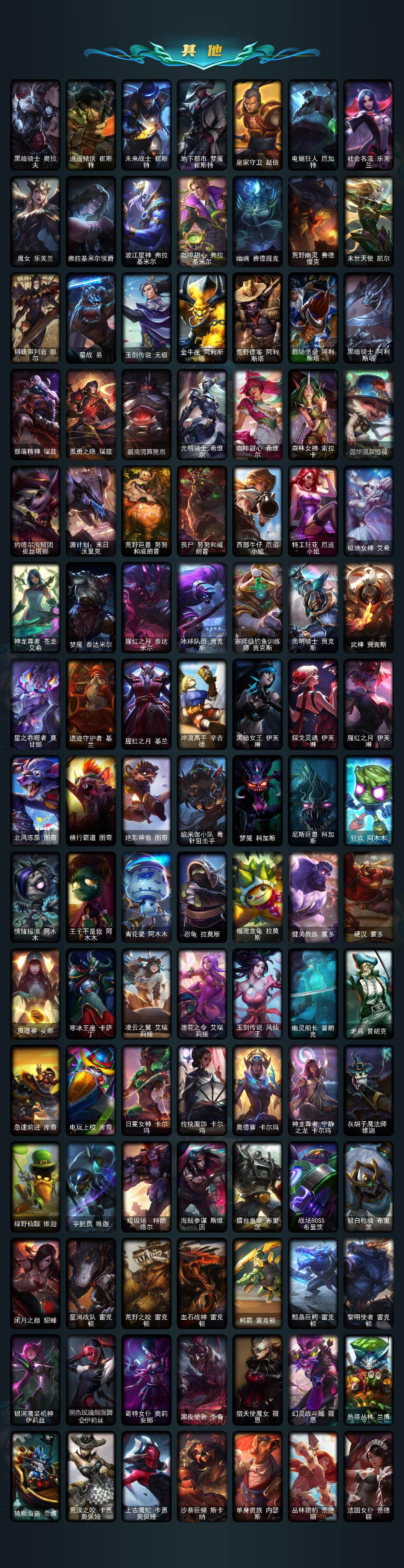 【冰雪限定】:幸福女神乐芙兰,圣诞开心鬼提莫,圣诞狂欢基兰,平安夜女神娑娜,英勇玩具兵普朗克,邪恶圣诞老人维迦,喜庆之树茂凯,圣诞老人古拉加斯,圣诞驯鹿克格莫,雪球也能爆炸吉格斯,北极星使者萨科,北极星猎人斯维因,北极星使者彗