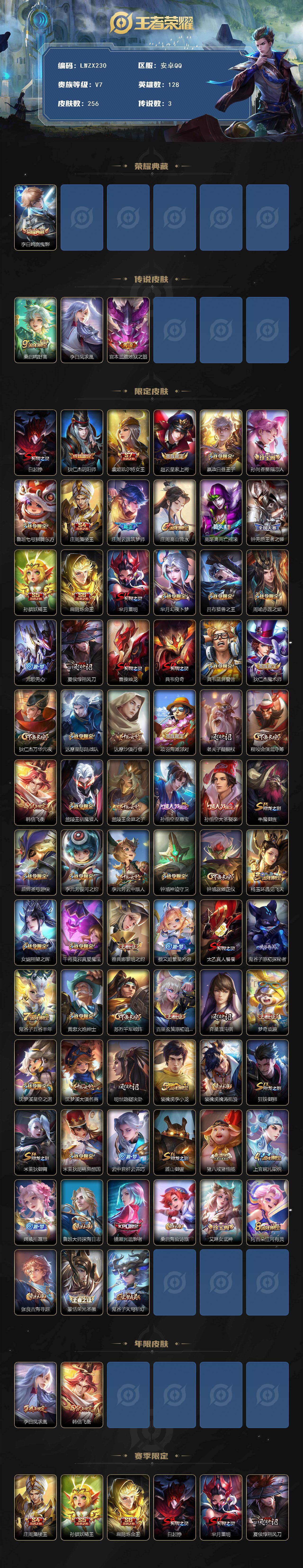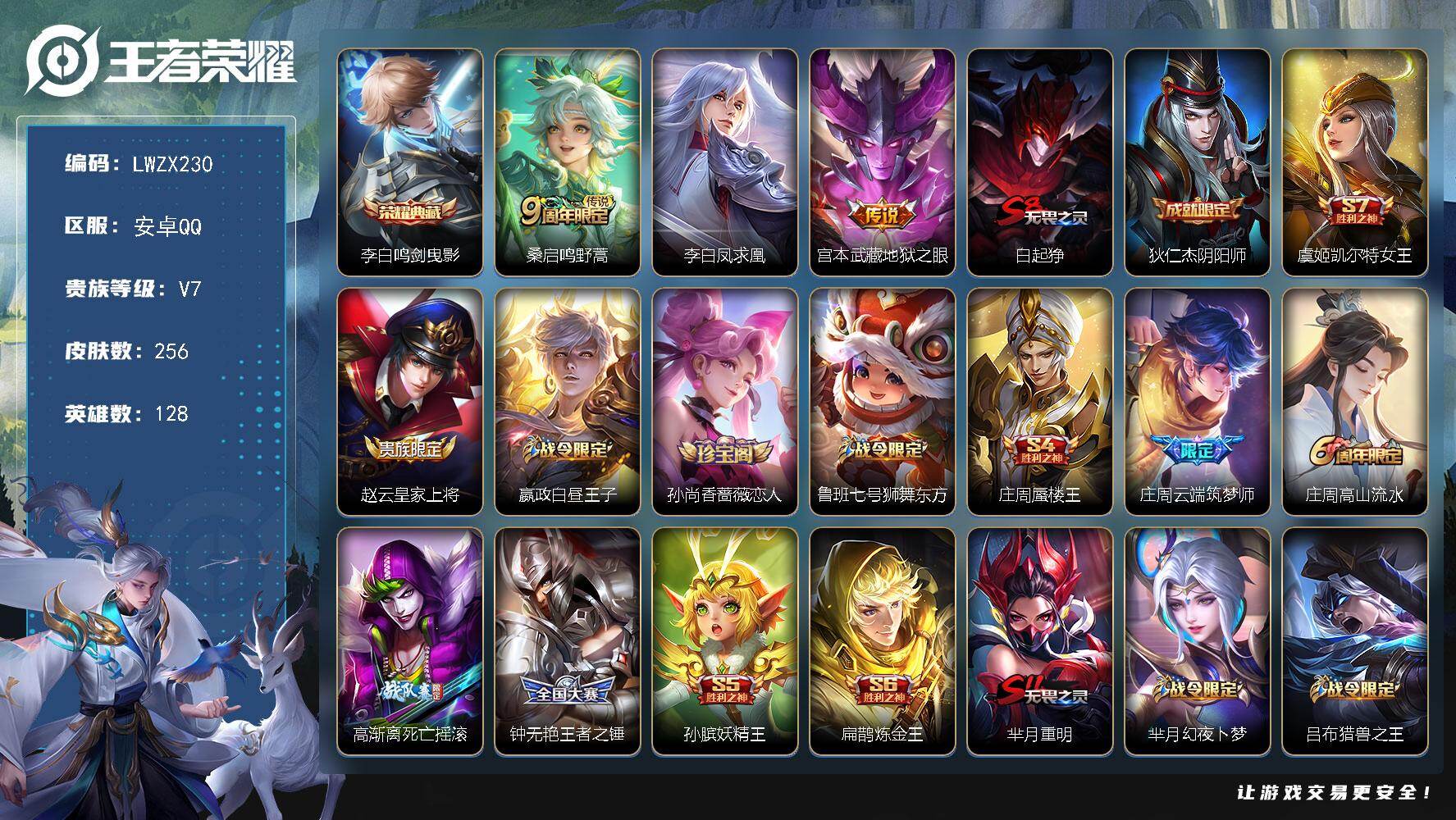 - [14513847]【店主推荐捡漏号!可直接换绑】安卓Q-V7-最强王者段位-126英雄-244皮肤-1典藏皮肤-8传说-72史诗 【荣耀典藏】:孙悟空全息碎影 【传说皮肤】:澜愿照九州拓,西施游龙清影,公孙离祈雪灵祝,关羽武圣,花木兰冠军飞将,貂蝉仲夏夜之梦,孙尚香末日机甲,宫本武藏地狱之眼 【限定皮肤】:白起狰,狄仁杰阴阳师,虞姬凯尔特女王,赵云皇家上将,墨子神迹守卫,孙尚香蔷薇恋人,庄周蜃楼王,庄周高山流水,孙膑妖精王,扁鹊炼金王,芈月重明,芈月幻夜卜梦,夏侯惇朔风刀,曹操烛龙,典韦穷奇,马可波罗暗影游猎,狄仁杰魔术师,狄仁杰万华元夜,达摩星际陆战队,达摩沙漠行僧,项羽海滩派对,老夫子醍醐杖,老夫子航海奇遇记,关羽武圣,程咬金演武夺筹,露娜一生所爱,韩信逐梦之影,王昭君午后时光,兰陵王金庭之子,花木兰青春决赛季,花木兰默契交锋,亚瑟狮心王,牛魔御旌,后羿圣弓游侠,李元芳银河之约,李元芳云中旅人,虞姬霸王别姬,钟馗驱傩正仪,杨玉环遇见飞天,干将莫邪真爱魔法,雅典娜单词大作战,雅典娜黎明之约,蔡文姬繁星吟游,太乙真人饕餮,鬼谷子原初探秘者,黄忠火炮绅士,苏烈千军破阵,百里玄策原初追逐者,弈星混沌棋,梦奇顽趣,公孙离祈雪灵祝,沈梦溪星空之诺,沈梦溪大漠名商,明世隐疑决卦,裴擒虎李小龙,裴擒虎擒涛扼浪,狂铁御狮,狂铁电玩高手,米莱狄御霄,米莱狄胡桃异想国,云中君纤云弄巧,盾山御銮,猪八戒西部大镖客,上官婉儿梁祝,蒙犽狂想玩偶喵,鲁班大师探海日志,桑启海盐诗旅,张良古海寻踪,蒙恬荣光圣徽,鬼谷子天穹祈灯,姬小满妄想食味,沈梦溪龙舞盛年,刘邦剑破天穹,刘备异域游侠,周瑜熔金海岸 【年限皮肤】:公孙离祈雪灵祝,关羽武圣 【赛季限定】:庄周蜃楼王,孙膑妖精王,扁鹊炼金王,白起狰,芈月重明,夏侯惇朔风刀,曹操烛龙,典韦穷奇,狄仁杰万华元夜,达摩沙漠行僧,老夫子醍醐杖,程咬金演武夺筹,兰陵王金庭之子,张良古海寻踪,亚瑟狮心王,牛魔御旌,李元芳云中旅人,虞姬凯尔特女王,钟馗驱傩正仪,雅典娜黎明之约,太乙真人饕餮,鬼谷子原初探秘者,苏烈千军破阵,百里玄策原初追逐者,弈星混沌棋,梦奇顽趣,沈梦溪大漠名商,明世隐疑决卦,裴擒虎擒涛扼浪,狂铁御狮,米莱狄御霄,盾山御銮,鲁班大师探海日志,桑启海盐诗旅,鬼谷子天穹祈灯,蒙恬荣光圣徽,刘邦剑破天穹 【战令限定】:墨子神迹守卫,芈月幻夜卜梦,马可波罗暗影游猎,达摩