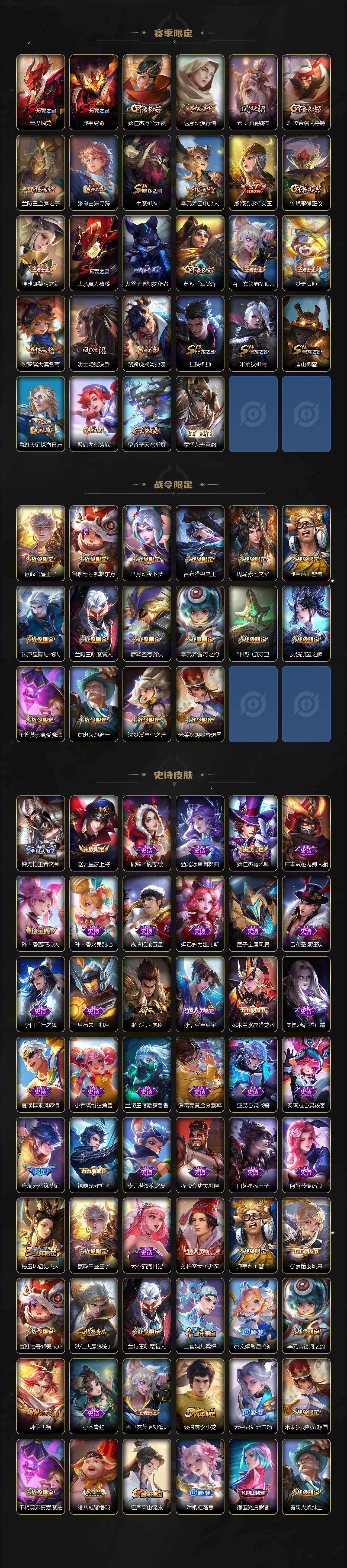 【赛季限定】:庄周蜃楼王,孙膑妖精王,扁鹊炼金王,白起狰,芈月重明,夏侯惇朔风刀,曹操烛龙,典韦穷奇,狄仁杰万华元夜,达摩沙漠行僧,老夫子醍醐杖,程咬金演武夺筹,兰陵王金庭之子,张良古海寻踪,牛魔御旌,李元芳云中旅人,虞姬凯尔特女王,钟馗驱傩正仪,雅典娜黎明之约,太乙真人饕餮,鬼谷子原初探秘者,苏烈千军破阵,百里玄策原初追逐者,弈星混沌棋,梦奇顽趣,沈梦溪大漠名商,明世隐疑决卦,裴擒虎擒涛扼浪,狂铁御狮,米莱狄御霄,盾山御銮,鲁班大师探海日志,桑启海盐诗旅,鬼谷子天穹祈灯,蒙恬荣光圣徽