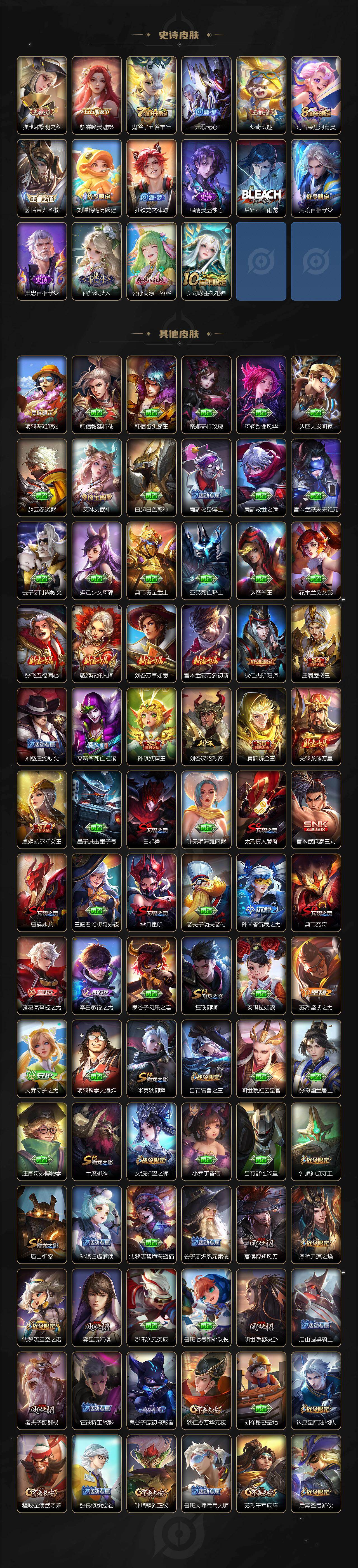 庄周蜃楼王,孙膑妖精王,扁鹊炼金王,虞姬凯尔特女王,白起狰,太乙真人饕餮,曹操烛龙,芈月重明,典韦穷奇,狂铁御狮,米莱狄御霄,牛魔御旌,盾山御銮,夏侯惇朔风刀,明世隐疑决卦,老夫子醍醐杖,鬼谷子原初探秘者,狄仁杰万华元夜,程咬金演武夺筹,钟馗驱傩正仪,苏烈千军破阵,吕布猎兽之王,嬴政白昼王子,女娲朔望之晖,典韦蓝屏警告,钟馗神迹守卫,鲁班七号狮舞东方,沈梦溪星空之诺,李元芳银河之约,弈星混沌棋,达摩沙漠行僧,兰陵王金庭之子,沈梦溪大漠名商,李元芳云中旅人,桑启海盐诗旅,裴擒虎擒涛扼浪,鲁班大师探海日志,张良古海寻踪