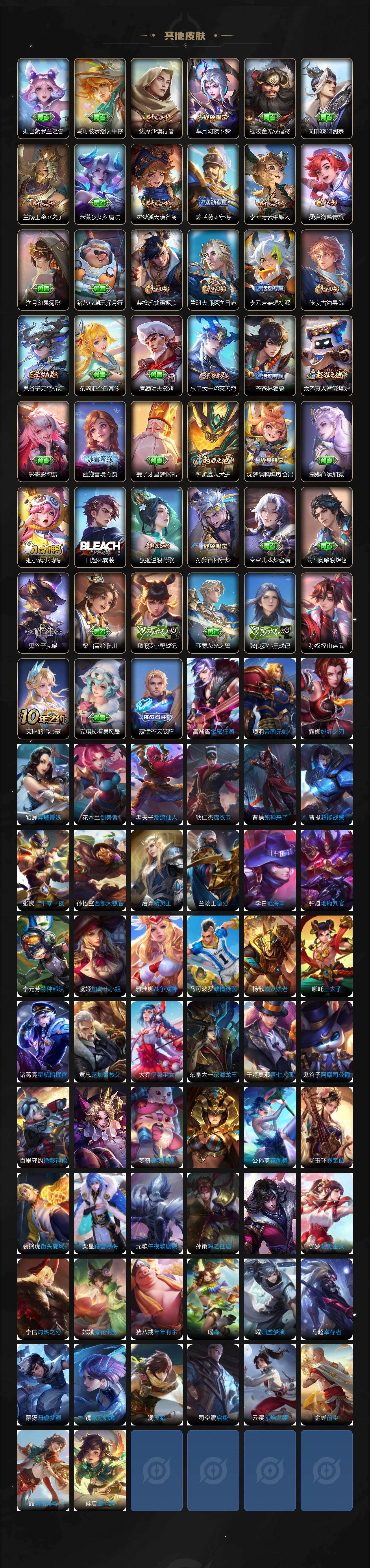 【限定皮肤】:白起狰,狄仁杰阴阳师,虞姬凯尔特女王,赵云皇家上将,嬴政白昼王子,孙尚香蔷薇恋人,鲁班七号狮舞东方,庄周蜃楼王,庄周云端筑梦师,庄周高山流水,高渐离死亡摇滚,钟无艳王者之锤,孙膑妖精王,扁鹊炼金王,芈月重明,芈月幻夜卜梦,吕布猎兽之王,周瑜赤莲之焰,元歌无心,夏侯惇朔风刀,曹操烛龙,典韦穷奇,典韦蓝屏警告,狄仁杰魔术师,狄仁杰万华元夜,达摩星际陆战队,达摩沙漠行僧,项羽海滩派对,老夫子醍醐杖,程咬金演武夺筹,韩信飞衡,兰陵王驯魔猎人,兰陵王金庭之子,孙悟空至尊宝,孙悟空大圣娶亲,牛魔御旌,后羿圣弓游侠,李元芳银河之约,李元芳云中旅人,钟馗神迹守卫,钟馗驱傩正仪,杨玉环遇见飞天,女娲朔望之晖,干将莫邪真爱魔法,雅典娜黎明之约,蔡文姬繁星吟游,太乙真人饕餮,鬼谷子原初探秘者,鬼谷子五谷丰年,黄忠火炮绅士,苏烈千军破阵,百里玄策原初追逐者,弈星混沌棋,梦奇顽趣,沈梦溪星空之诺,沈梦溪大漠名商,明世隐疑决卦,裴擒虎李小龙,裴擒虎擒涛扼浪,狂铁御狮,米莱狄御霄,米莱狄胡桃异想国,云中君纤云弄巧,盾山御銮,猪八戒猪悟能,上官婉儿梁祝,嫦娥拒霜思,鲁班大师探海日志,镜匿光追影者,桑启海盐诗旅,艾琳女武神,阿古朵江河有灵,张良古海寻踪,蒙恬荣光圣徽,鬼谷子天穹祈灯