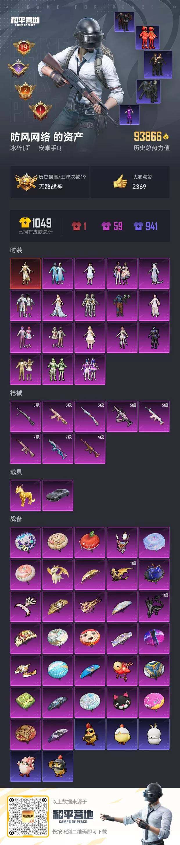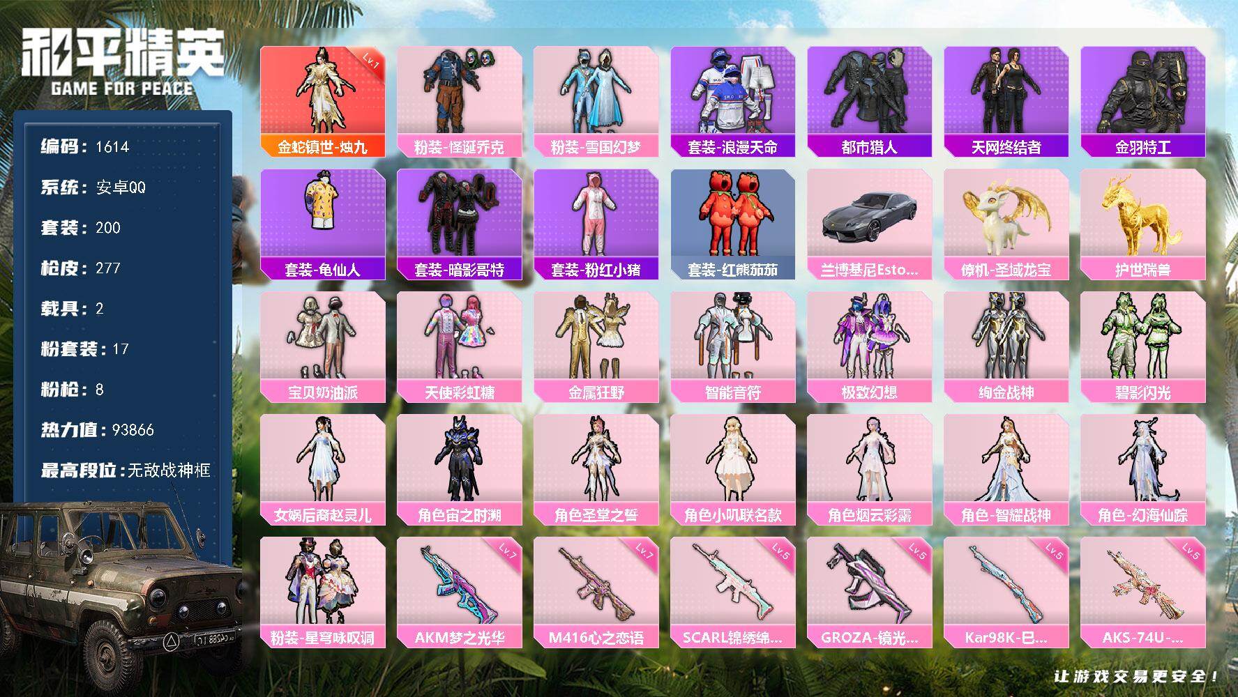 [14451055]【1614】安卓 手Q-无敌战神框-1神装-17粉装-8特效枪-2载具-7粉色飞行器-93866热力值-19王牌印记-200套装-277枪皮