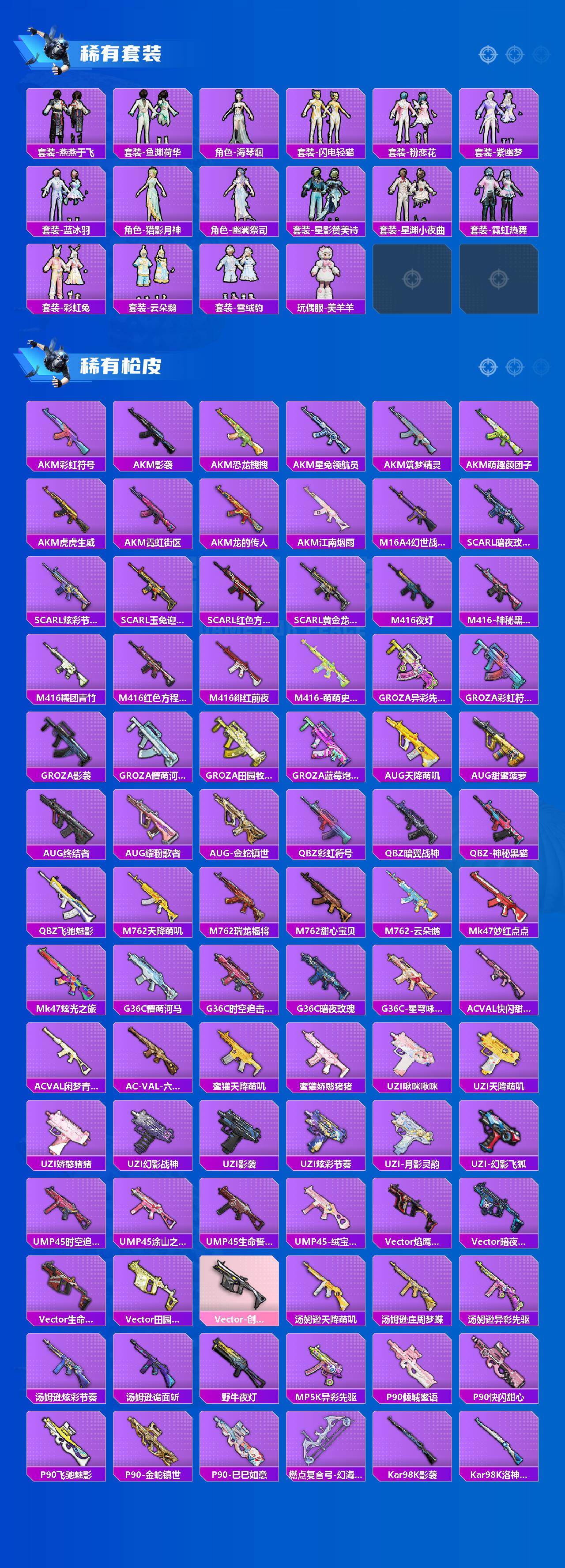 【粉色枪皮】:AKM-梦之光华,SCAR-L-锦绣绵绵,M416-心之恋语,M416-风花雪月,GROZA-镜光银凌,AKS-74U-星穹咏叹调,Kar98K-巳巳如意,DP-28-豹影疾电