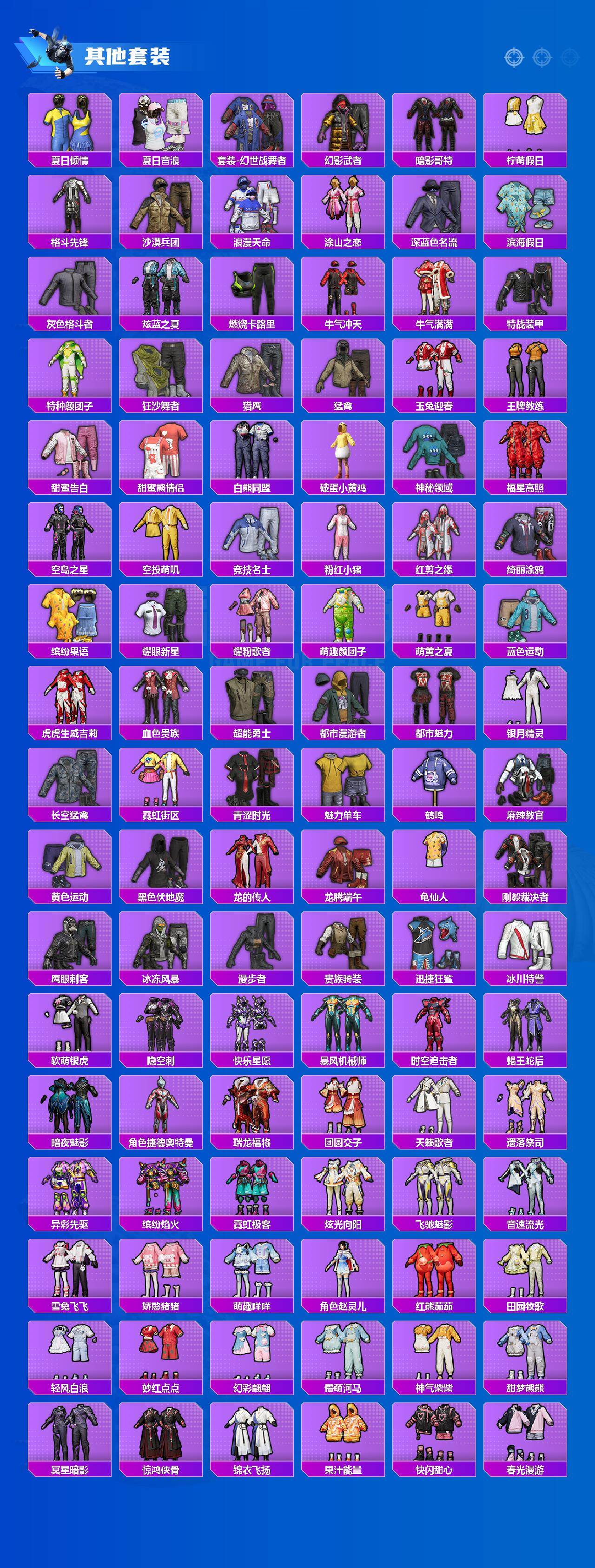 【粉色套装】:粉装-怪诞乔克,粉装-宝贝奶油派,粉装-天使彩虹糖,粉装-雪国幻梦,粉装-金属狂野,粉装-智能音符,粉装-极致幻想,粉装-绚金战神,粉装-碧影闪光,女娲后裔-赵灵儿,角色-宙之时溯,角色-圣堂之誓,角色-小叽联名款,角色-烟云彩露,角色-智耀战神,角色-幻海仙踪,粉装-星穹咏叹调