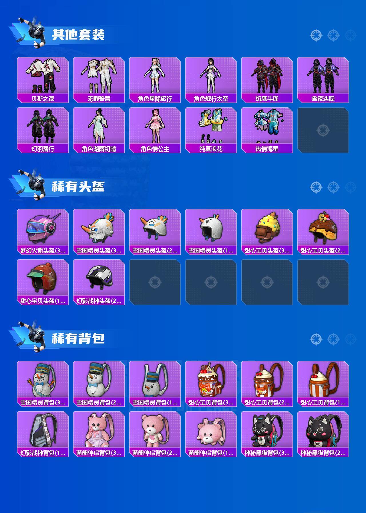 【稀有套装】:套装-龟仙人,套装-巳巳如意,套装-雏菊兔兔,套装-萝兰蝴蝶,套装-糖糖葫芦,套装-青团波波,角色-俏兔智灵,套装-燕燕于飞,套装-鱼渊荷华,角色-海琴烟,套装-闪电轻猫,套装-粉恋花,套装-紫幽梦,套装-蓝冰羽,角色-猎影月神,角色-幽澜祭