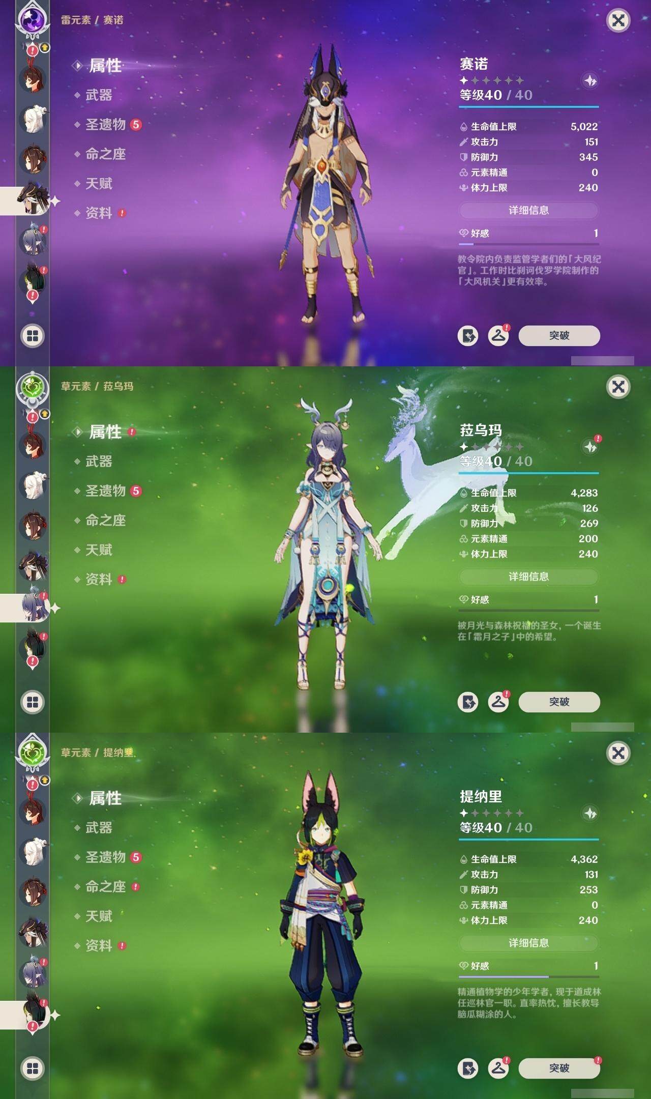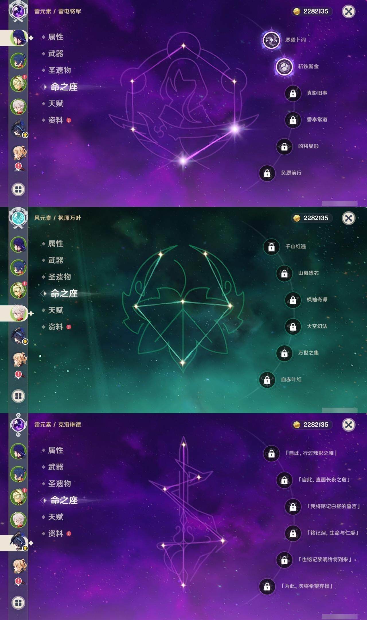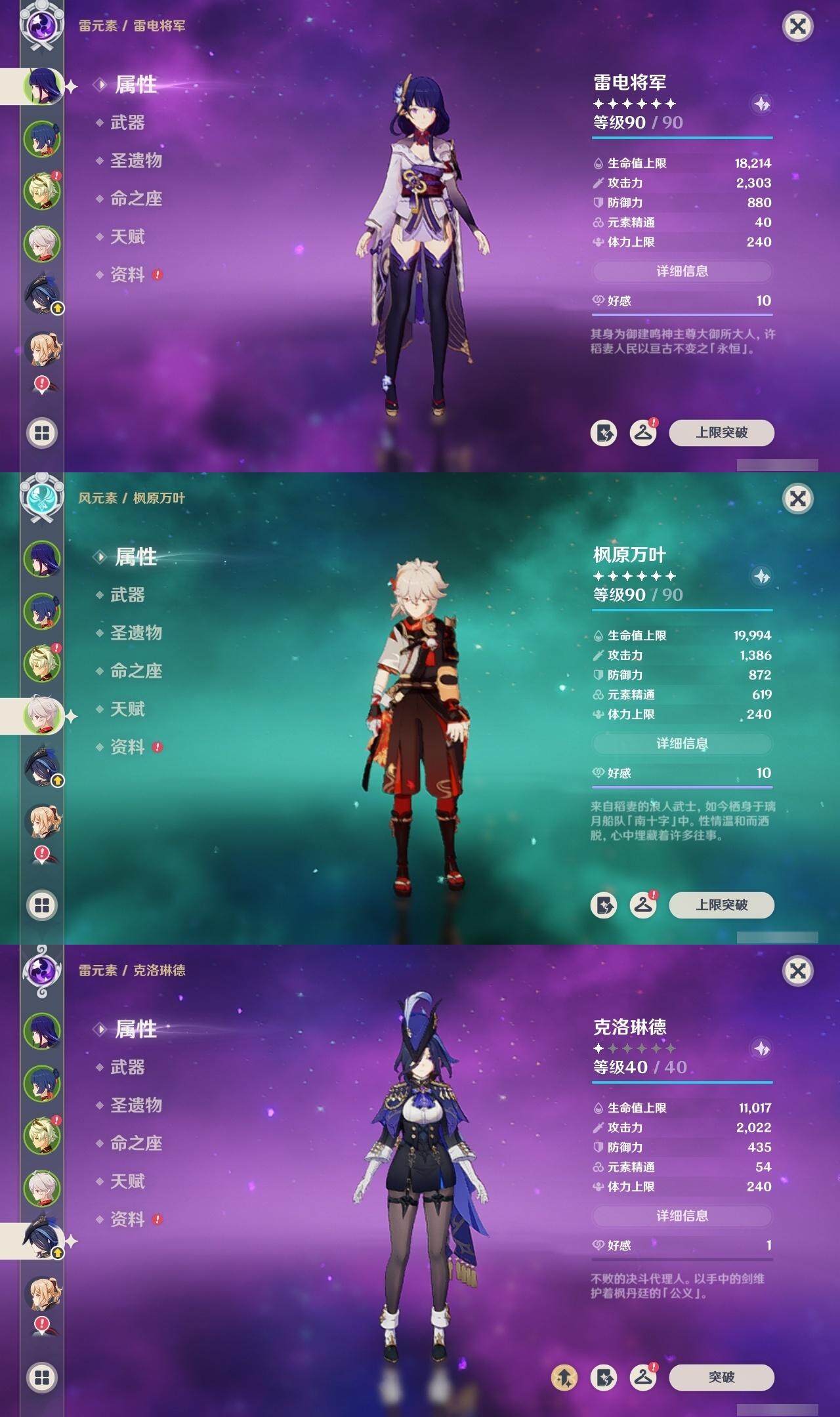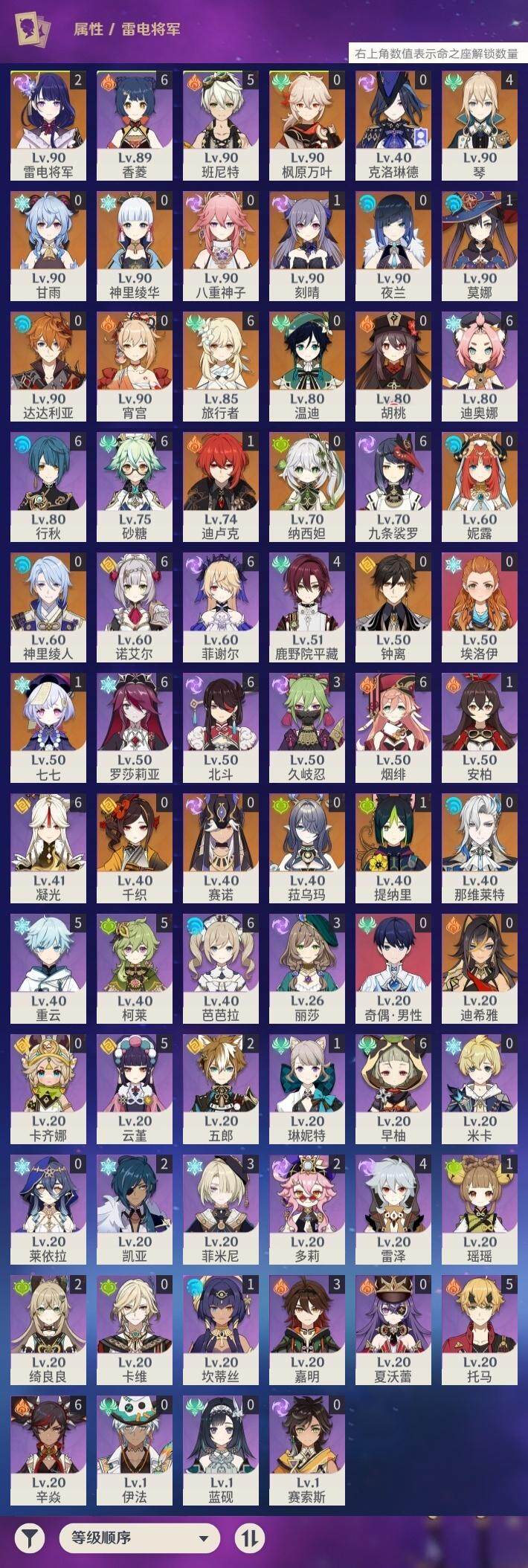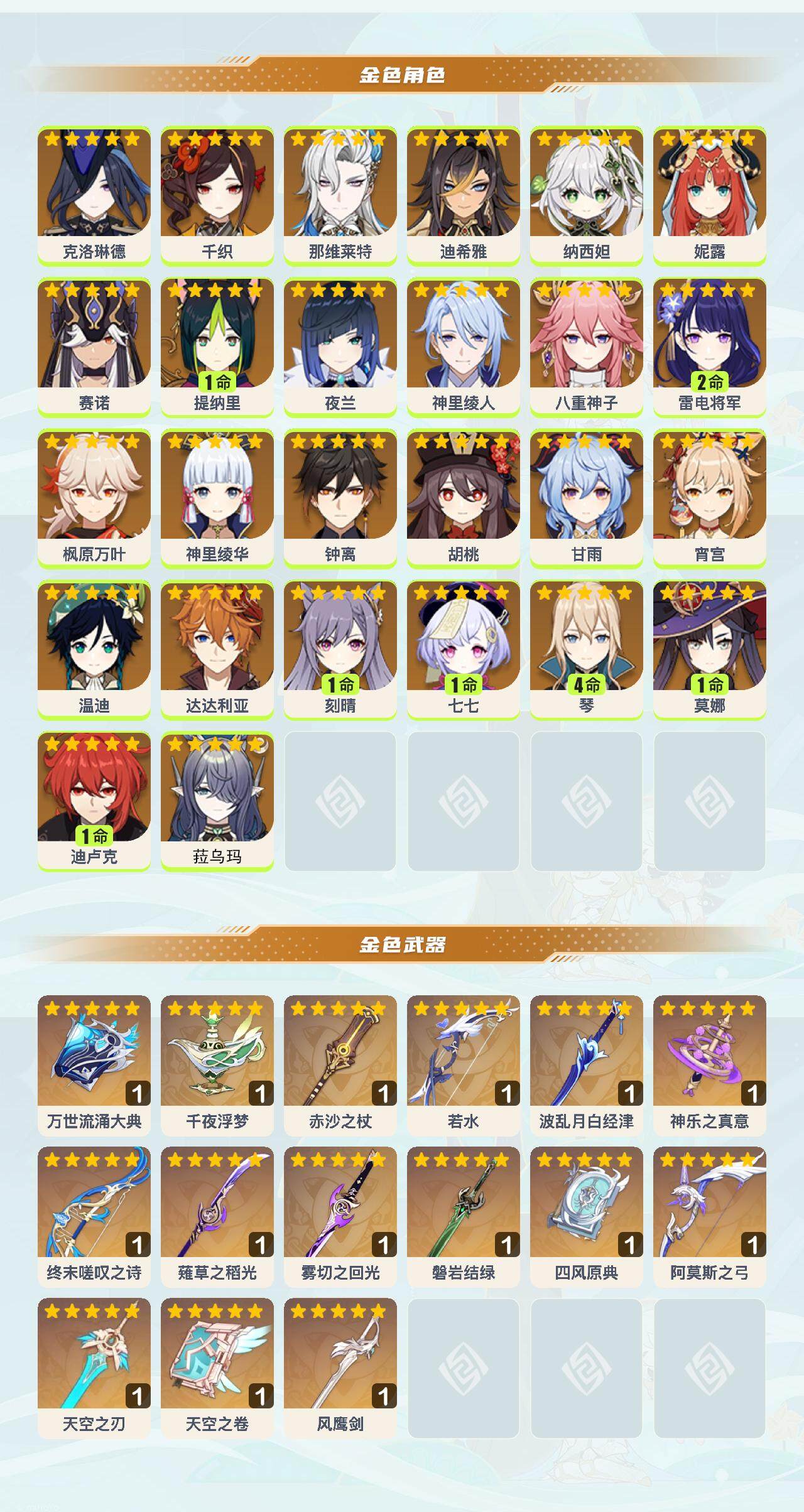 0命克洛琳德,0命千织,0命那维莱特,0命迪希雅,0命纳西妲,0命妮露,0命赛诺,1命提纳里,0命夜兰,0命神里绫人,0命八重神子,2命雷电将军,0命枫原万叶,0命神里绫华,0命钟离,0命胡桃,0命甘雨,0命宵宫,0命温迪,0命达达利亚,1命刻晴,1命七七,4命琴,1命莫娜,1命迪卢克,0命菈乌玛,精1万世流涌大典,精1千夜浮梦,精1赤沙之杖,精1若水,精1波乱月白经津,精1神乐之真意,精1终末嗟叹之诗,精1薙草之稻光,精1雾切之回光,精1磐岩结绿,精1四风原典,精1阿莫斯之弓,精1天空之刃,精1天空之卷,精1风鹰剑