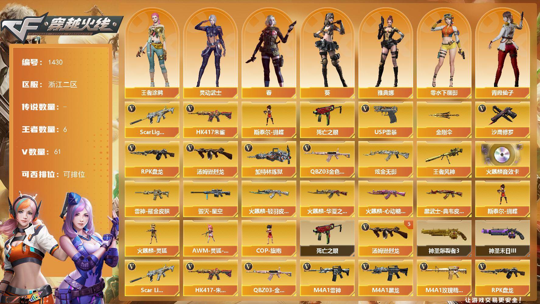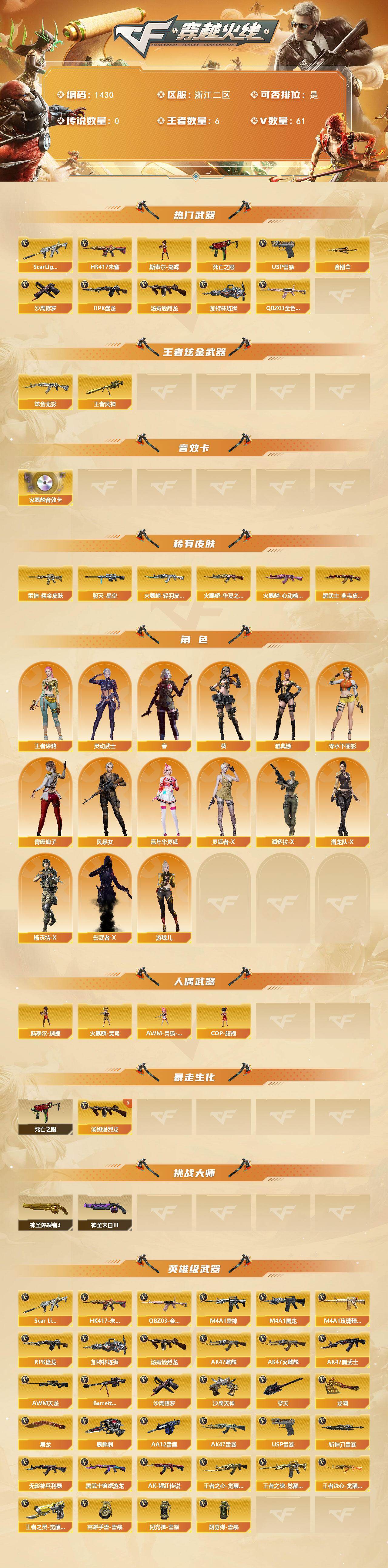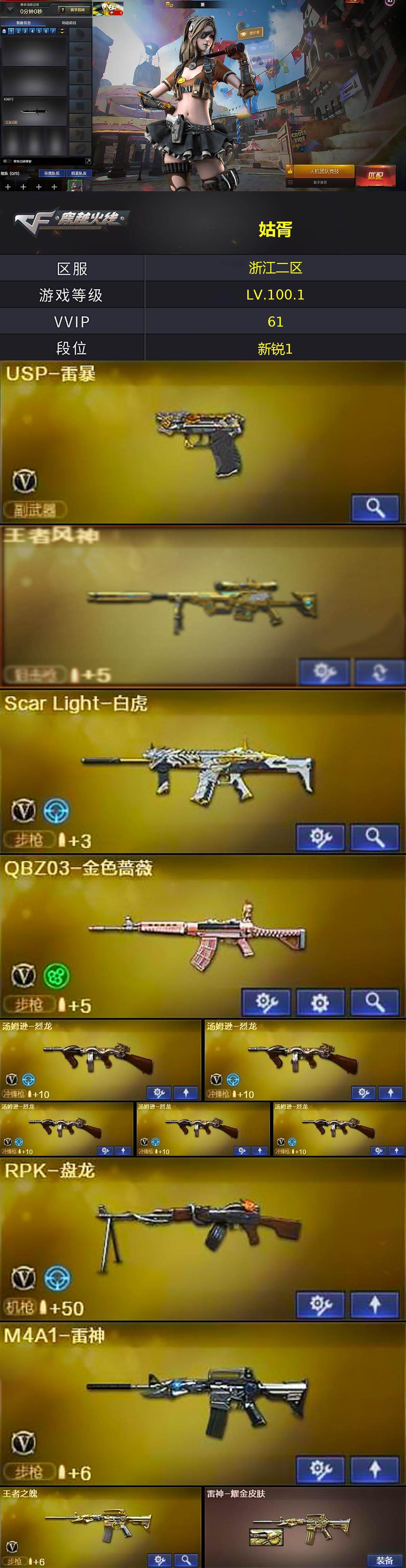 [15470461]浙江二区-61V-6王者-1炫金 【热门武器】:QBZ03-金色蔷薇,Scar Light-白虎,HK417-朱雀,死亡之眼,汤姆逊-烈龙*5,RPK-盘龙,加特林-炼狱,斯泰尔-蝴蝶,USP-雷暴,沙鹰-修罗,金刚伞 【王者炫金武器】:王者风神,炫金无影 【音效卡】:AK47-火麒麟音效卡 【皮肤】:雷神-耀金皮肤,火麒麟-华夏之心,火麒麟-轻羽皮肤,火麒麟-心动糖果,毁灭-星空,黑武士-典韦皮肤 【角色】:葵,春,王者涂鸦,风暴女,嘉年华灵狐,灵动武士,零-水下丽影,灵狐者-X,潘多拉-X,潜龙队-X,青霞仙子,斯沃特-X,影武者-X,游珑儿,雅典娜 【人偶武器】:火麒麟-灵狐,斯泰尔-蝴蝶,AWM-灵狐-15周年嘉年华,COP-旗袍 【暴走生化】:死亡之眼 【挑战大师】:神圣爆裂者III,神圣爆裂者-末日III 【英雄级武器】:AK47-火麒麟*2,AK47-麒麟,M4A1-黑龙,M4A1-雷神,AK47-黑武士,AK47-雷暴,HK417-朱雀,Scar Light-白虎,无影-神兵利器,黑武士-锦绣游龙,M4A1-玫瑰精灵,QBZ03-金色蔷薇,王者之心-觉醒版,王者之魄-觉醒版,AK-47-猩红传说,王者炎心-觉醒版,AWM-天龙*2,Barrett-毁灭,RPK-盘龙,加特林-炼狱,汤姆逊-烈龙*5,AA-12-雷霆,沙鹰-修罗,沙鹰-天神*2,USP-雷暴,王者之灵-觉醒版,屠龙*2,龙啸,擎天,麒麟刺,斩神刀-雷暴,高爆手雷-雷暴*7,闪光弹-雷暴*7,烟雾弹-雷暴*7 【道具】:虎牙炫彩背包,超级背包,哔哩哔哩名片,生化弹匣,夺命之镰,防化服,星辰流光-枪王排位,枪王排位28赛季金色流光,枪王排位29赛季金色流光,斯沃特表情,循环实验表情,防弹头盔*2,防弹衣*3,C4工具钳*2,手雷包 【特殊枪械】:蝴蝶斯泰尔+5烈龙,1白虎,5烈龙,1盘龙,1炼狱,1蝴蝶斯泰尔