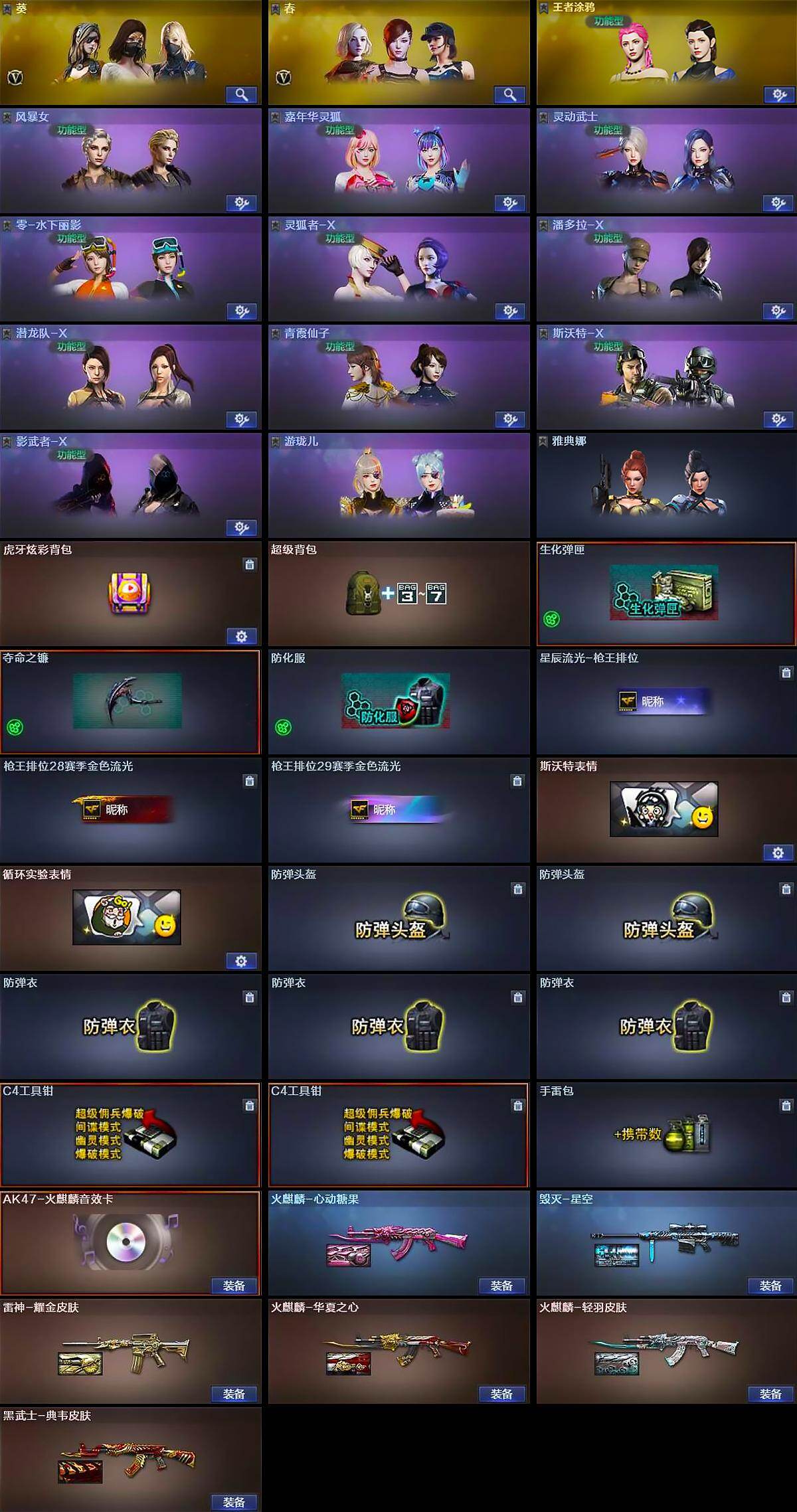 【道具】:虎牙炫彩背包,超级背包,哔哩哔哩名片,生化弹匣,夺命之镰,防化服,星辰流光-枪王排位,枪王排位28赛季金色流光,枪王排位29赛季金色流光,斯沃特表情,循环实验表情,防弹头盔*2,防弹衣*3,C4工具钳*2,手雷包