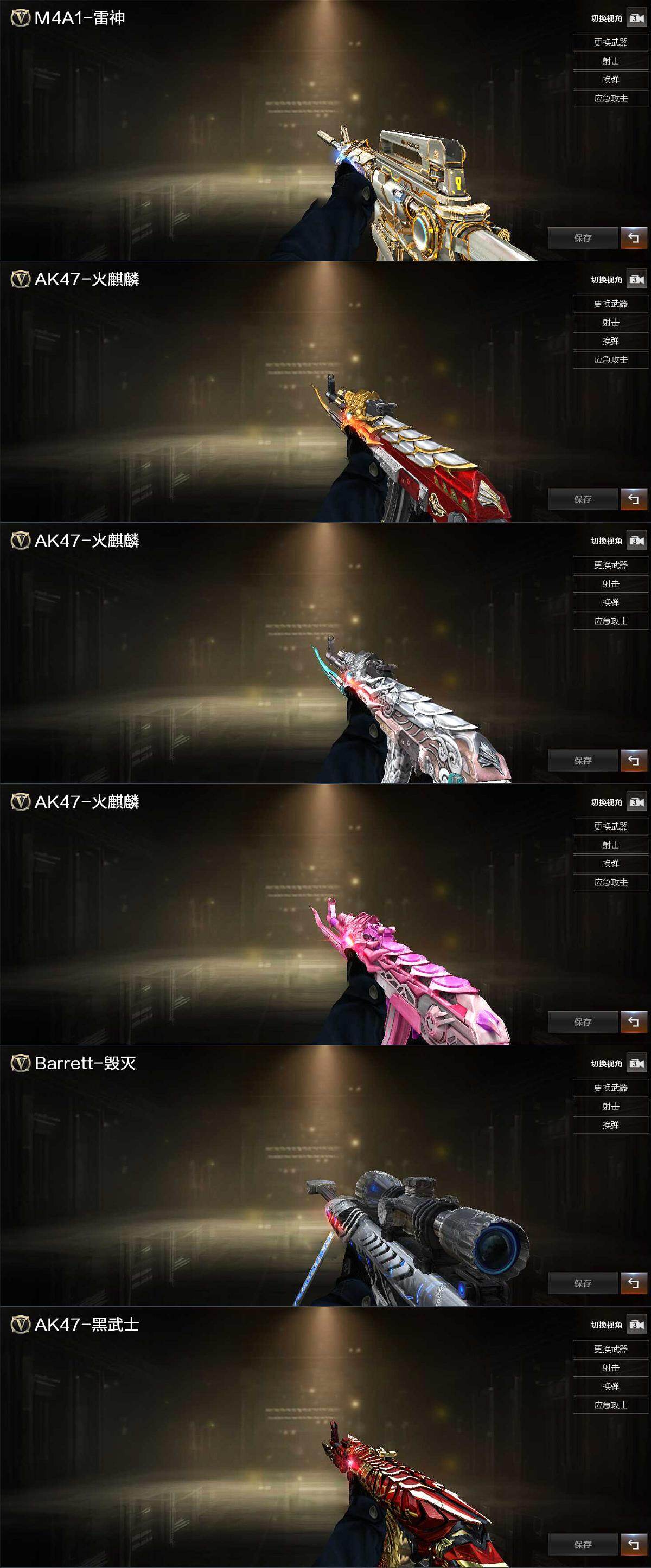 【热门武器】:QBZ03-金色蔷薇,Scar Light-白虎,HK417-朱雀,死亡之眼,汤姆逊-烈龙*5,RPK-盘龙,加特林-炼狱,斯泰尔-蝴蝶,USP-雷暴,沙鹰-修罗,金刚伞