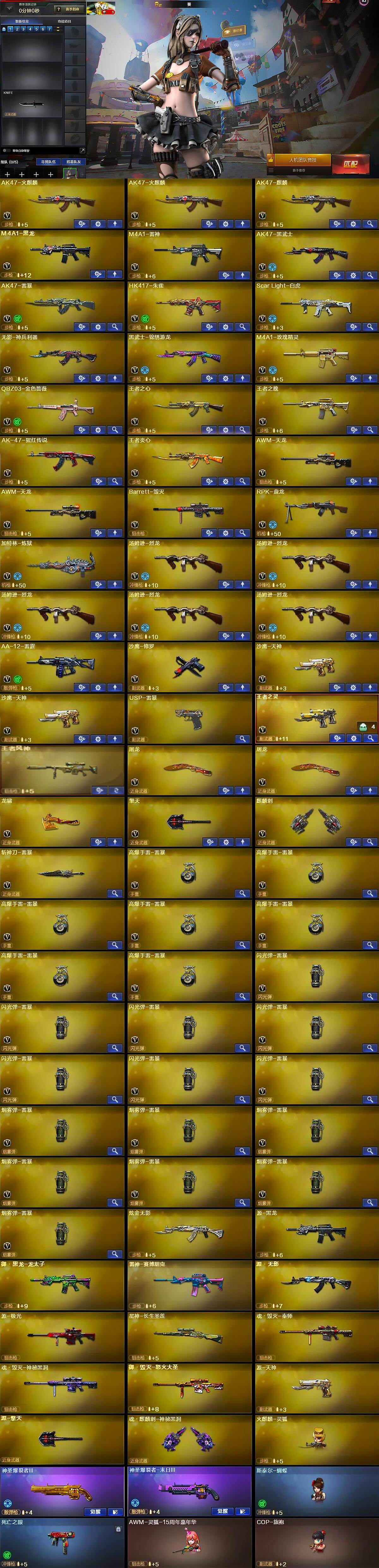【英雄级武器】:AK47-火麒麟*2,AK47-麒麟,M4A1-黑龙,M4A1-雷神,AK47-黑武士,AK47-雷暴,HK417-朱雀,Scar Light-白虎,无影-神兵利器,黑武士-锦绣游龙,M4A1-玫瑰精灵,QBZ03-金色蔷薇,王者之心-觉醒版,王者之魄-觉醒版,AK-47-猩红传说,王者炎心-觉醒版,AWM-天龙*2,Barrett-毁灭,RPK-盘龙,加特林-炼狱,汤姆逊-烈龙*5,AA-12-雷霆,沙鹰-修罗,沙鹰-天神*2,USP-雷暴,王者之灵-觉醒版,屠龙*2,龙啸,擎天,麒麟刺,斩神刀-雷暴,高爆手雷-雷暴*7,闪光弹-雷暴*7,烟雾弹-雷暴*7