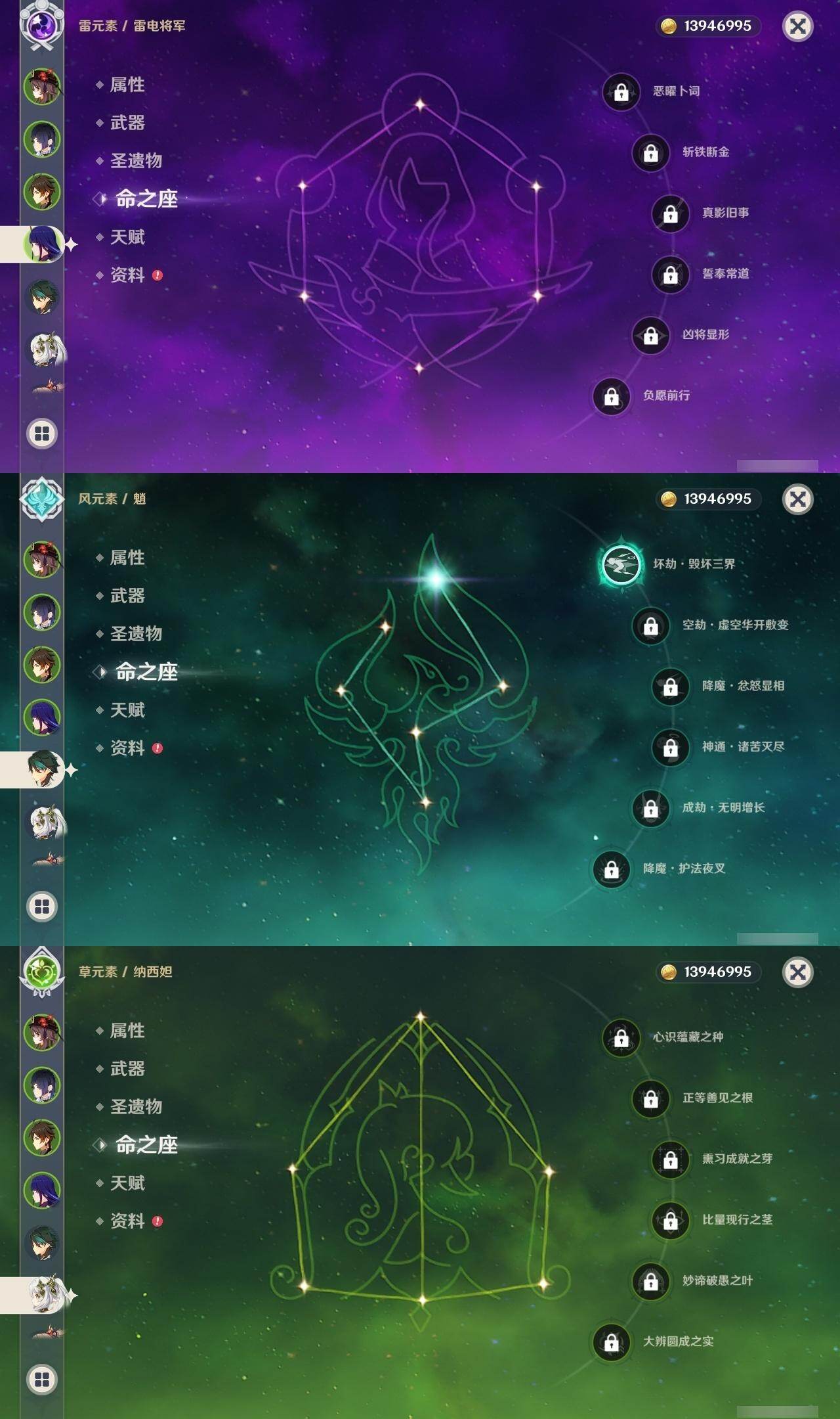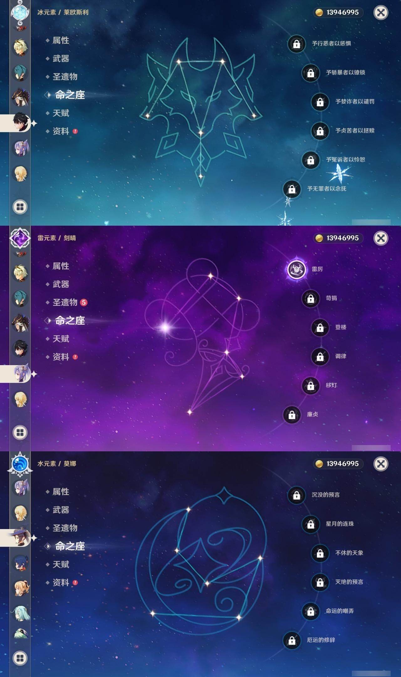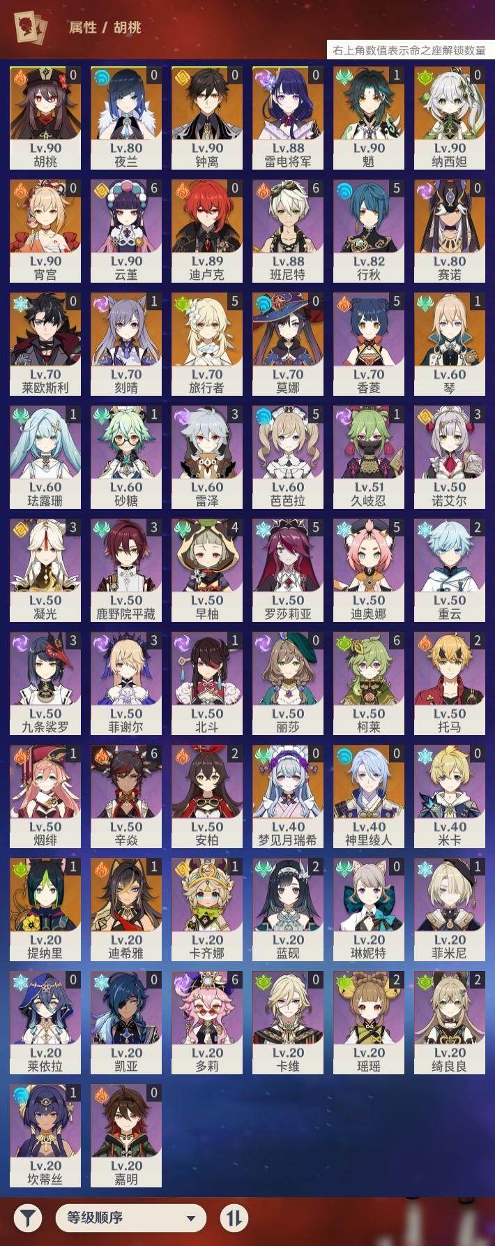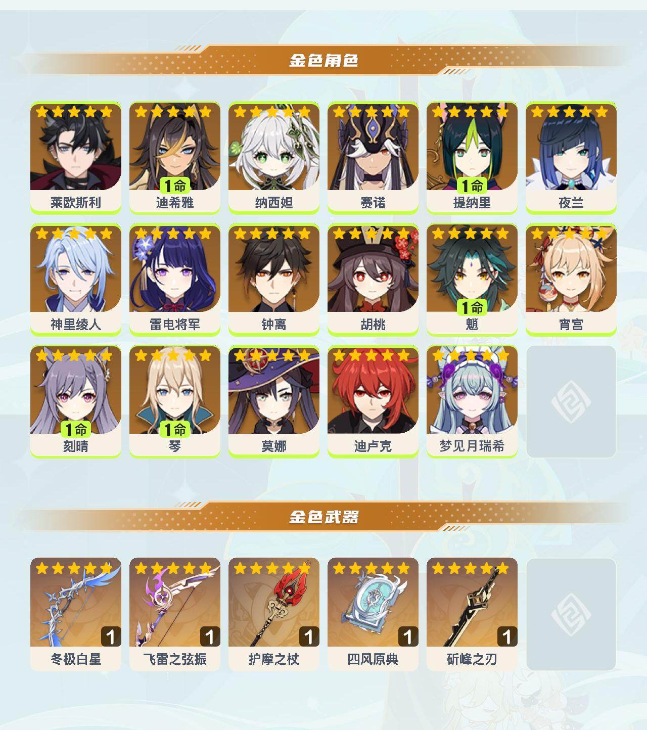 0命莱欧斯利,1命迪希雅,0命纳西妲,0命赛诺,1命提纳里,0命夜兰,0命神里绫人,0命雷电将军,0命钟离,0命胡桃,1命魈,0命宵宫,1命刻晴,1命琴,0命莫娜,0命迪卢克,0命梦见月瑞希,精1冬极白星,精1飞雷之弦振,精1护摩之杖,精1四风原典,精1斫峰之刃