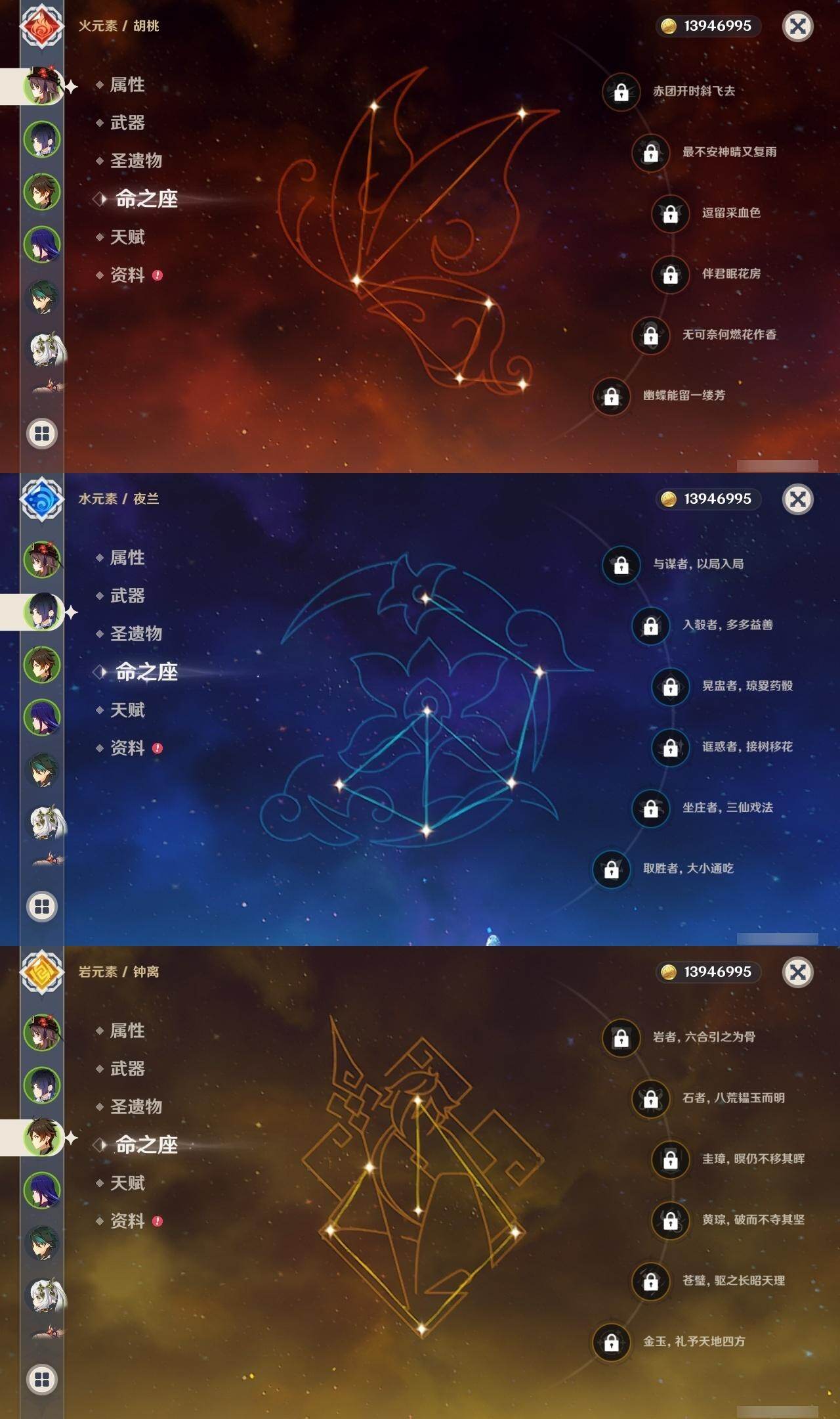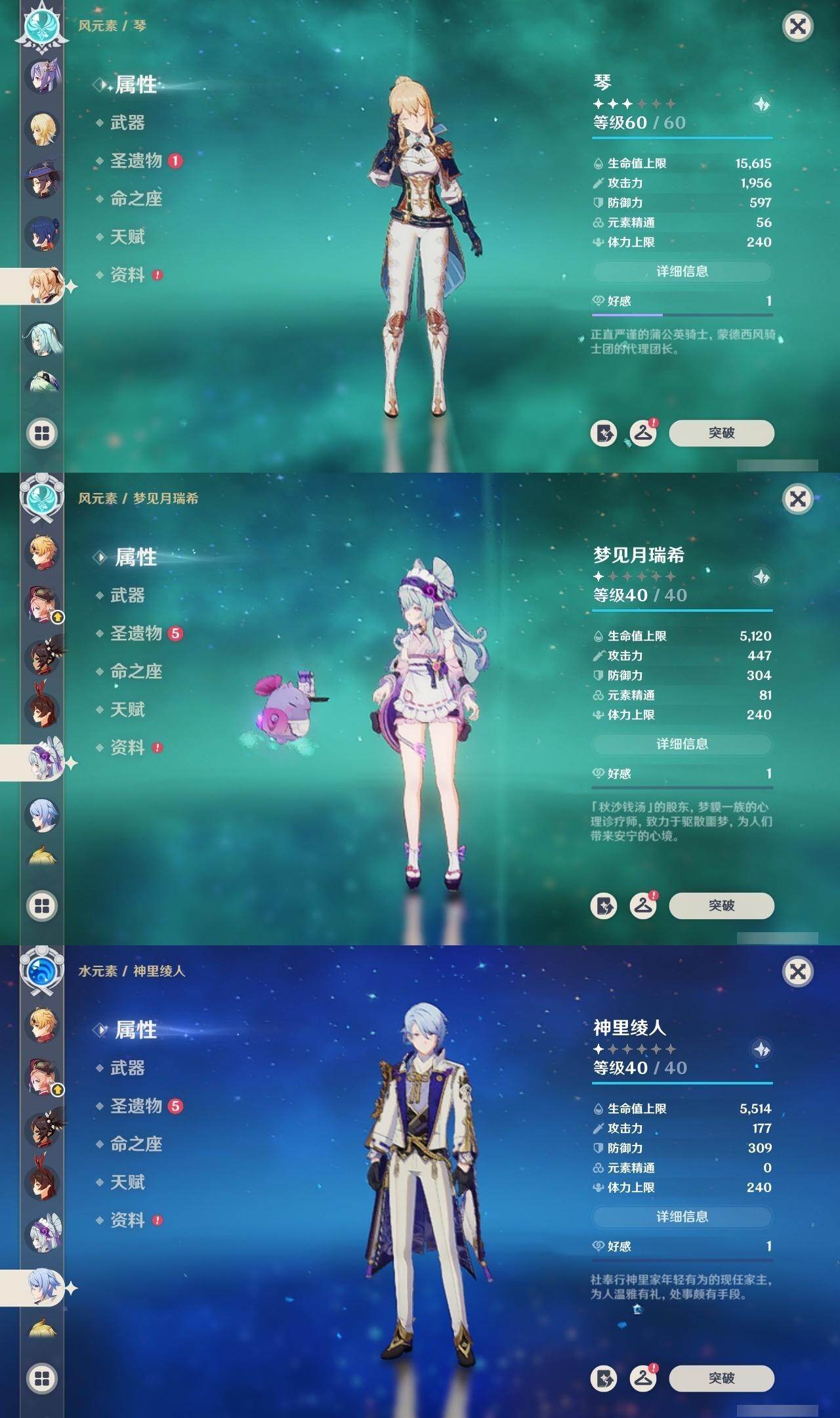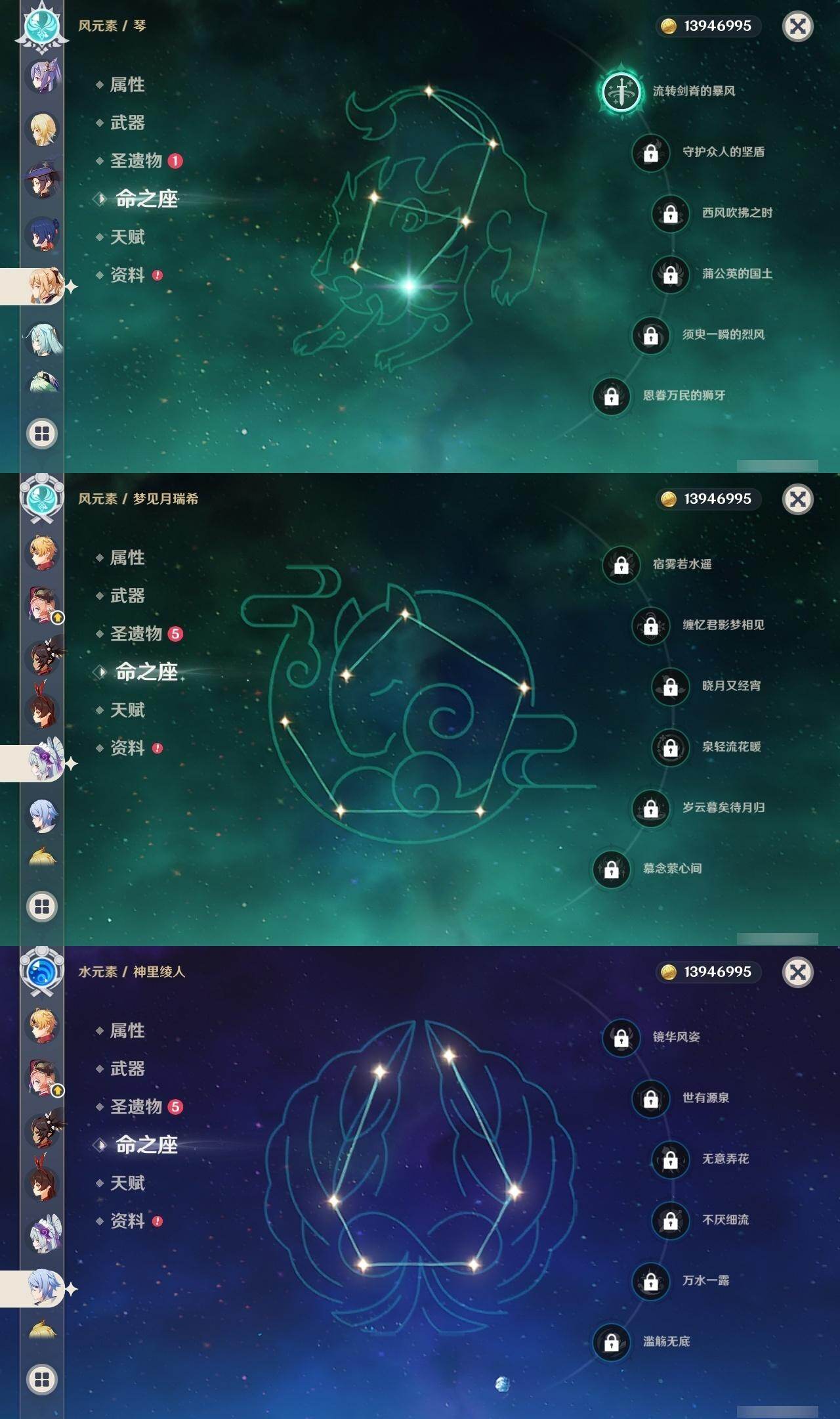 0命莱欧斯利,1命迪希雅,0命纳西妲,0命赛诺,1命提纳里,0命夜兰,0命神里绫人,0命雷电将军,0命钟离,0命胡桃,1命魈,0命宵宫,1命刻晴,1命琴,0命莫娜,0命迪卢克,0命梦见月瑞希,精1冬极白星,精1飞雷之弦振,精1护摩之杖,精1四风原典,精1斫峰之刃