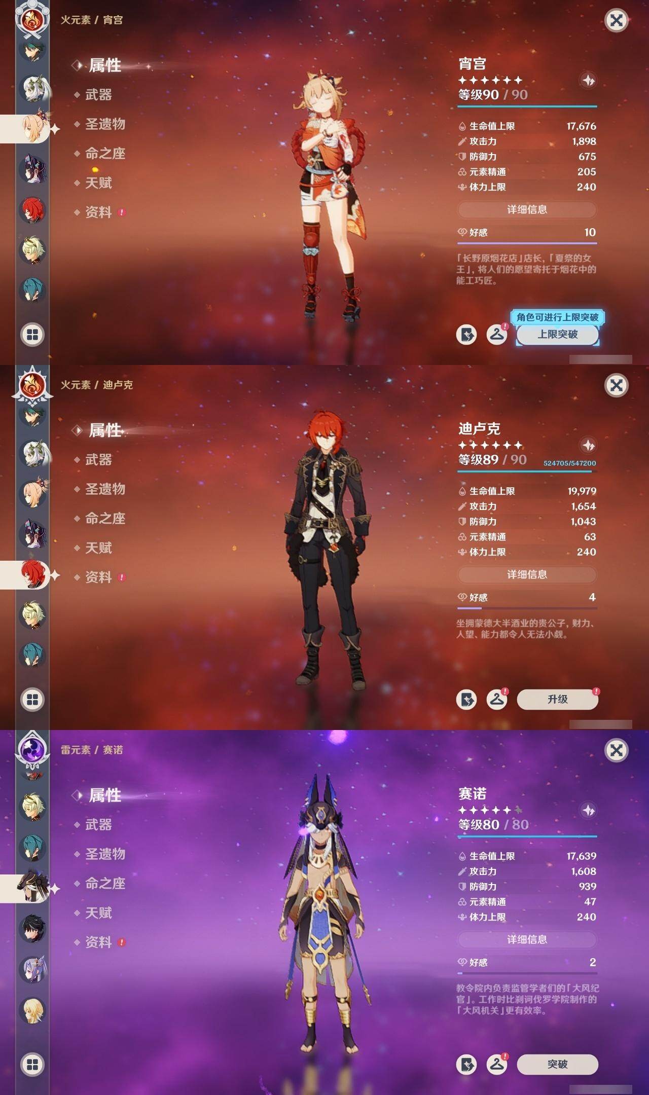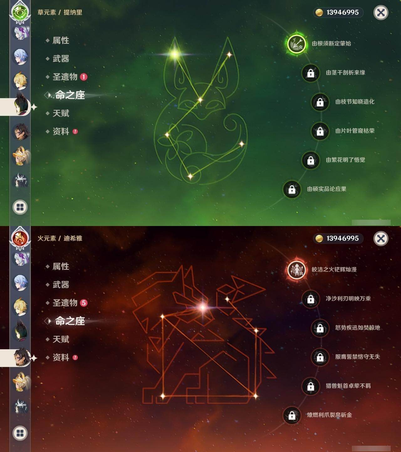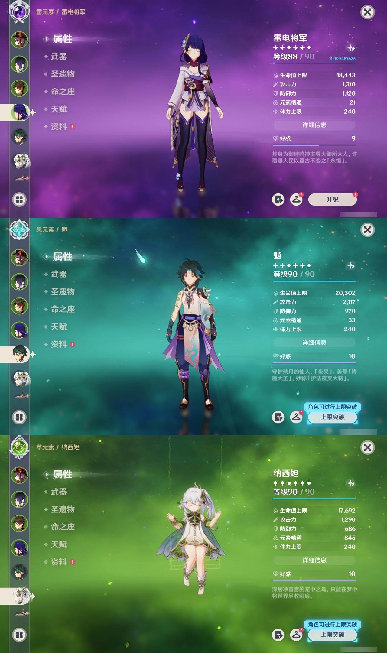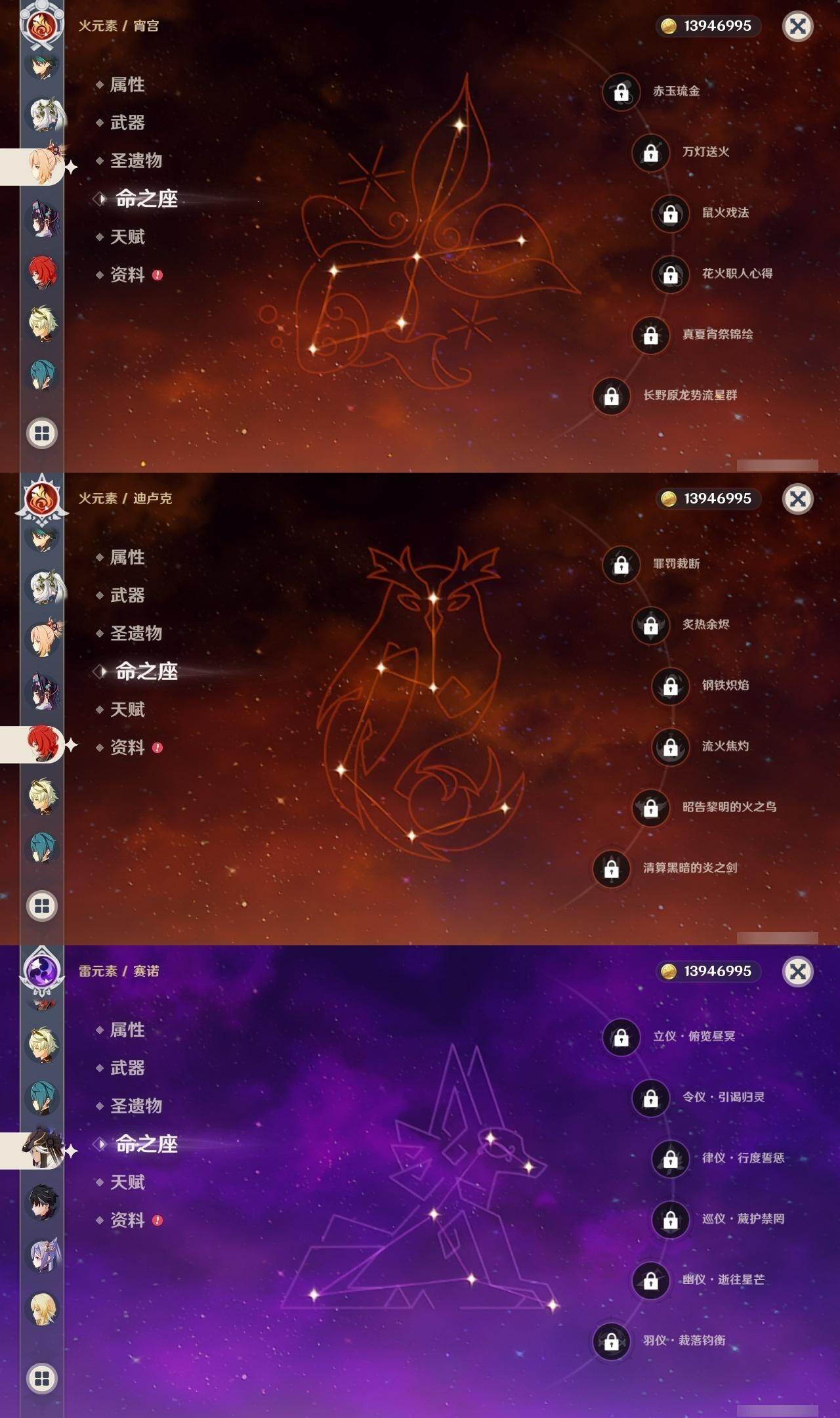 0命莱欧斯利,1命迪希雅,0命纳西妲,0命赛诺,1命提纳里,0命夜兰,0命神里绫人,0命雷电将军,0命钟离,0命胡桃,1命魈,0命宵宫,1命刻晴,1命琴,0命莫娜,0命迪卢克,0命梦见月瑞希,精1冬极白星,精1飞雷之弦振,精1护摩之杖,精1四风原典,精1斫峰之刃