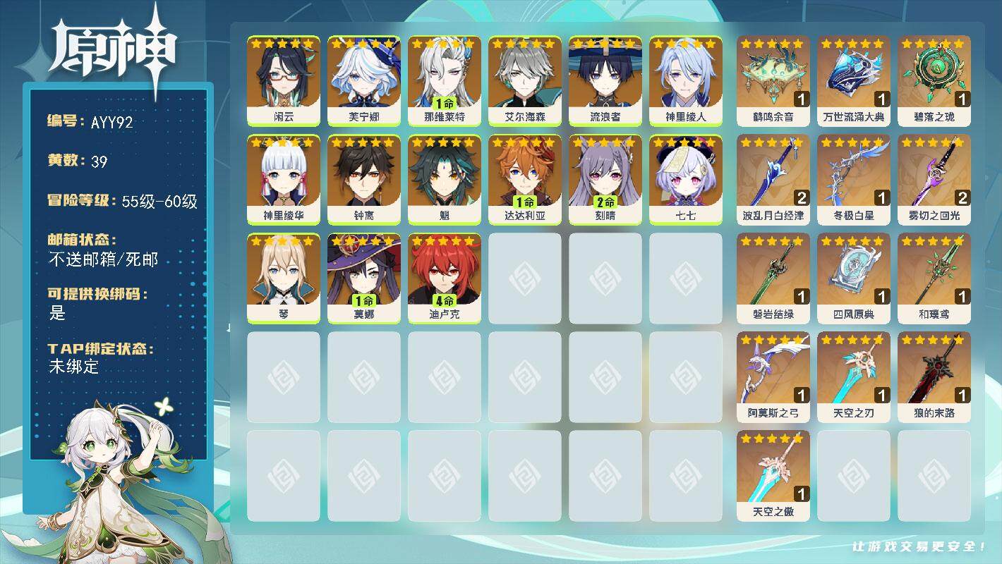 [15619317]59级/39黄/女主/15个五星角色/13个五星武器 0命闲云,0命芙宁娜,1命那维莱特,0命艾尔海森,0命流浪者,0命神里绫人,0命神里绫华,0命钟离,0命魈,1命达达利亚,2命刻晴,0命七七,0命琴,1命莫娜,4命迪卢克,精1鹤鸣余音,精1万世流涌大典,精1碧落之珑,精2波乱月白经津,精1冬极白星,精2雾切之回光,精1磐岩结绿,精1四风原典,精1和璞鸢,精1阿莫斯之弓,精1天空之刃,精1狼的末路,精1天空之傲