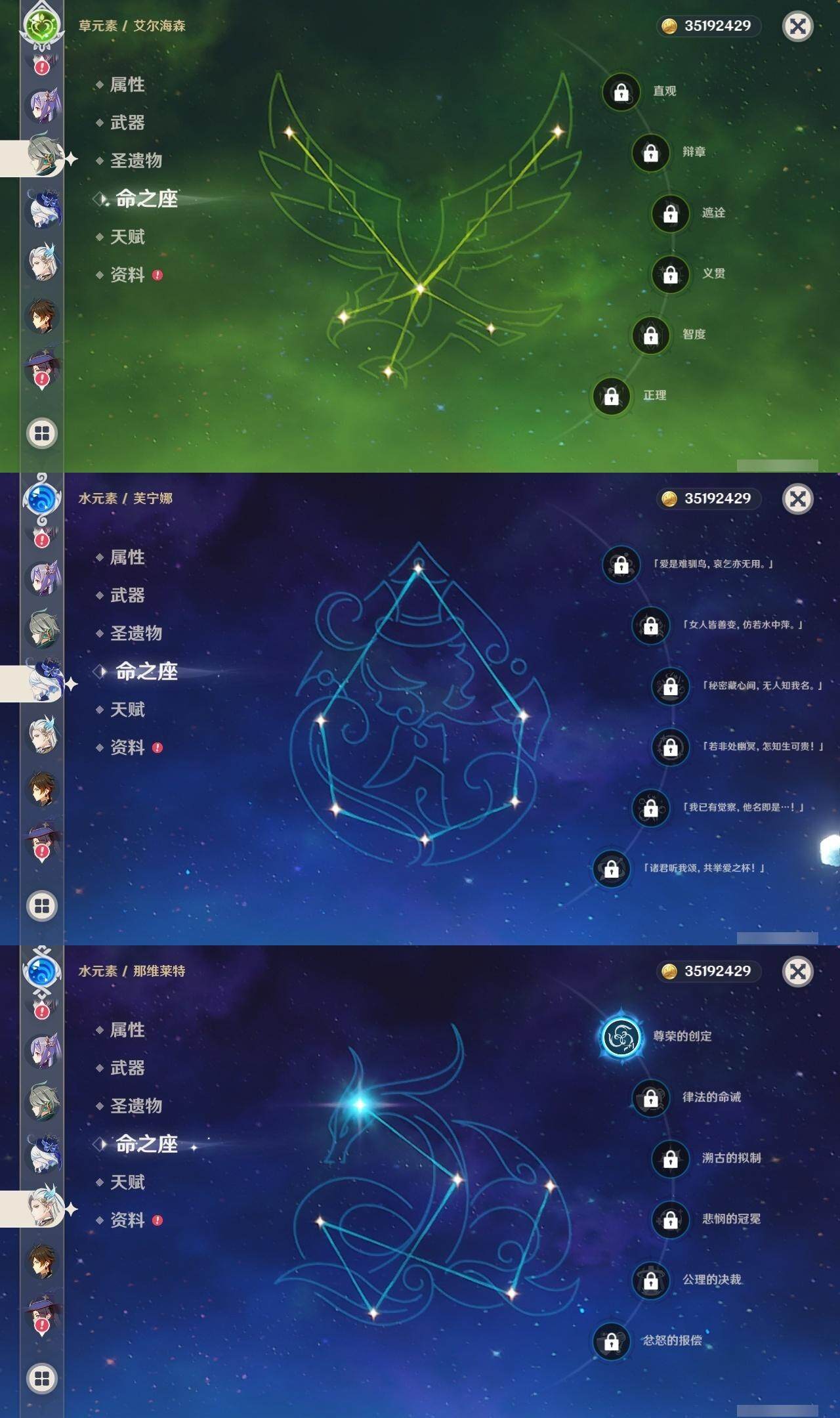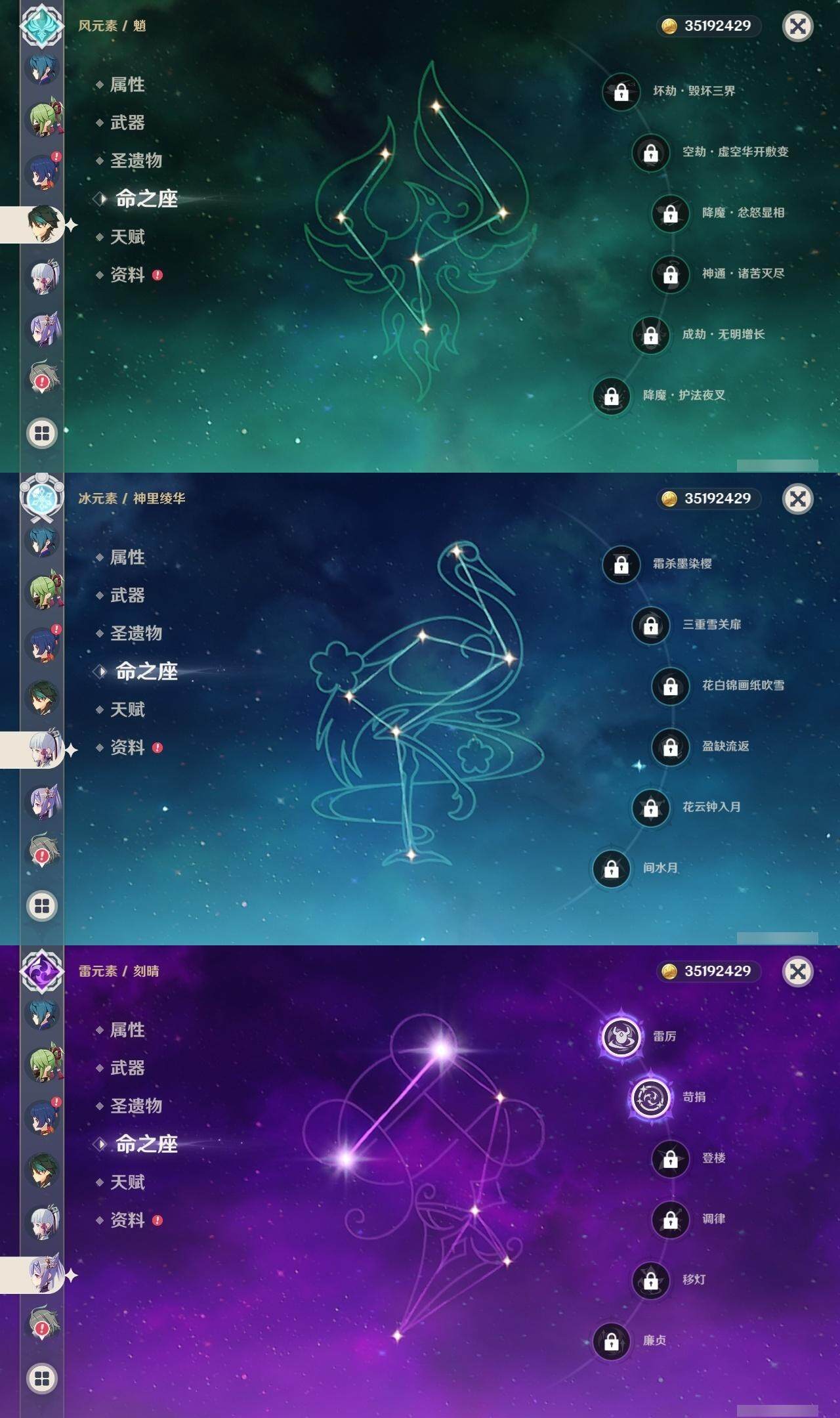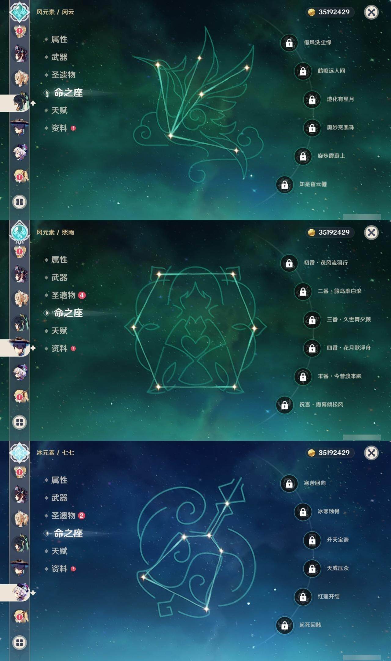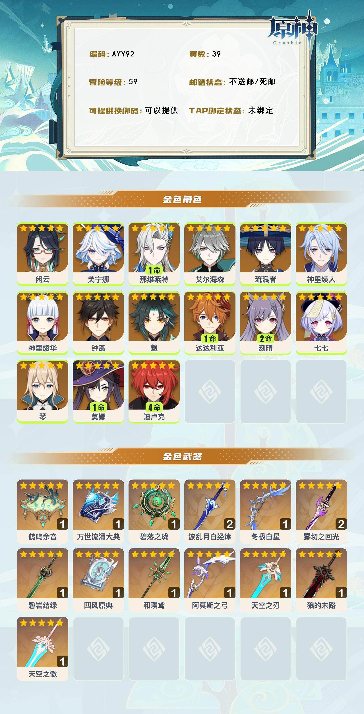0命闲云,0命芙宁娜,1命那维莱特,0命艾尔海森,0命流浪者,0命神里绫人,0命神里绫华,0命钟离,0命魈,1命达达利亚,2命刻晴,0命七七,0命琴,1命莫娜,4命迪卢克,精1鹤鸣余音,精1万世流涌大典,精1碧落之珑,精2波乱月白经津,精1冬极白星,精2雾切之回光,精1磐岩结绿,精1四风原典,精1和璞鸢,精1阿莫斯之弓,精1天空之刃,精1狼的末路,精1天空之傲