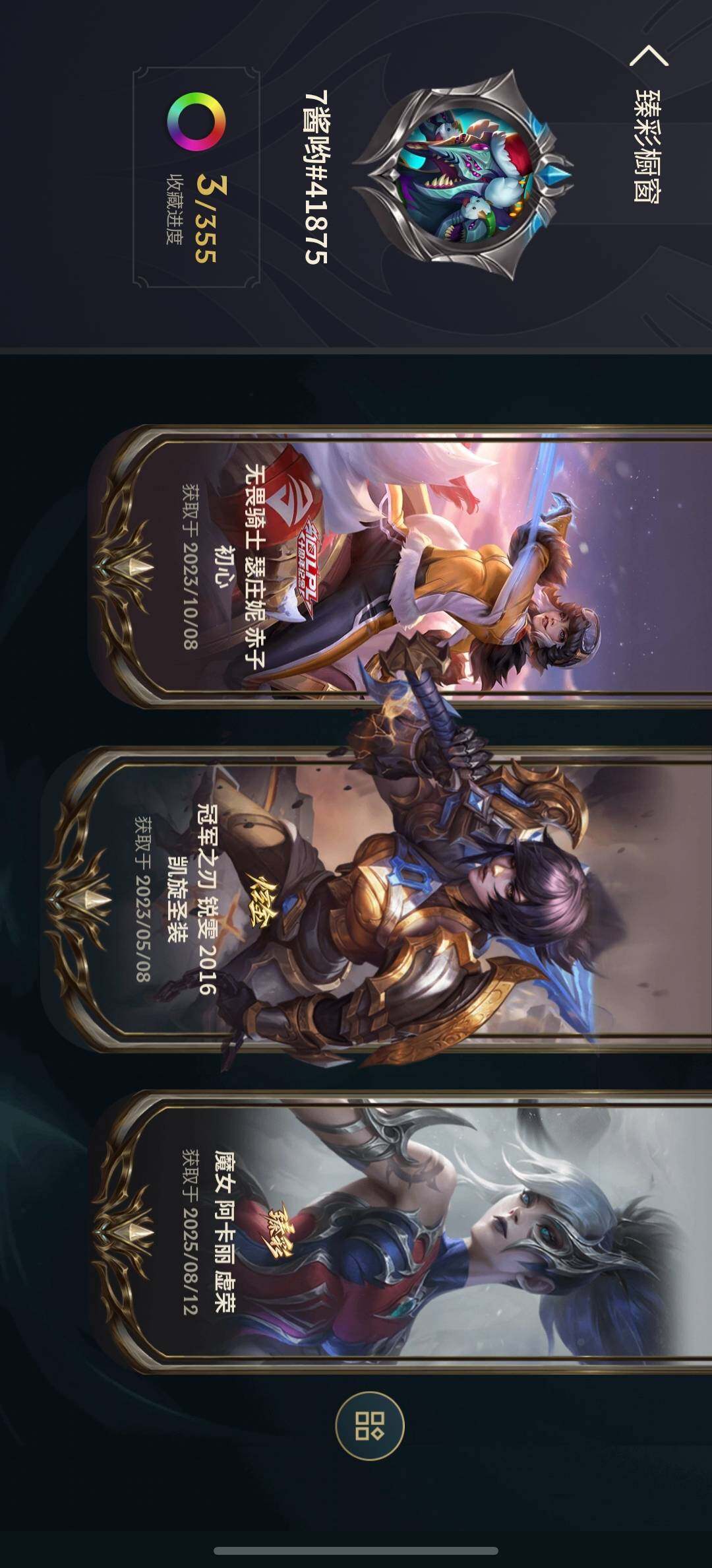 【至臻皮肤】:至臻绝息圣堂厄运小姐,至臻女帝黛安娜,至臻黑夜使者凯隐,至臻墨之影武者亚索,至臻斗魂觉醒派克
