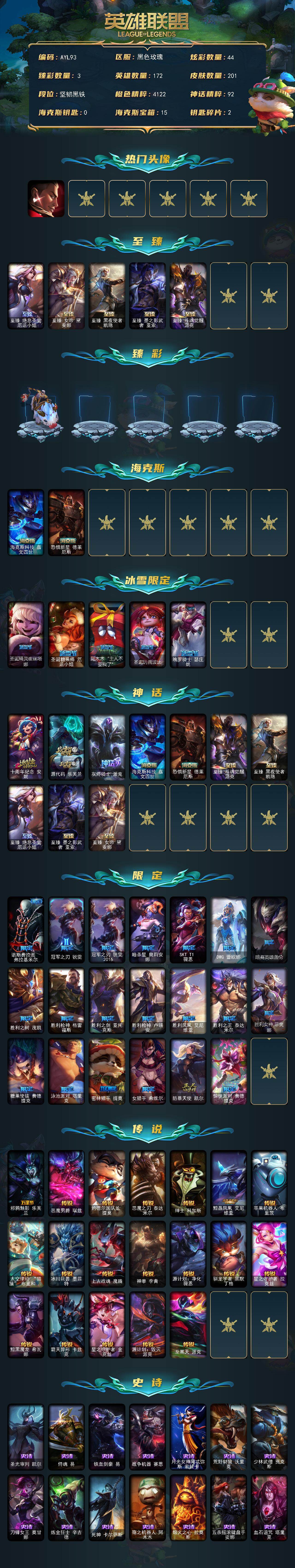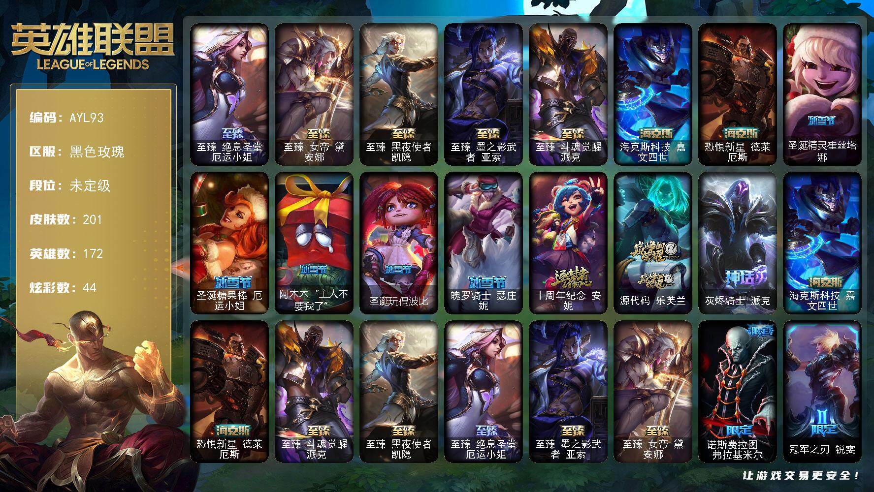 [15576164]【店主推荐捡漏号!可直接换绑】未定级段位-172英雄-201皮肤-44炫彩-0终极-10神话-25限定-19传说-52史诗