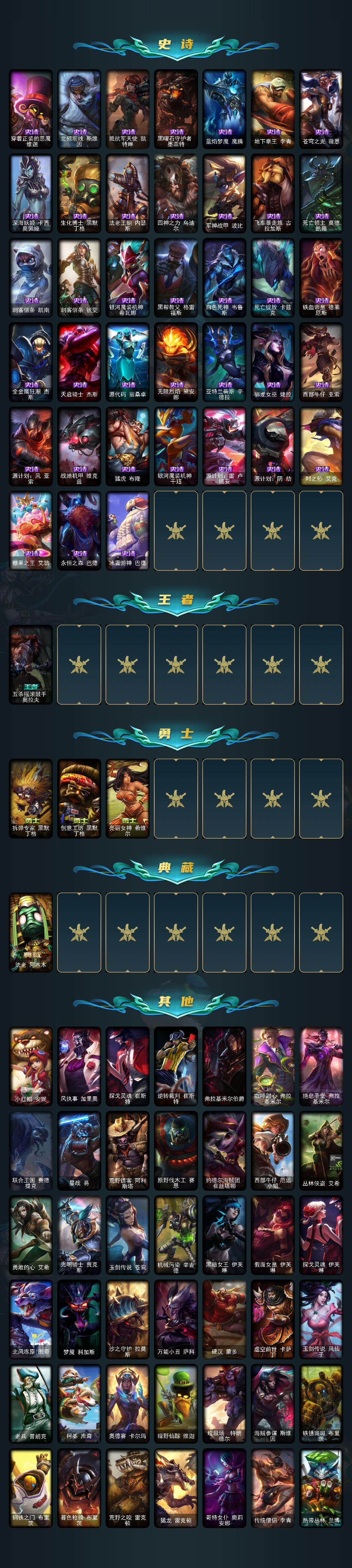 【史诗皮肤】:圣光审判凯尔,侍魂易,铁血剑豪易,战争机器赛恩,月光女神阿忒弥斯索拉卡,荒野豺狼沃里克,少林武僧贾克斯,刀锋女王莫甘娜,炼金狂士辛吉德,死神卡尔萨斯,殇之机器人阿木木,熔火之心拉莫斯,五杀摇滚键盘手娑娜,血石诅咒塔里克,穿着正装的恶魔维迦,北领前线斯维因,抵抗军天使凯特琳,黑曜石守护者墨菲特,蓝焰梦魔魔腾,地下拳王李青,苍穹之光薇恩,深海妖姬卡西奥佩娅,生化博士黑默丁格,法老王朝内瑟斯,四神之力乌迪尔,军神战甲波比,飞车暴走族古拉加斯,死亡领主莫德凯撒,刺客信条凯南,刺客信条锐雯,银河魔装机神希瓦娜,黑帮教父格雷福斯,白色死神韦鲁斯,死亡绽放卡兹克,铁血帝皇德莱厄斯,全金属狂潮杰斯,天启骑士杰斯,源代码丽桑卓,