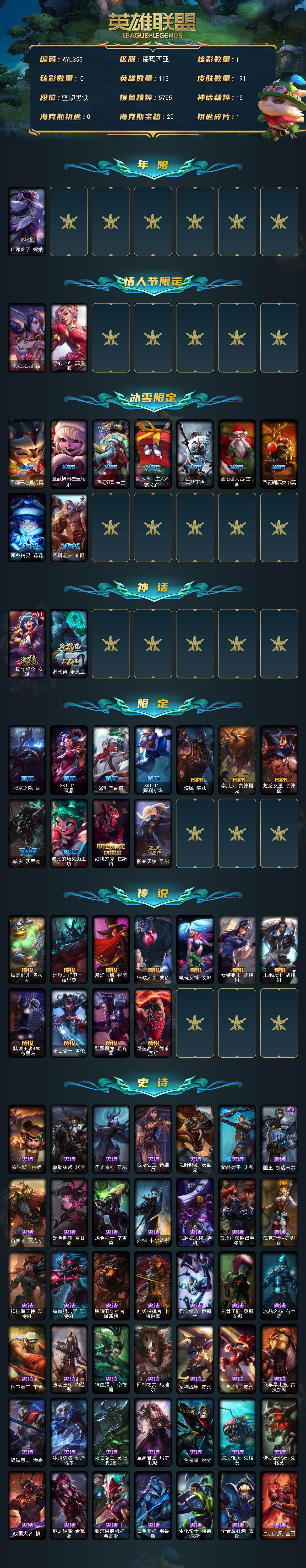 - [15155026]可二次【店主推荐捡漏号!可直接换绑】 黄金段位-172英雄-329皮肤-71炫彩-0终极-6神话-60限定-31传说-84史诗 【臻彩皮肤】:吕布奉先炫金战神 【年限皮肤】:银龙裁决泰隆,古琴余韵娑娜 【海克斯皮肤】:海克斯科技斯维因,摄魂使者薇恩,恐惧新星德莱厄斯 【情人节限定】:水晶玫瑰斯维因 【冰雪限定】:幸福女神乐芙兰,圣诞开心鬼提莫,圣诞精灵崔丝塔娜,圣诞糖果棒厄运小姐,胡桃夹子萨科,平安夜女神娑娜,邪恶圣诞老人维迦,夺命美人卡特琳娜,喜庆之树茂凯,雪默丁格,圣诞玩偶波比,圣诞老人古拉加斯,圣诞驯鹿克格莫,冰雪节辛吉德,冰雪女神辛德拉,冰雪兽纳尔 【神话皮肤】:十周年纪念安妮,源代码乐芙兰,神凰行者瑞羽圣凰艾尼维亚,海克斯科技斯维因,恐惧新星德莱厄斯,摄魂使者薇恩 【限定皮肤】:诺斯费拉图弗拉基米尔,冠军之刃锐雯,冠军典狱长锤石,冠军之血希瓦娜,冠军之刃锐雯2016,Fnatic古拉加斯,Fnatic嘉文四世,Fnatic卡尔萨斯,暗杀星努努和威朗普,暗杀星慎,SSW辛吉德,SSW图奇,SSW雷恩加尔,SKTT1雷克顿,SKTT1伊莉丝,勇敢的心德莱厄斯,胜利女神伊莉丝,胜利女神莫甘娜,胜利女神希维尔,胜利之树茂凯,胜利枪神格雷福斯,胜利女神奥莉安娜,胜利之剑亚托克斯,胜利枪神卢锡安,胜利机器人布里茨,胜利女神瑟庄妮,胜利凤凰艾尼维亚,南瓜头费德提克,灵魂收割者索拉卡,鬼影重重魔腾,鬼影森森茂凯,无头骑士赫卡里姆,魅惑女巫奈德丽,糖果使徒费德提克,泳池派对李青,女猎手希维尔,暗影沃里克,都铎王朝图奇,钢铁之翼艾尼维亚,防暴士兵辛吉德,防暴天使凯尔 【传说皮肤】:铁哥们儿奥拉夫,地狱之门卫士加里奥,魔幻卡牌崔斯特,邪鸦魅影乐芙兰,大天使长米迦勒凯尔,提莫约德尔人的一大步,欧米伽小队幽灵特工,合金巨兽努努和威朗普,源计划联合艾希,恶魔之刃泰达米尔,绅士科加斯,双重冰晶艾尼维亚,律政大亨蒙多,冰霜之刃艾瑞莉娅,红色男爵库奇,最终BOSS维迦,女警狙击凯特琳,未来战士凯特琳,冰川巨兽墨菲特,地狱行者孙悟空,第三类接触黑默丁格,驯龙学者黑默丁格,炼狱魔犬内瑟斯,屠龙勇士潘森,死亡骑士盖伦,钢铁军团盖伦,偶像歌手阿狸,宇航员诺提勒斯,灌篮高手德莱厄斯,神王德莱厄斯,蔷薇绅士杰斯 【史诗皮肤】:科学怪熊的新娘安妮,绞肉机角斗士赵信,翼骑统领赵信,摄魂男爵弗拉基米尔,