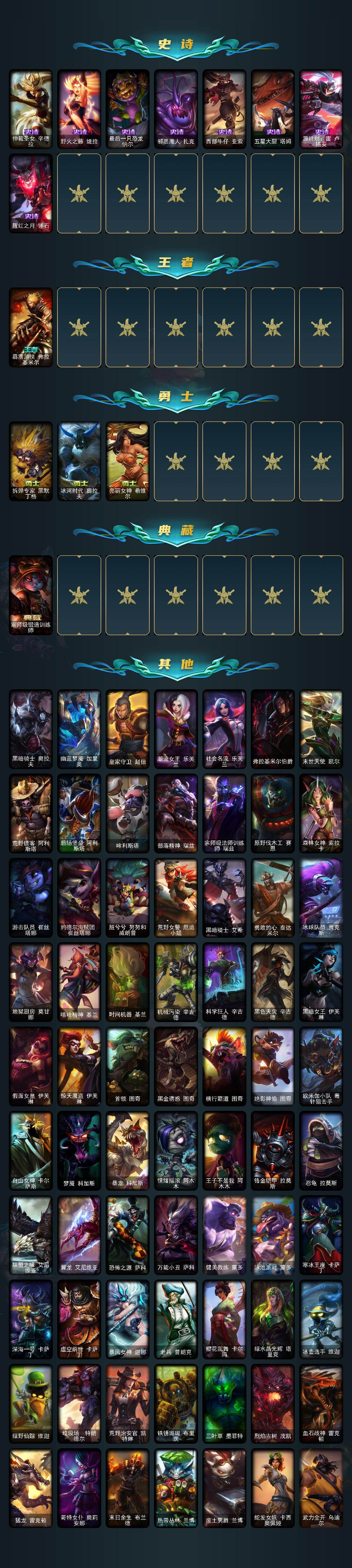 【史诗皮肤】:安伯斯与提妮,翼骑统领赵信,圣光审判凯尔,战场公主希维尔,荒野豺狼沃里克,紫晶射手艾希,国王泰达米尔,百夫长贾克斯,黑色荆棘莫甘娜,炼金狂士辛吉德,死神卡尔萨斯,飞越疯人院萨科,五杀摇滚键盘手娑娜,海克斯科技迦娜,抵抗军天使凯特琳,铁血狙击手凯特琳,黑曜石守护者墨菲特,前线指挥官卡特琳娜,死亡绽放伊莉丝,灵骨工匠奥莉安娜,冰晶之核布兰德,地下拳王李青,法老王朝内瑟斯,铁血猎手奈德丽,四神之力乌迪尔,军神战甲波比,血色之锤波比,飞车暴走族古拉加斯,钢铁意志潘森,冰川勇者伊泽瑞尔,死亡领主莫德凯撒,至高君王玛尔扎哈,血色精锐锐雯,深海怪鱼克格莫,侏罗纪化石克格莫,战国大名慎,钢之逆鳞希瓦娜,银河魔装机神希瓦娜,白色死神韦鲁斯,生化骑士德莱厄斯,全金属狂潮杰斯,血羽凤凰奎因,仲裁圣女辛德拉,野火之藤婕拉,最后一只恐龙纳尔,邪恶魔人扎克,西部牛仔亚索,五星大厨塔姆,源计划雷卢锡安,腥红之月锤石