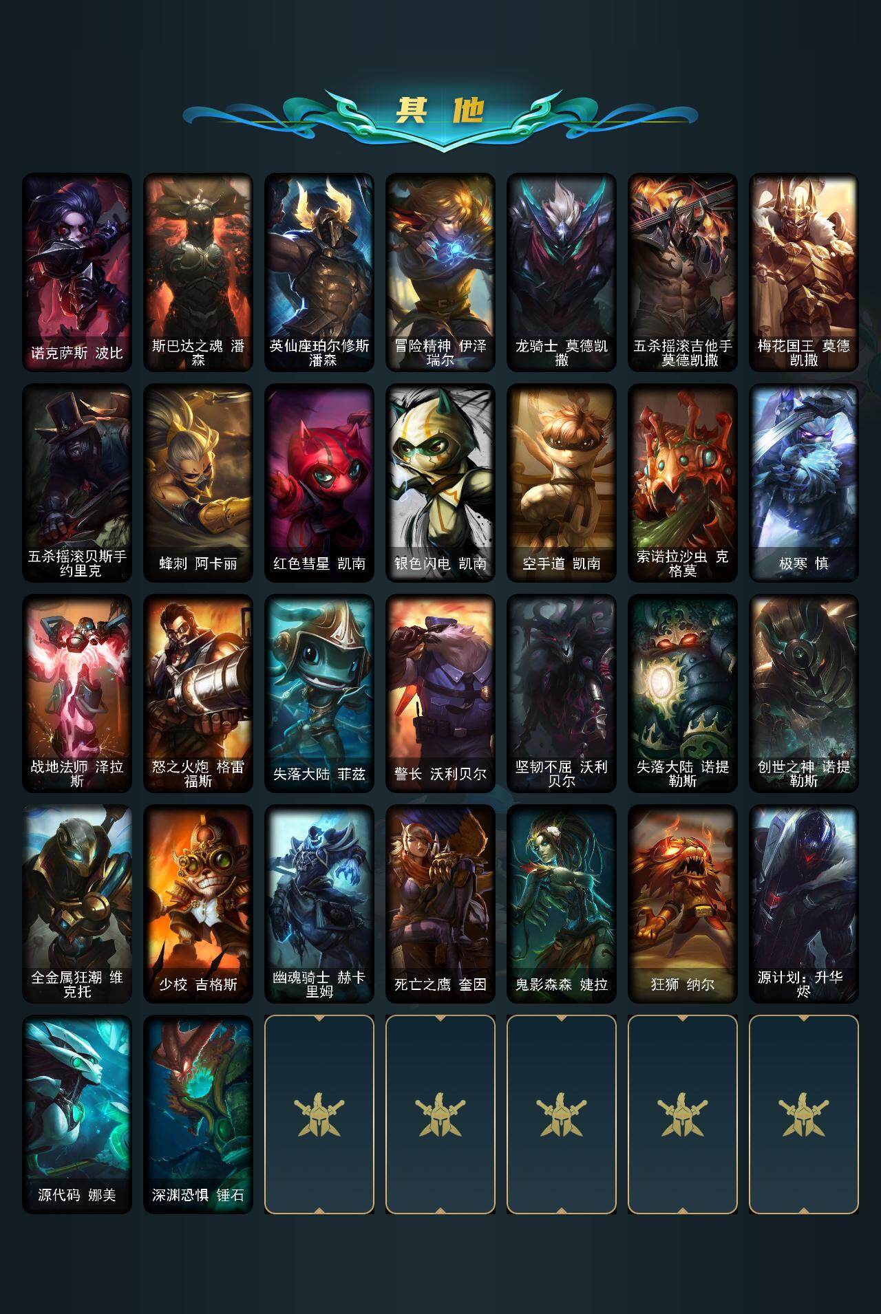 【其他皮肤1】:黑暗骑士奥拉夫,幽蓝梦魇加里奥,皇家守卫赵信,潮流女王乐芙兰,社会名流乐芙兰,弗拉基米尔伯爵,末世天使凯尔,荒野镖客阿利斯塔,后场堡垒阿利斯塔,哞利斯塔,部落精神瑞兹,宗师级法师训练师瑞兹,原野伐木工赛恩,森林女神索拉卡,游击队员崔丝塔娜,约德尔海贼团崔丝塔娜,脏兮兮努努和威朗普,