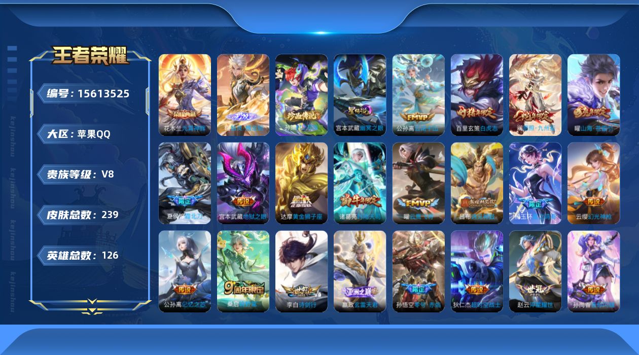 [15613525]苹果Q-V8-126英雄-239皮肤-1典藏皮肤-1无双-1珍品传说-21传说-65史诗-1星元