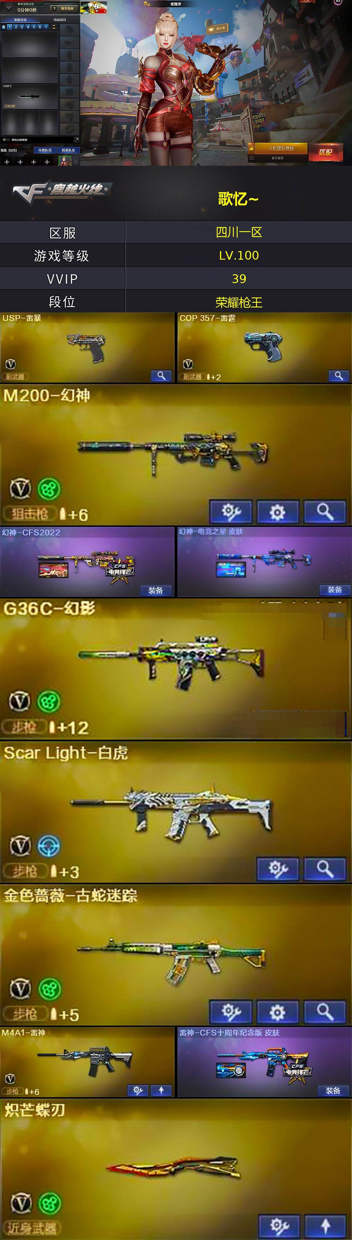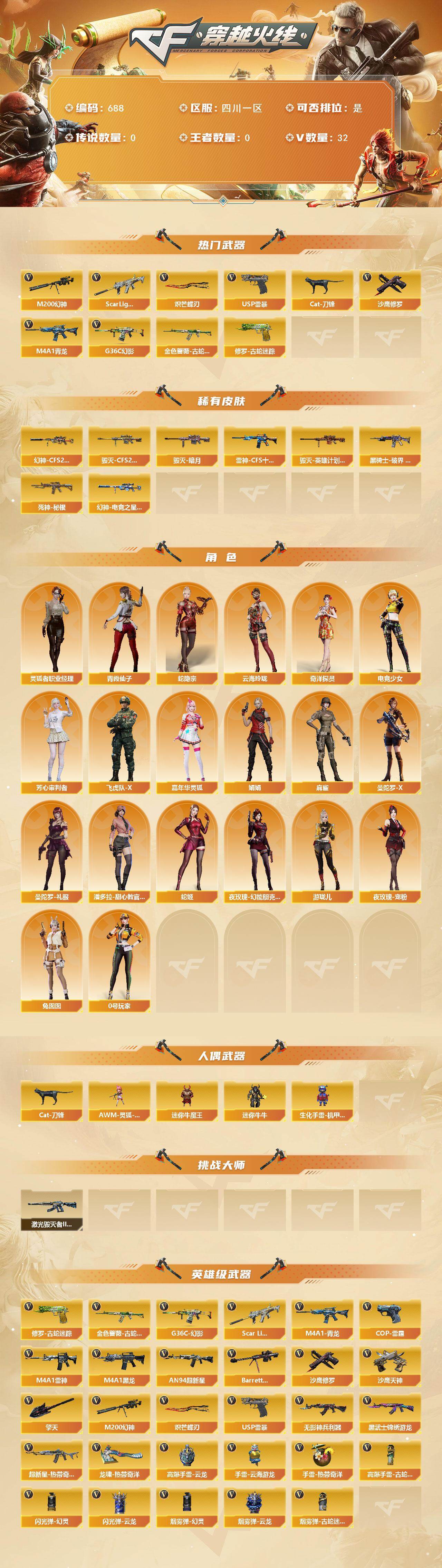 [15358902]四川一区-32V-0王者-0炫金 【热门武器】:G36C-幻影,Scar Light-白虎,M4A1-青龙,M200-幻神,金色蔷薇-古蛇迷踪,修罗-古蛇迷踪,Cat-刀锋,USP-雷暴,沙鹰-修罗,炽芒蝶刃 【皮肤】:幻神-CFS2022,幻神-电竞之星 皮肤,雷神-CFS十周年纪念版 皮肤,毁灭-暗月,毁灭-CFS2020,毁灭-英雄计划 皮肤,黑骑士-破界 皮肤,死神-秘银 【角色】:蛇隐宗,奇洋探员,云海玲珑,电竞少女,芳心审判者,飞虎队-X,嘉年华灵狐,娟娟,0号玩家,灵狐者-职业经理,麻雀,曼陀罗-X,曼陀罗-礼服,潘多拉-甜心教官,青霞仙子,蛇姬,兔囡囡,夜玫瑰-幻能朋克,夜玫瑰-宠粉,游珑儿 【人偶武器】:AWM-灵狐-15周年嘉年华,Cat-刀锋,迷你牛魔王,迷你牛牛,生化手雷-机甲核心*3 【挑战大师】:激光毁灭者III-白马银枪 【英雄级武器】:M4A1-黑龙,M4A1-雷神,AN94-超新星,M4A1-青龙,Scar Light-白虎,无影-神兵利器*2,G36C-幻影,黑武士-锦绣游龙,超新星-热带奇洋,金色蔷薇-古蛇迷踪,Barrett-毁灭,M200-幻神,沙鹰-修罗,沙鹰-天神,USP-雷暴,COP-雷霆,修罗-古蛇迷踪,擎天,炽芒蝶刃,龙啸-热带奇洋,高爆手雷-云龙*2,手雷-云海游龙,手雷-热带奇洋,高爆手雷-古蛇迷踪,闪光弹-幻灵,闪光弹-云龙,烟雾弹-幻灵*2,烟雾弹-云龙*2,烟雾弹-古蛇迷踪 【道具】:亚洲杯纪念炫彩背包,古蛇迷踪炫彩背包,奇洋探员-海龟背包,热带奇洋炫彩背包,超级背包,妩媚妖姬,绿色巨人,灵魂忍者*2,变异宝贝,迷雾幽灵,生化弹匣,夺命之镰,防化服,金色流光-枪王排位*2,星辰流光-枪王排位,巅峰赛先锋-金色流光,枪王排位28赛季金色流光,枪王排位29赛季金色流光,古蛇迷踪打击特效,蛇隐宗表情,热带奇洋表情,斯沃特表情,C4-黑曜,防弹头盔*2,防弹衣*2,C4工具钳*2,手雷包*2 【特殊枪械】:1白虎
