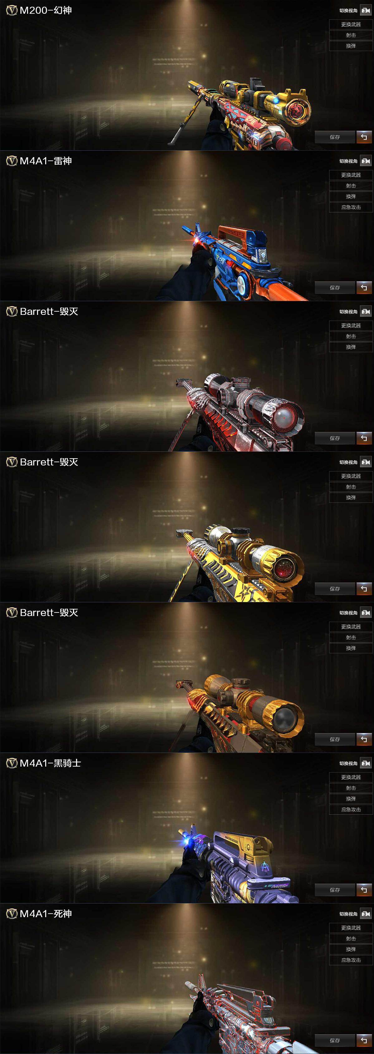 【热门武器】:G36C-幻影,Scar Light-白虎,M4A1-青龙,M200-幻神,金色蔷薇-古蛇迷踪,修罗-古蛇迷踪,Cat-刀锋,USP-雷暴,沙鹰-修罗,炽芒蝶刃