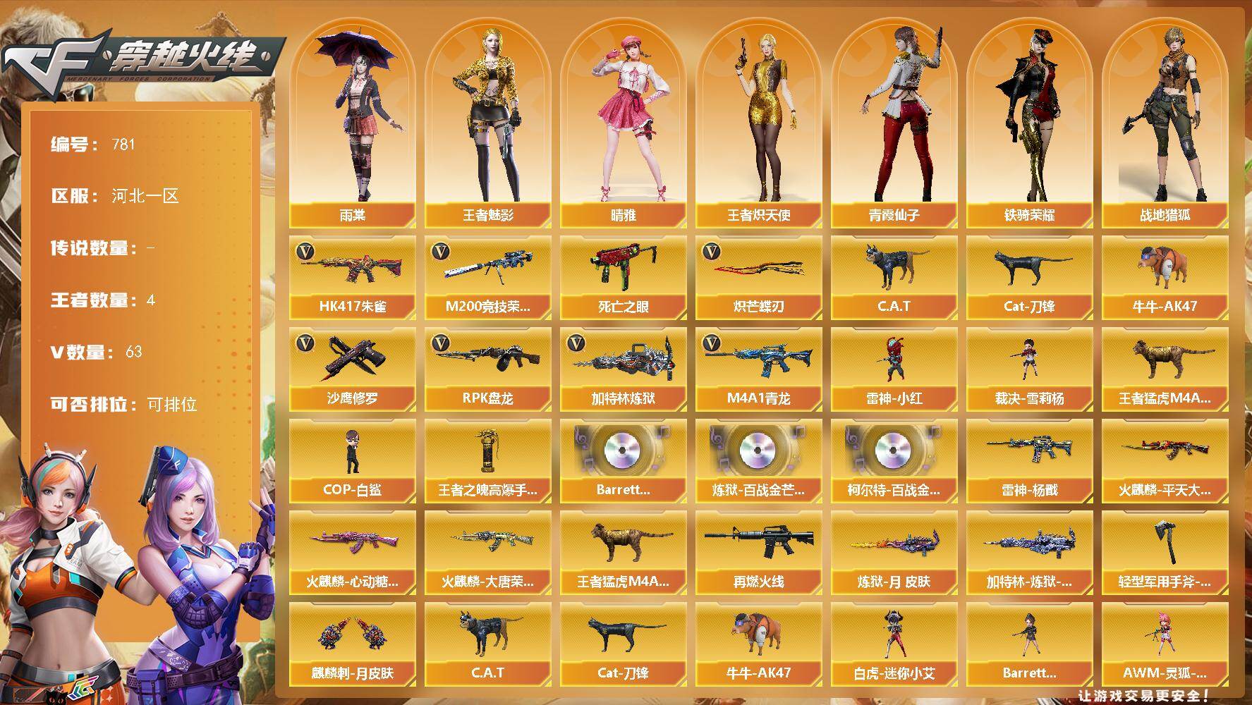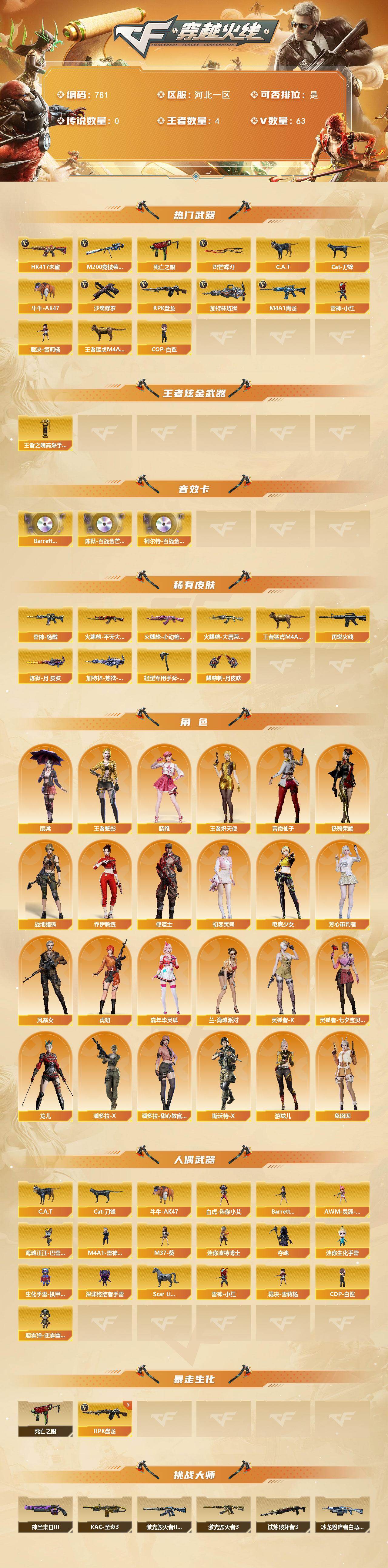 [15527763]河北一区-63V-4王者-0炫金 【热门武器】:HK417-朱雀,M4A1-青龙,M200-竞技荣光,死亡之眼*2,C.A.T,Cat-刀锋,牛牛-AK47,RPK-盘龙*5,加特林-炼狱,雷神-小红,裁决-雪莉杨,王者猛虎M4A1,COP-白鲨,沙鹰-修罗,炽芒蝶刃*2 【王者炫金武器】:王者之魄高爆手雷 【音效卡】:Barrett-碧霄极光音效卡*6,炼狱-百战金芒-庆典舞曲音效卡,柯尔特-百战金芒-庆典舞曲音效卡 【皮肤】:雷神-杨戬,王者猛虎M4A1,M4A1-再燃火线,火麒麟-平天大圣,火麒麟-大唐荣光,火麒麟-心动糖果,炼狱-月 皮肤,加特林-炼狱-钟馗皮肤,轻型军用手斧-再燃火线,麒麟刺-月皮肤 【角色】:雨棠,晴雅,战地猎狐,王者-魅影,王者炽天使,乔伊教练,修道士,初恋灵狐,电竞少女,芳心审判者,风暴女,虎妞,嘉年华灵狐,兰-海滩派对,灵狐者-X,灵狐者-七夕宝贝,龙儿,潘多拉-X,潘多拉-甜心教官,青霞仙子,斯沃特-X,铁骑荣耀,兔囡囡,游珑儿 【人偶武器】:雷神-小红,COP-白鲨,裁决-雪莉杨,白虎-迷你小艾,M4A1-雷神-精英刀锋,Scar Light-马枪,AWM-灵狐-15周年嘉年华,海滩汪汪-巴雷特,M37-葵,C.A.T,Cat-刀锋,牛牛-AK47,迷你波特博士*3,夺魂,迷你生化手雷,生化手雷-机甲核心,深渊终结者手雷,Barrett-夜玫瑰,烟雾弹-迷雾幽灵 【暴走生化】:死亡之眼*2 【挑战大师】:冰龙粉碎者-白马银枪,激光毁灭者III-白马银枪,激光毁灭者III,试炼破坏者III,KAC-圣炎切割者III,神圣爆裂者-末日III 【英雄级武器】:M4A1-千变,AK47-火麒麟,AN94-超新星,AK47-黑鲨,M4A1-龙血,M4A1-青龙,HK417-朱雀,M4A1-神工天巧,无影-神兵利器,黑武士-锦绣游龙*2,烈火-动感闪耀,M200-竞技荣光,王者之光-觉醒版,RPK-盘龙*5,加特林-炼狱,炼狱-百战金芒,炼狱-悦蓝-觉醒版,沙鹰-修罗,沙鹰-天神,USP-神工天巧,天神-动感闪耀,麒麟刺,擎天-竞技荣光,炽芒蝶刃*2,唐刀-神工天巧*2,屠龙-动感闪耀,麒麟刺-百战金芒,高爆手雷-竞技荣光,高爆手雷-神工天巧*4,手雷-动感闪耀,闪光弹-竞技荣光,闪光弹-神工天巧*5,烟雾弹-竞技荣光,烟雾弹-神工天巧*