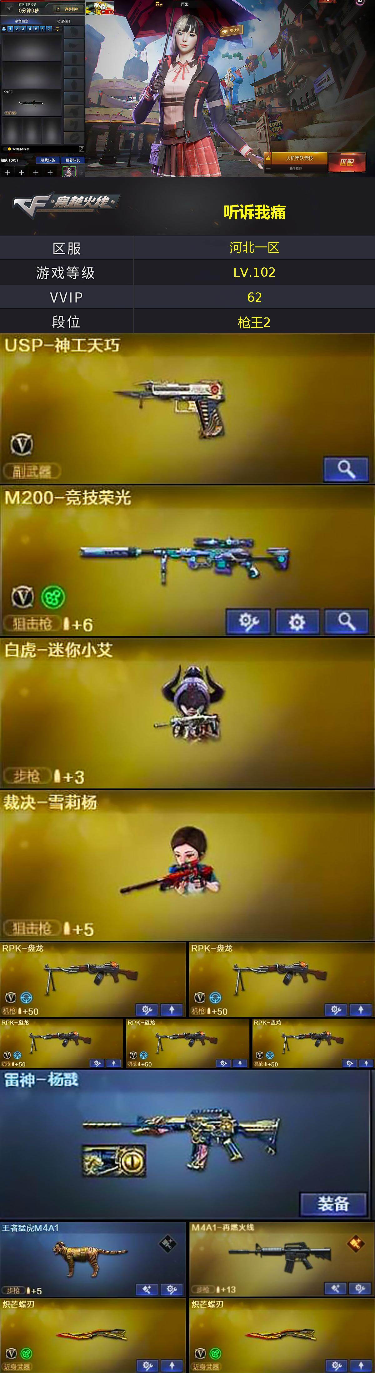 【热门武器】:HK417-朱雀,M4A1-青龙,M200-竞技荣光,死亡之眼*2,C.A.T,Cat-刀锋,牛牛-AK47,RPK-盘龙*5,加特林-炼狱,雷神-小红,裁决-雪莉杨,王者猛虎M4A1,COP-白鲨,沙鹰-修罗,炽芒蝶刃*2