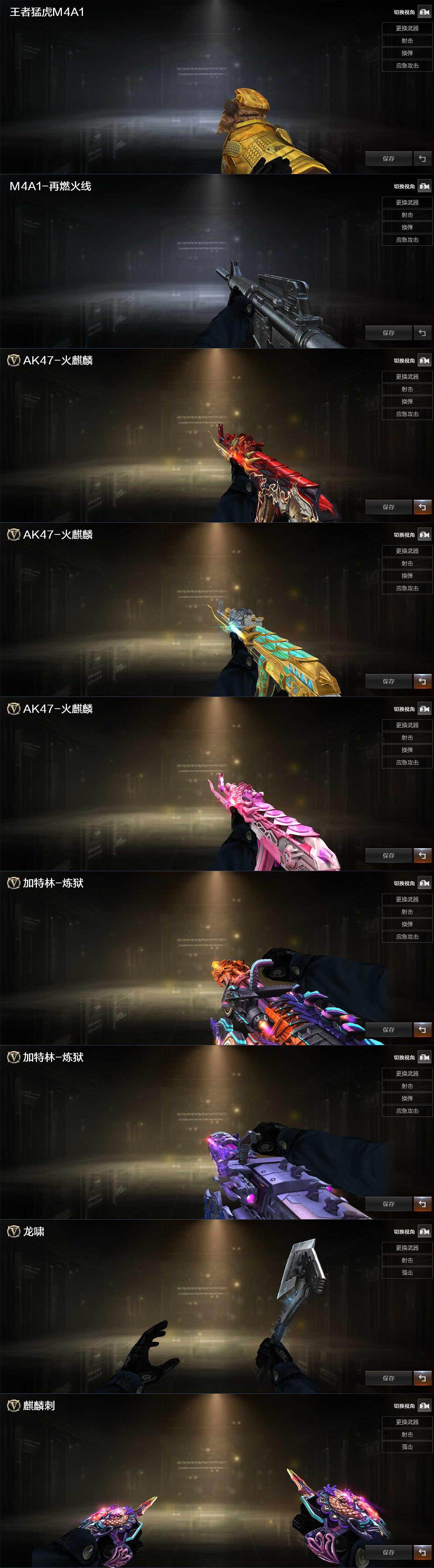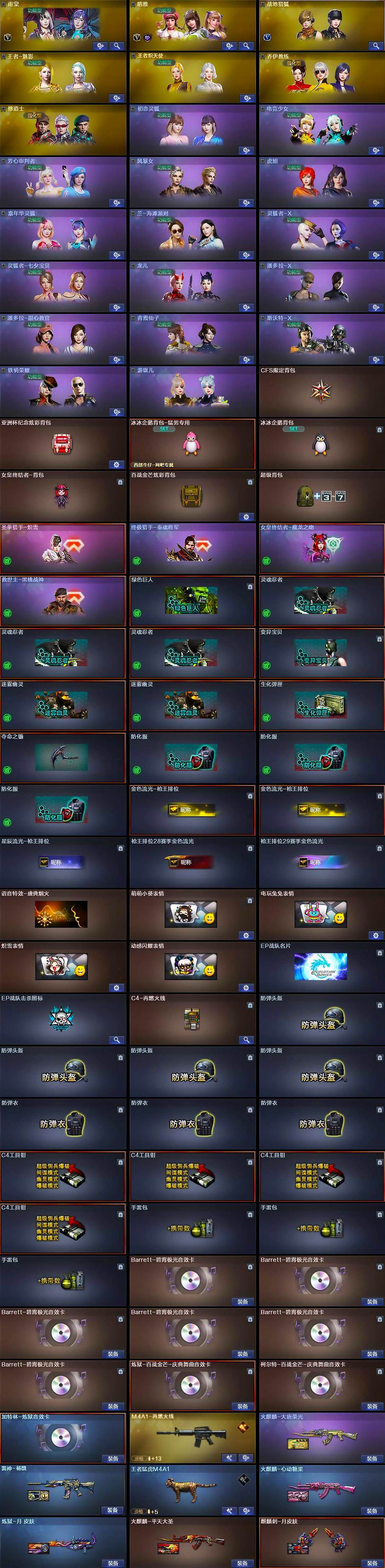 【英雄级武器】:M4A1-千变,AK47-火麒麟,AN94-超新星,AK47-黑鲨,M4A1-龙血,M4A1-青龙,HK417-朱雀,M4A1-神工天巧,无影-神兵利器,黑武士-锦绣游龙*2,烈火-动感闪耀,M200-竞技荣光,王者之光-觉醒版,RPK-盘龙*5,加特林-炼狱,炼狱-百战金芒,炼狱-悦蓝-觉醒版,沙鹰-修罗,沙鹰-天神,USP-神工天巧,天神-动感闪耀,麒麟刺,擎天-竞技荣光,炽芒蝶刃*2,唐刀-神工天巧*2,屠龙-动感闪耀,麒麟刺-百战金芒,高爆手雷-竞技荣光,高爆手雷-神工天巧*4,手雷-动感闪耀,闪光弹-竞技荣光,闪光弹-神工天巧*5,烟雾弹-竞技荣光,烟雾弹-神工天巧*