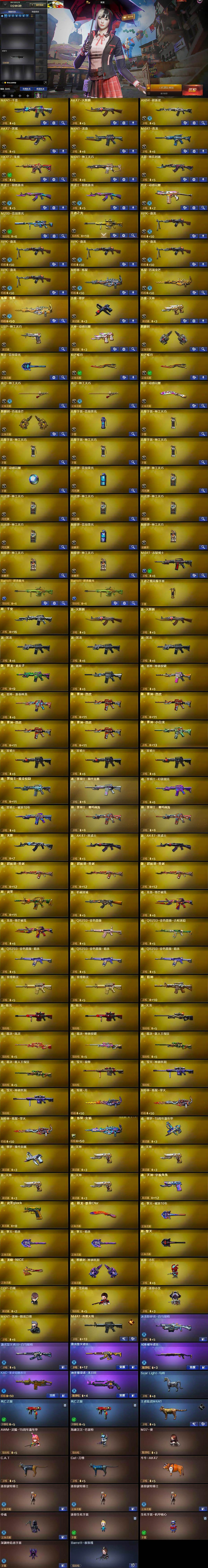 【人偶武器】:雷神-小红,COP-白鲨,裁决-雪莉杨,白虎-迷你小艾,M4A1-雷神-精英刀锋,Scar Light-马枪,AWM-灵狐-15周年嘉年华,海滩汪汪-巴雷特,M37-葵,C.A.T,Cat-刀锋,牛牛-AK47,迷你波特博士*3,夺魂,迷你生化手雷,生化手雷-机甲核心,深渊终结者手雷,Barrett-夜玫瑰,烟雾弹-迷雾幽灵